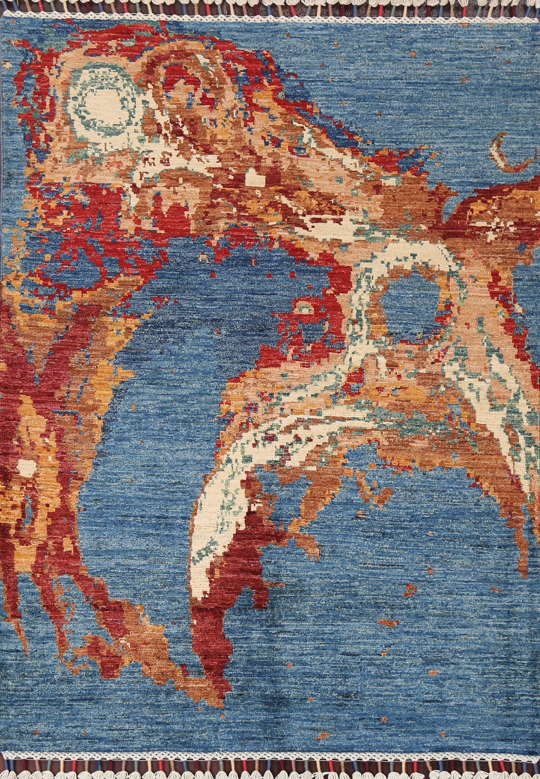Vegetable Dye Blue Abstract Handmade Wool Rug 4x5