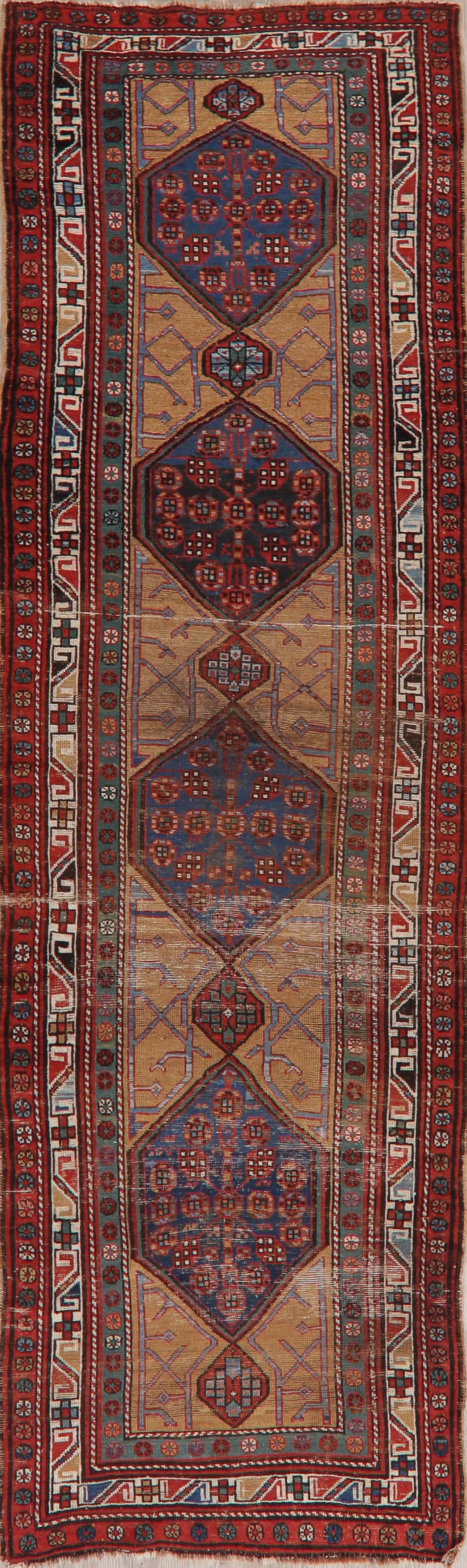 Pre-1900 Antique Vegetable Dye Kazak Runner Rug 3x7