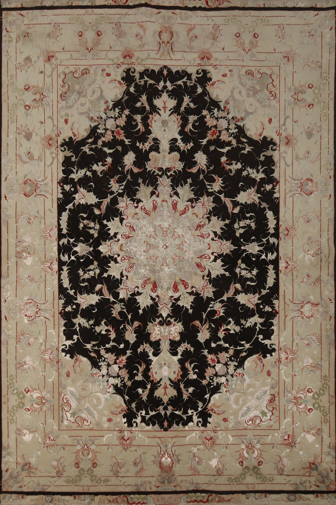 Vegetable Dye Black Silk Floral Tabriz Persian Rug 5x7
