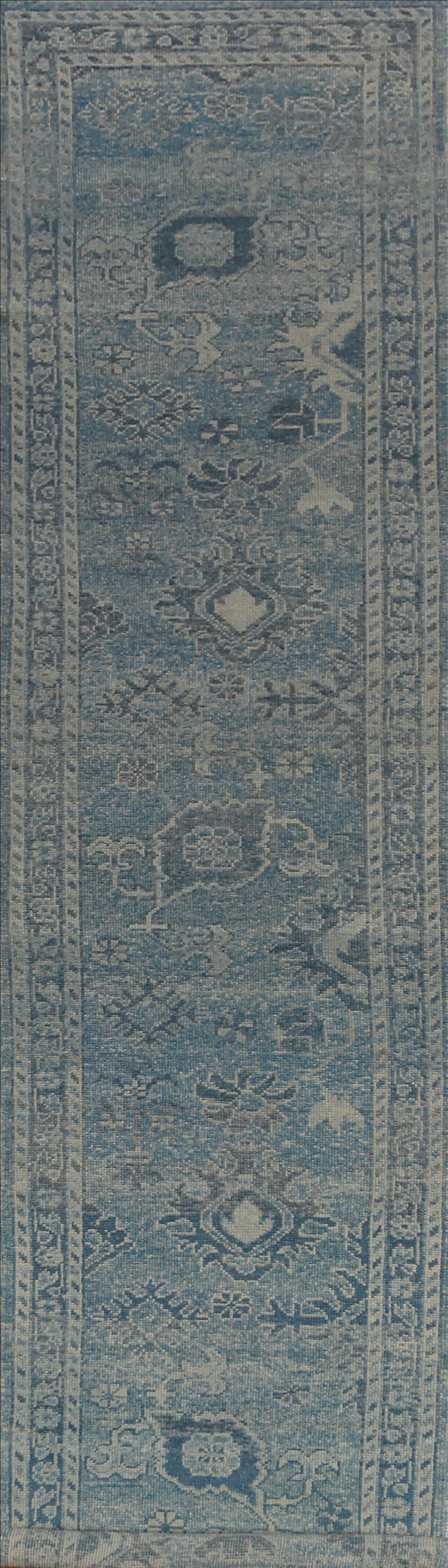 Light Blue Floral Oushak Vegetable Dye Runner Rug 3x17