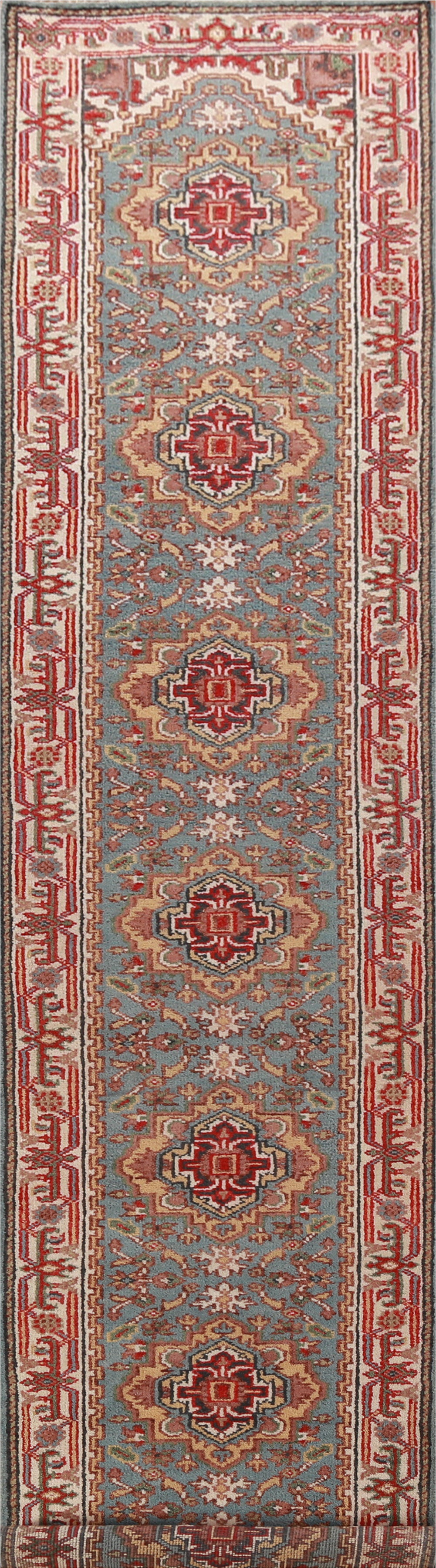 Light Blue Geometric Heriz Serapi Indian Runner Rug 3x16