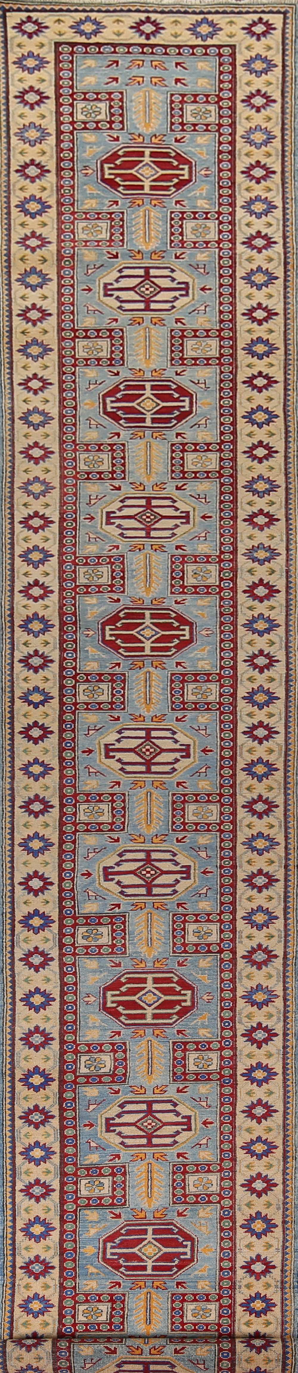 Light Blue Geometric Kazak Oriental Runner Rug 3x21