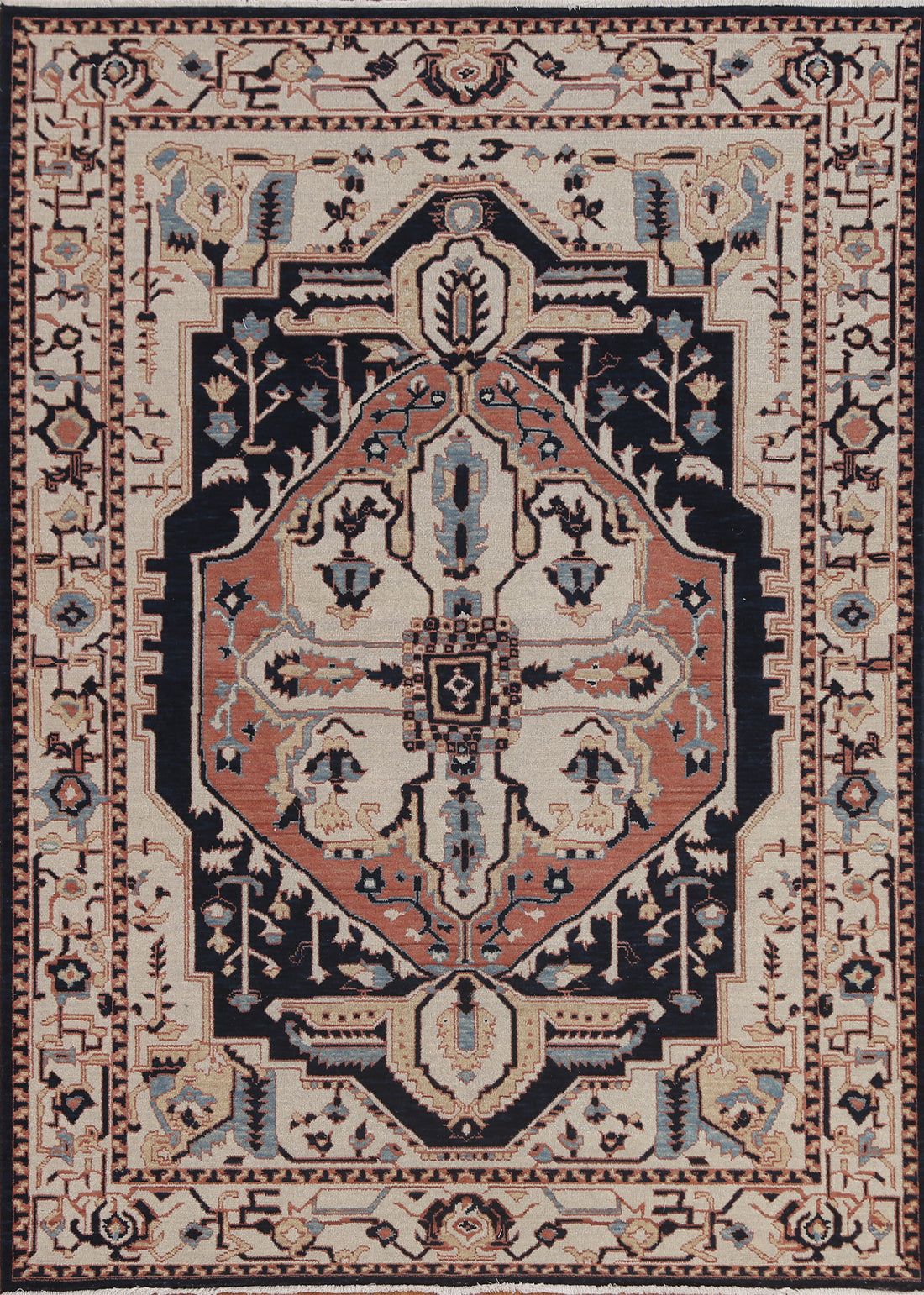 Navy Blue Floral Heriz Serapi Turkish Area Rug 7x10