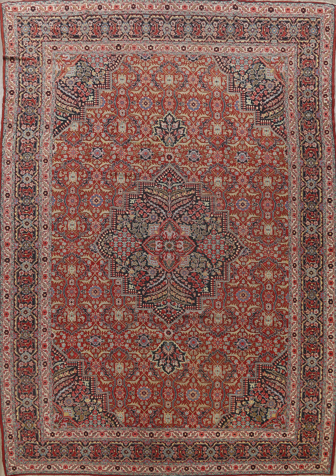Pre-1900 Antique Geometric Vegetable Dye Authentic Tabriz Haji Jalili Persian Orange/Navy Blue 13x16 Rug