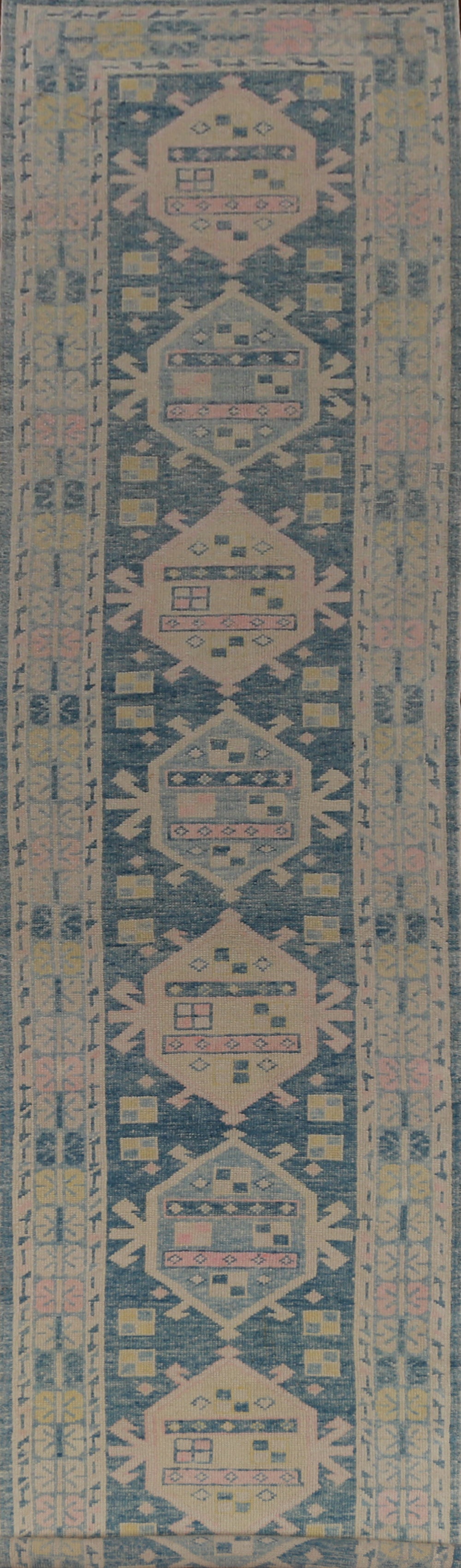 Blue Geometric Oushak Vegetable Dye Runner Rug 3x17