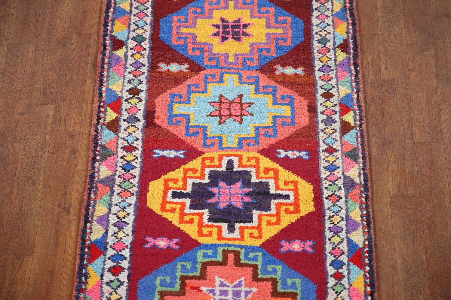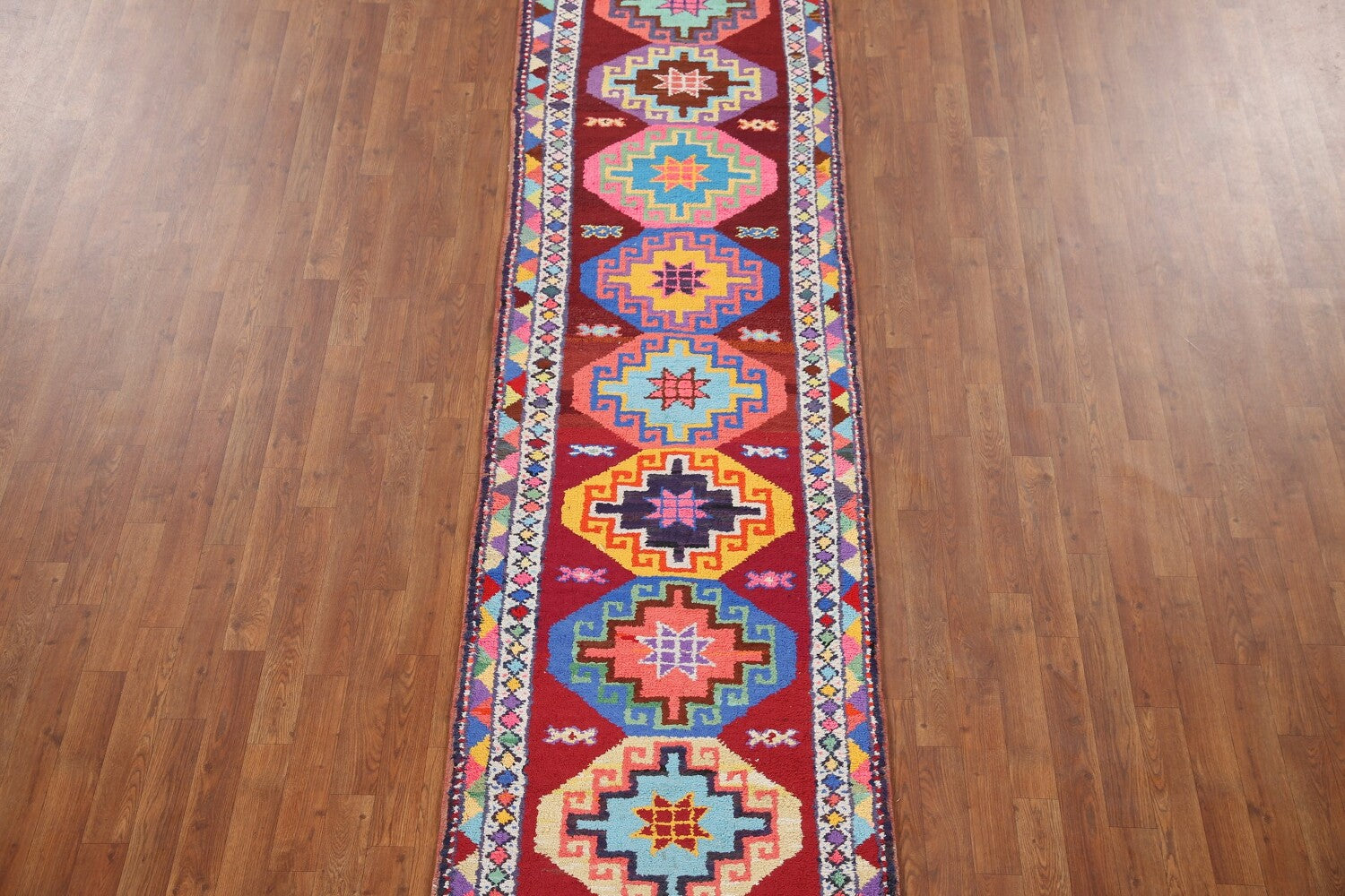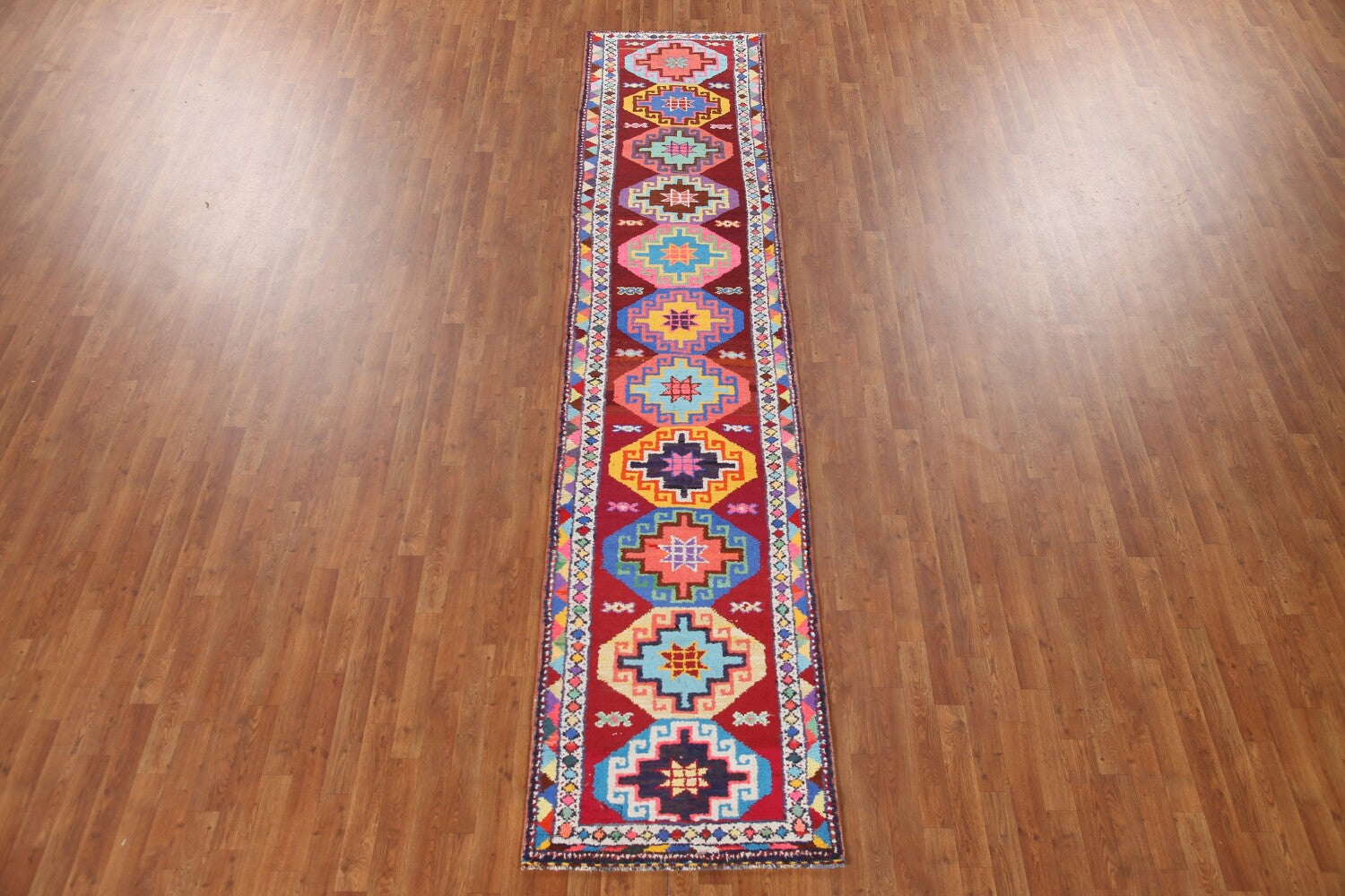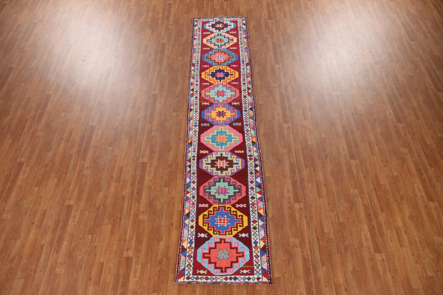 A Beautiful Genuine Turkey Anatolian rug is Hand Knotted by skillful weavers in Turkey with 100% Silk Material. This rug is in New, First Quality condition. dimensions are 12' 8'' X 2' 8'' in foot and 386 X 81 in centimeter. the primary color is Red.
