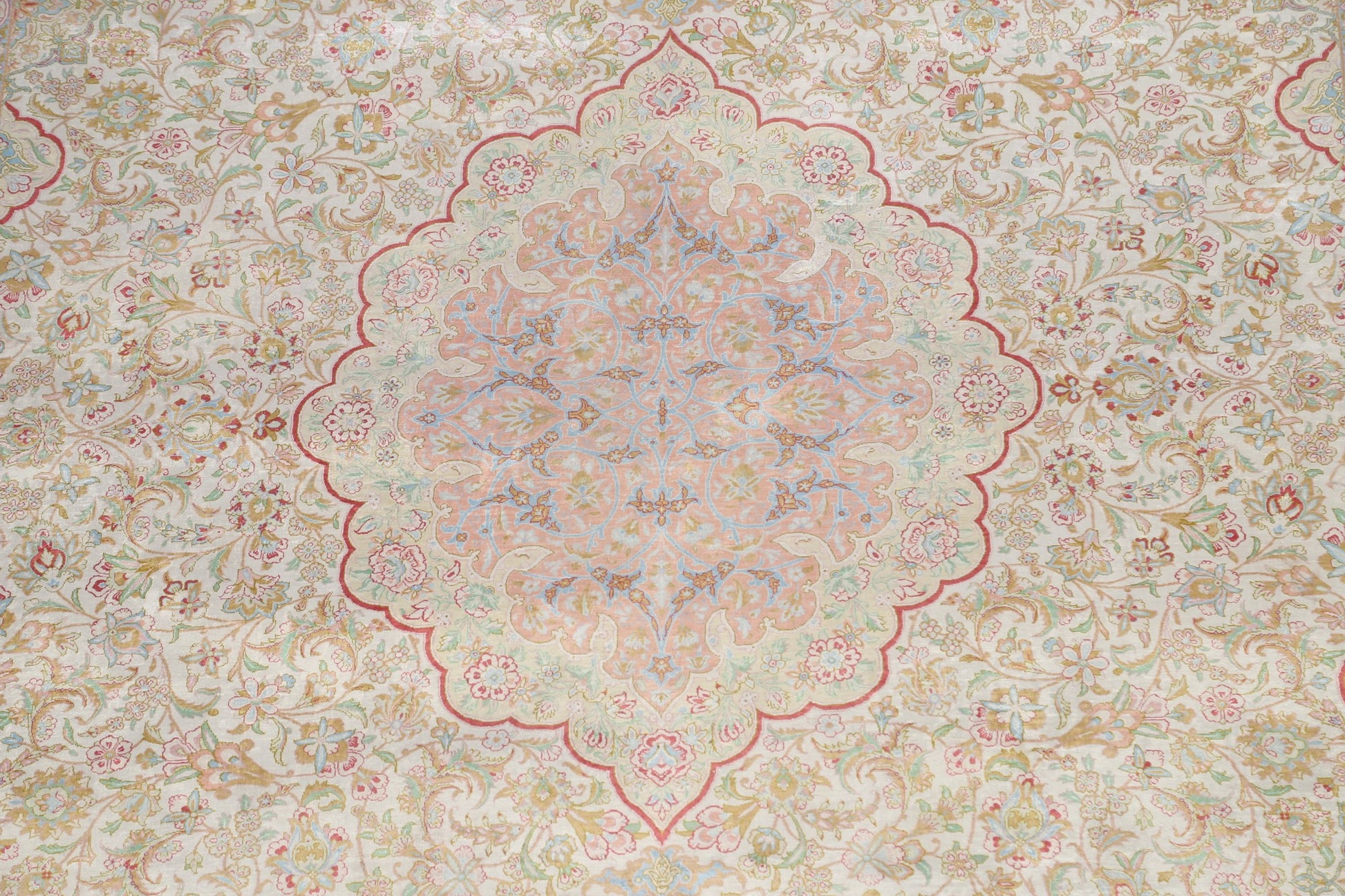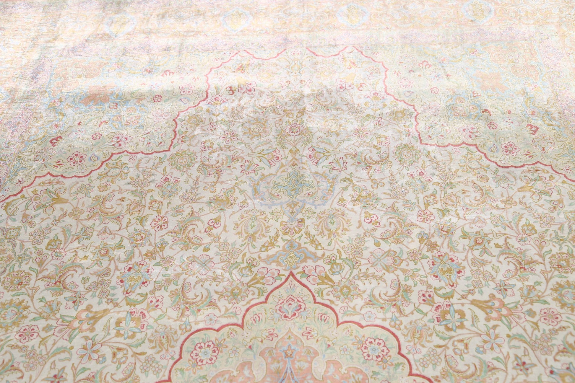 A Beautiful Genuine Persia ( Persia ) Qum rug is Hand Knotted by skillful weavers in Persia ( Persia ) with 100% Silk Material. This rug is in Very Good condition. dimensions are 10' 0'' X 6' 5'' in foot and 305 X 196 in centimeter. the primary color is Beige & Ivories.