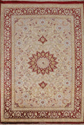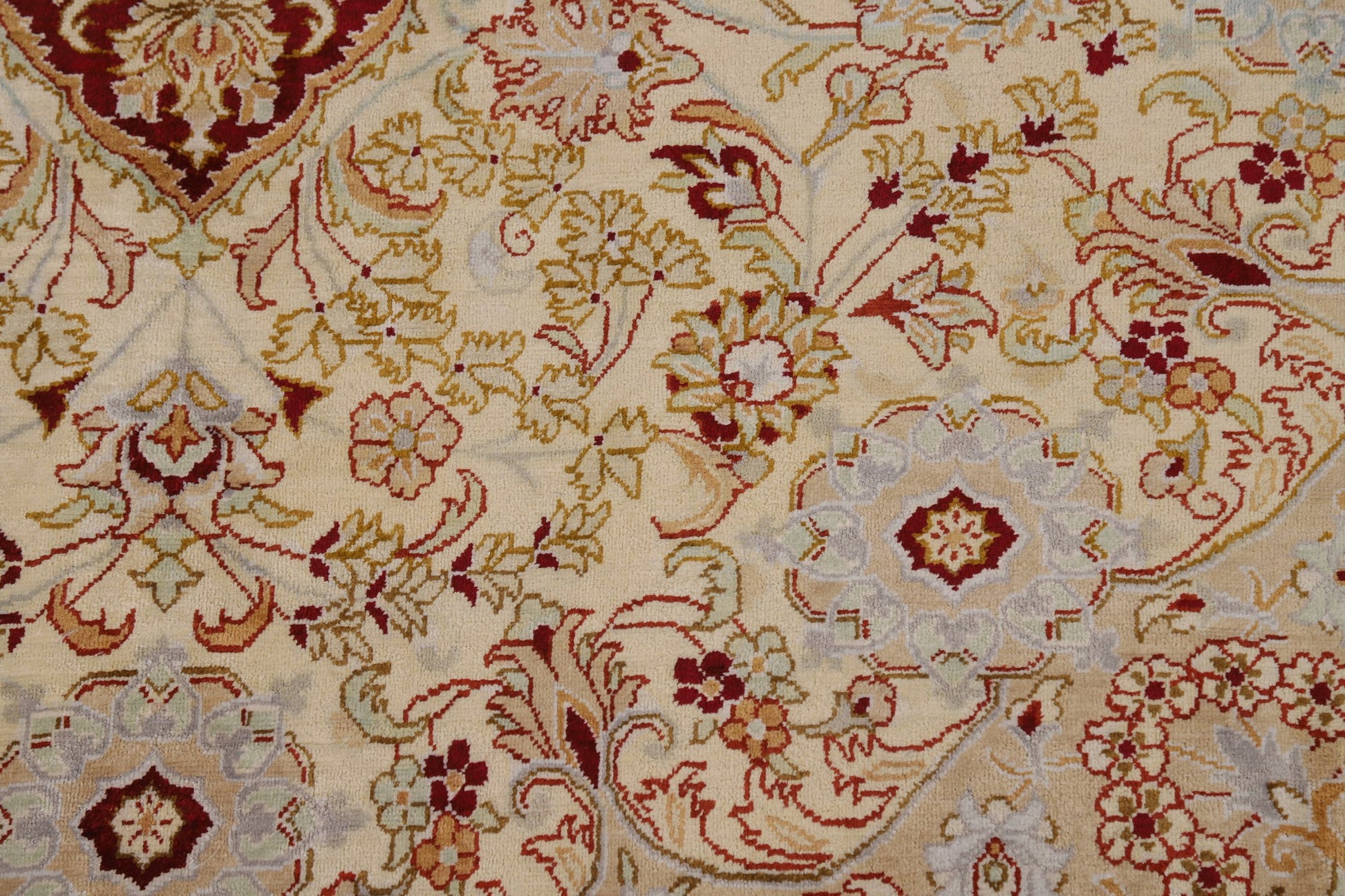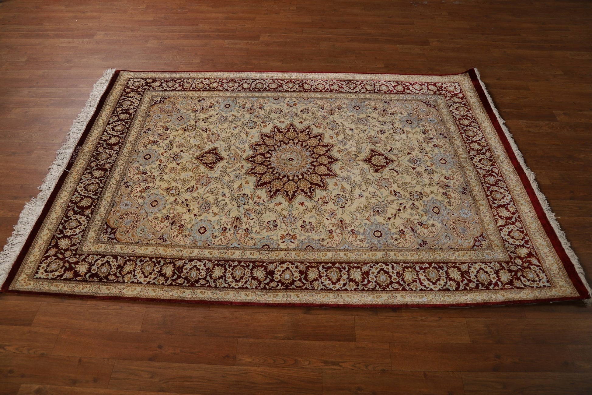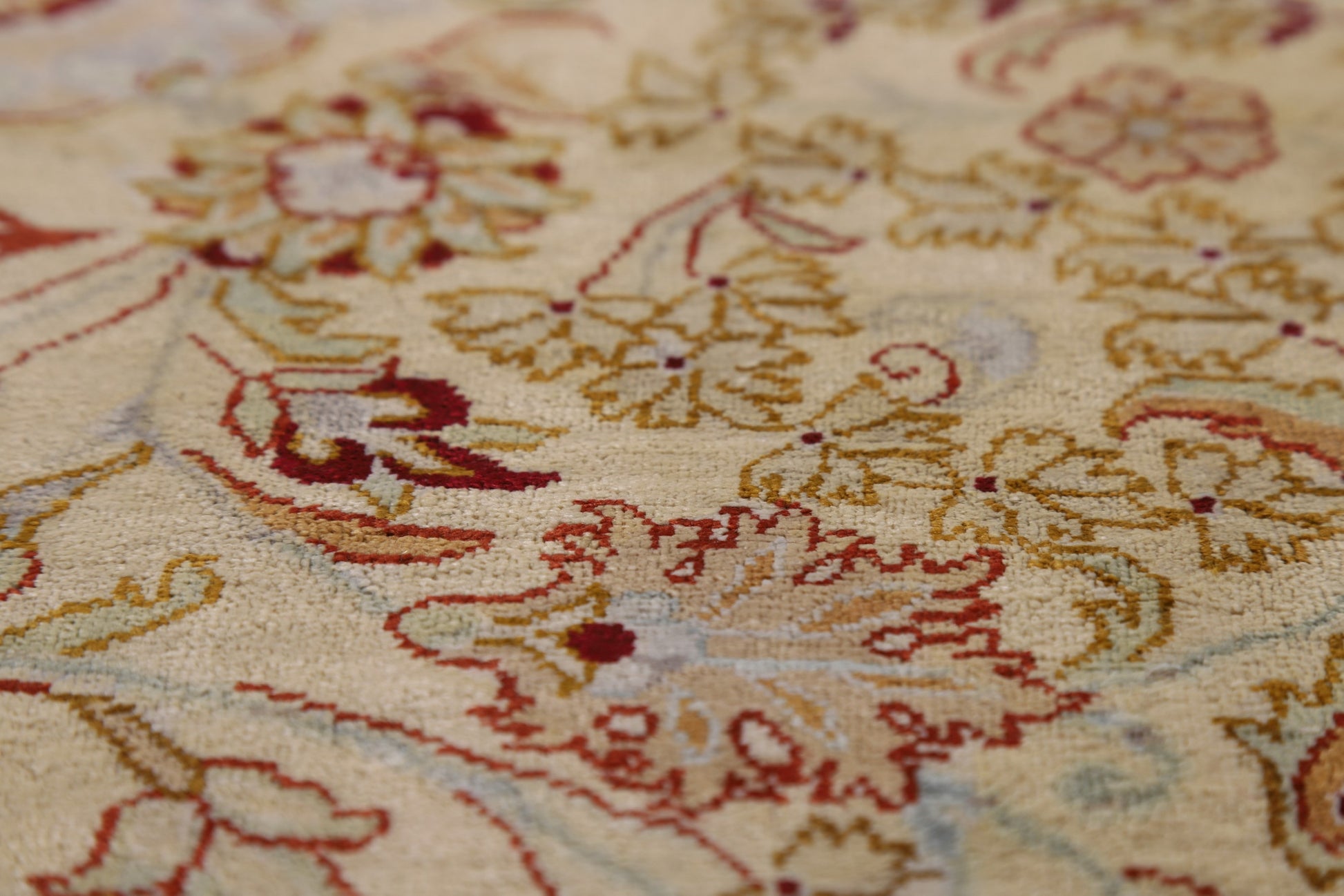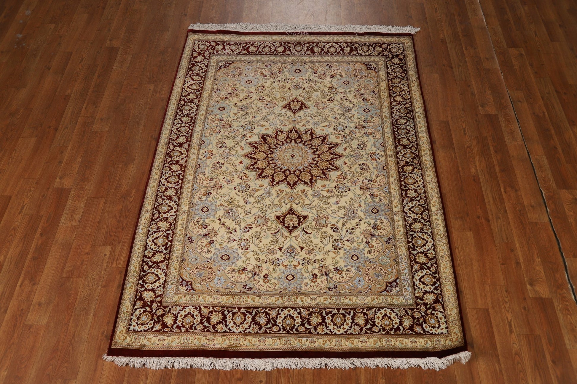 A Beautiful Genuine Persia ( Persia ) Qum rug is Hand Knotted by skillful weavers in Persia ( Persia ) with Silk Material. This rug is in New, First Quality condition. dimensions are 6' 3'' X 4' 4'' in foot and 191 X 132 in centimeter. the primary color is Beige & Ivories.