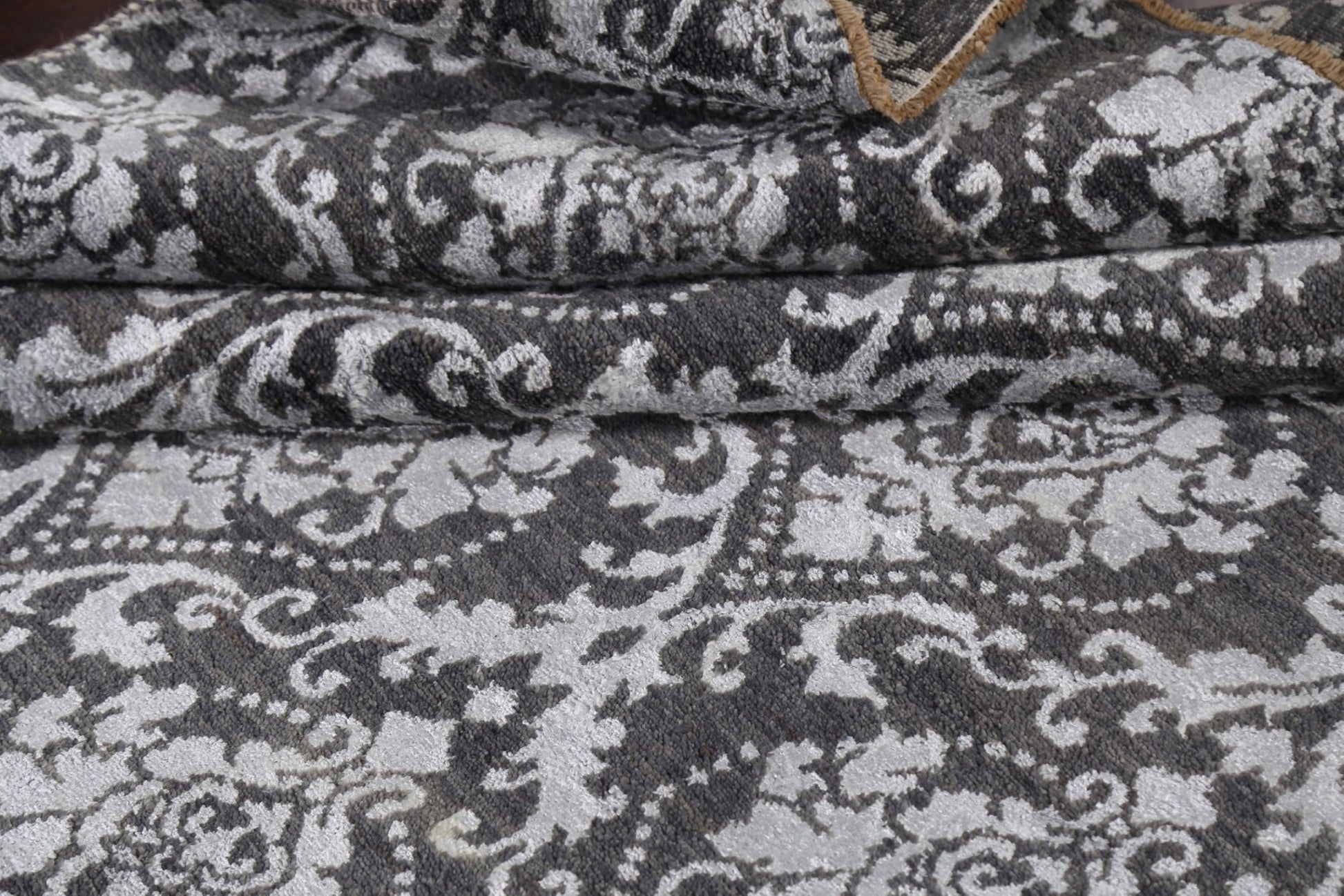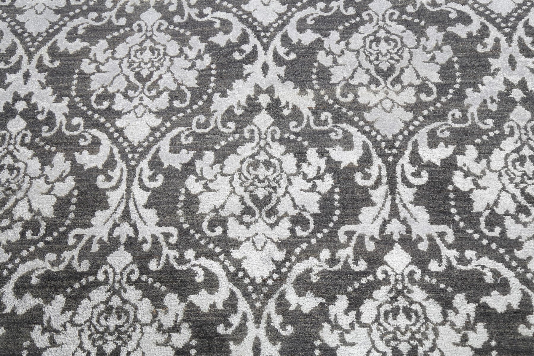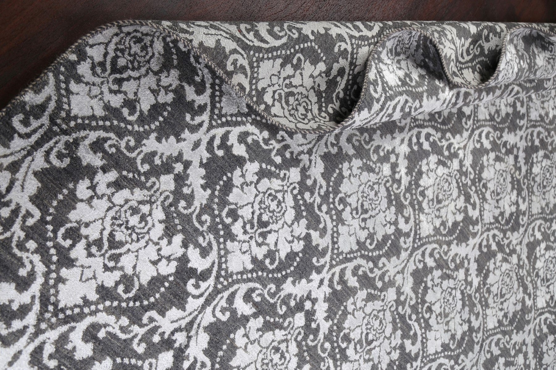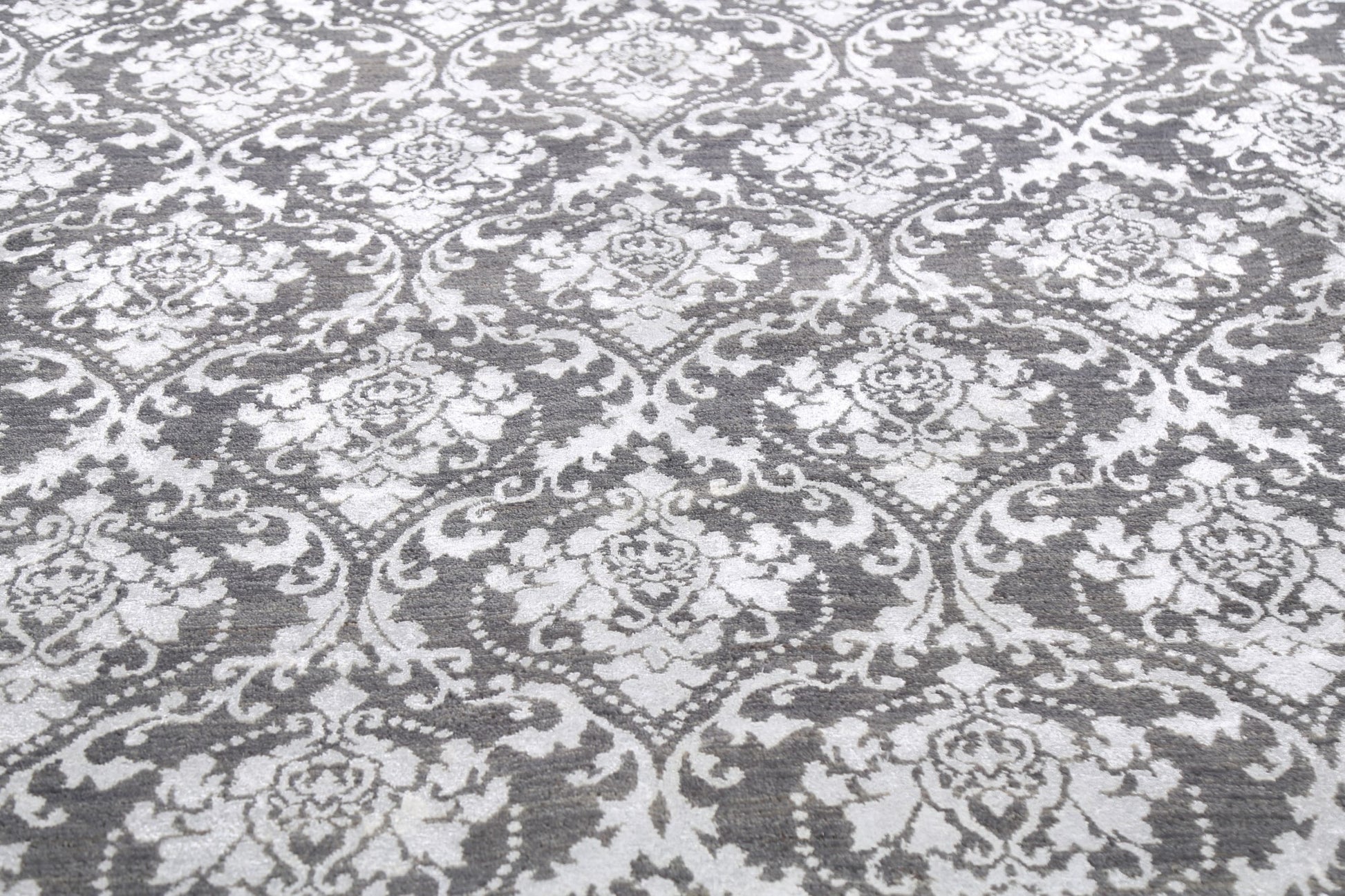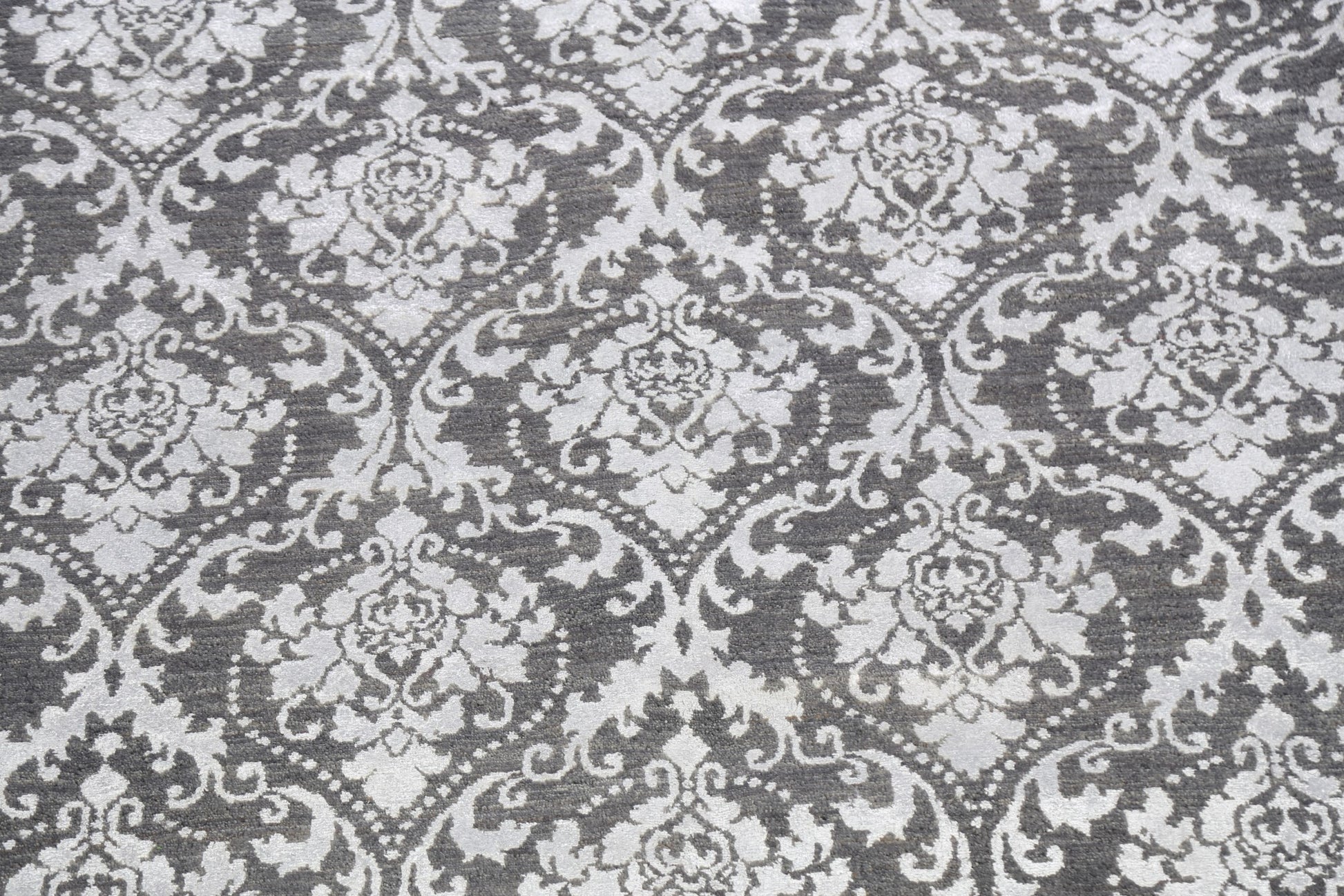 A Beautiful Genuine Pakistan Versace rug is Hand Knotted by skillful weavers in Pakistan with Wool & Silk Material. This rug is in New, First Quality condition. dimensions are 12' 4'' X 9' 1'' in foot and 376 X 277 in centimeter. the primary color is Greys & Charcoal.