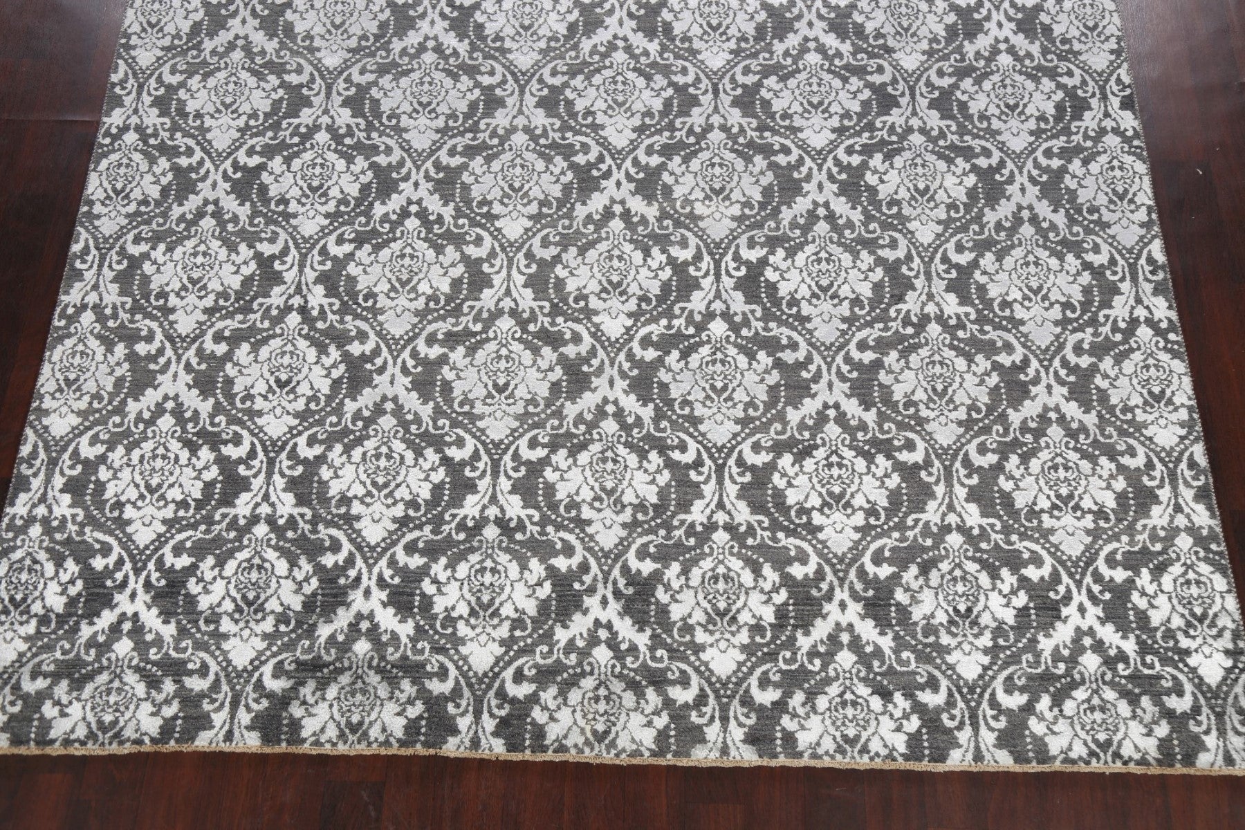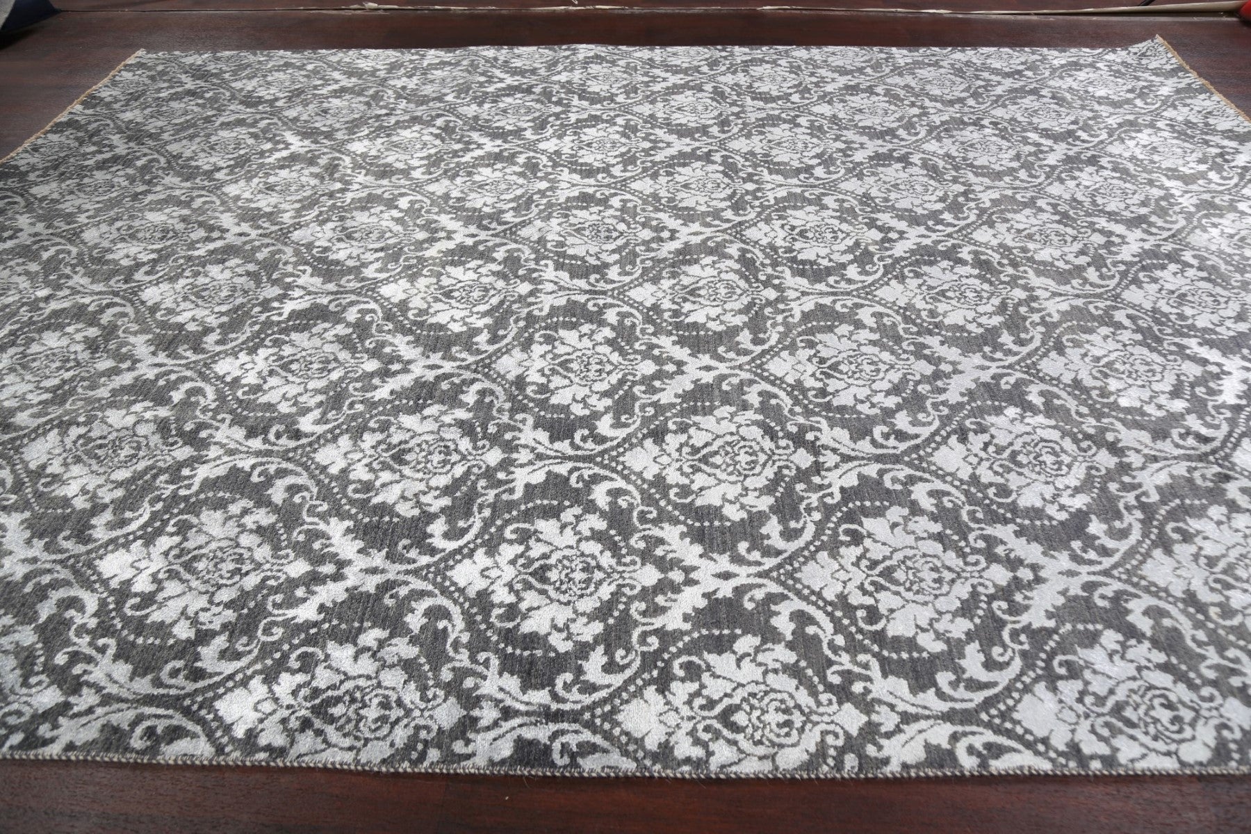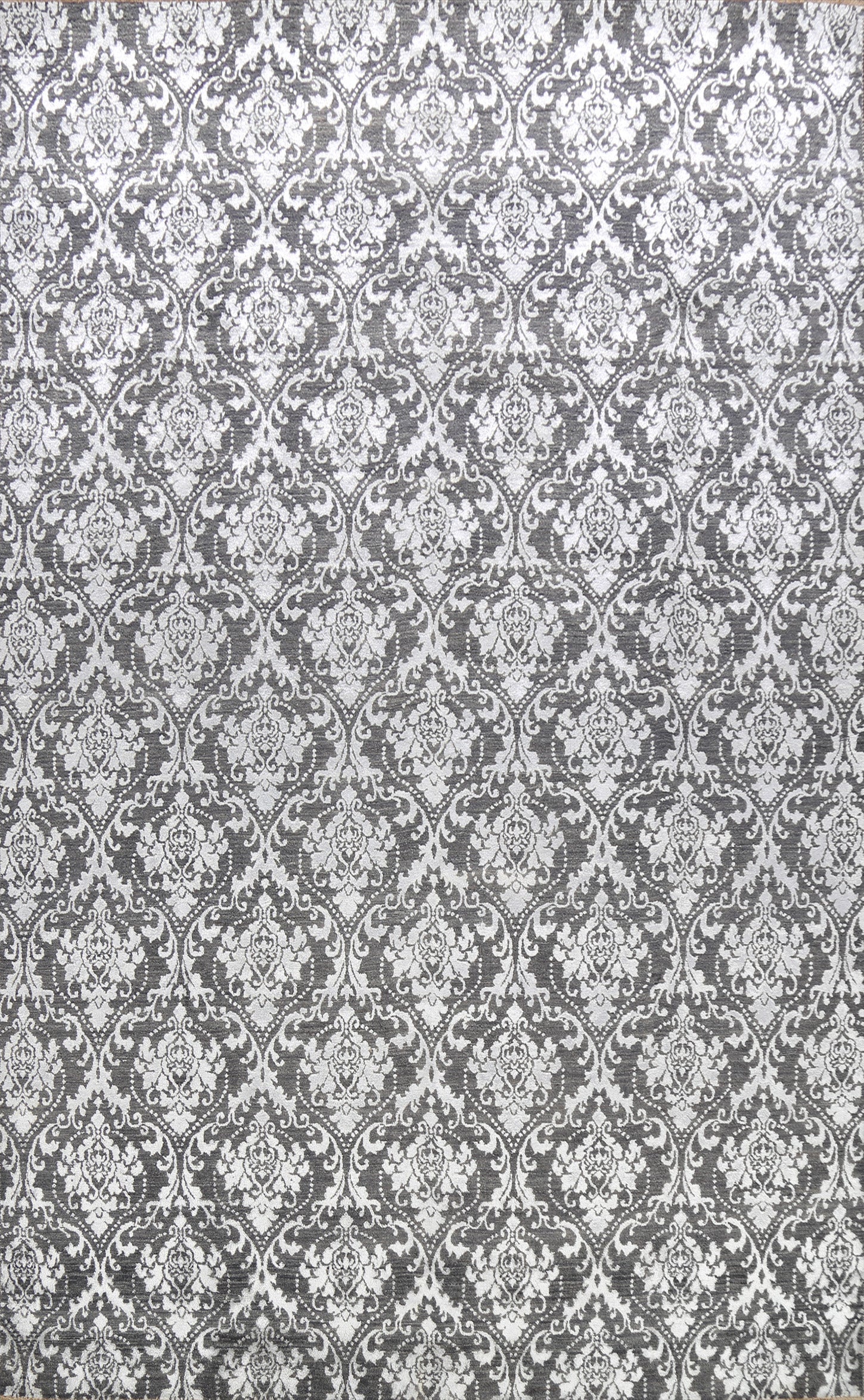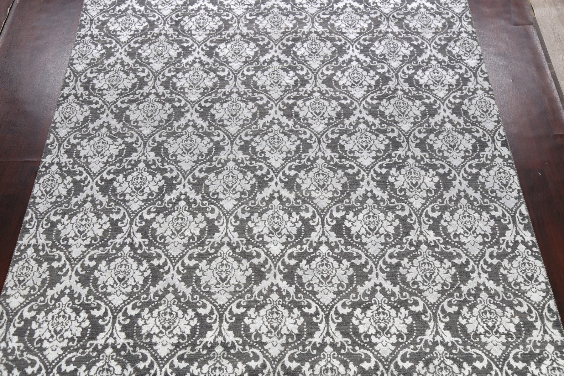 A Beautiful Genuine Pakistan Versace rug is Hand Knotted by skillful weavers in Pakistan with Wool & Silk Material. This rug is in New, First Quality condition. dimensions are 12' 4'' X 9' 1'' in foot and 376 X 277 in centimeter. the primary color is Greys & Charcoal.