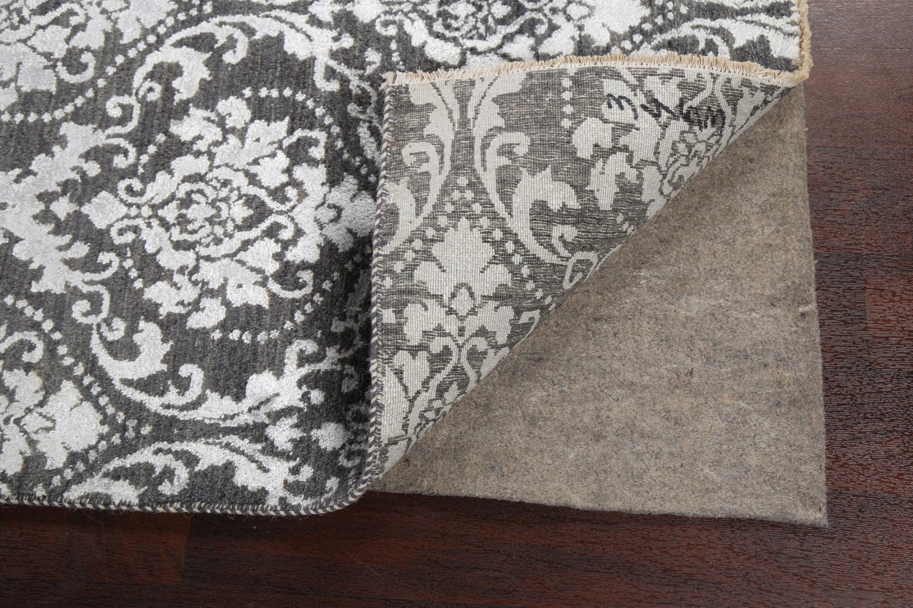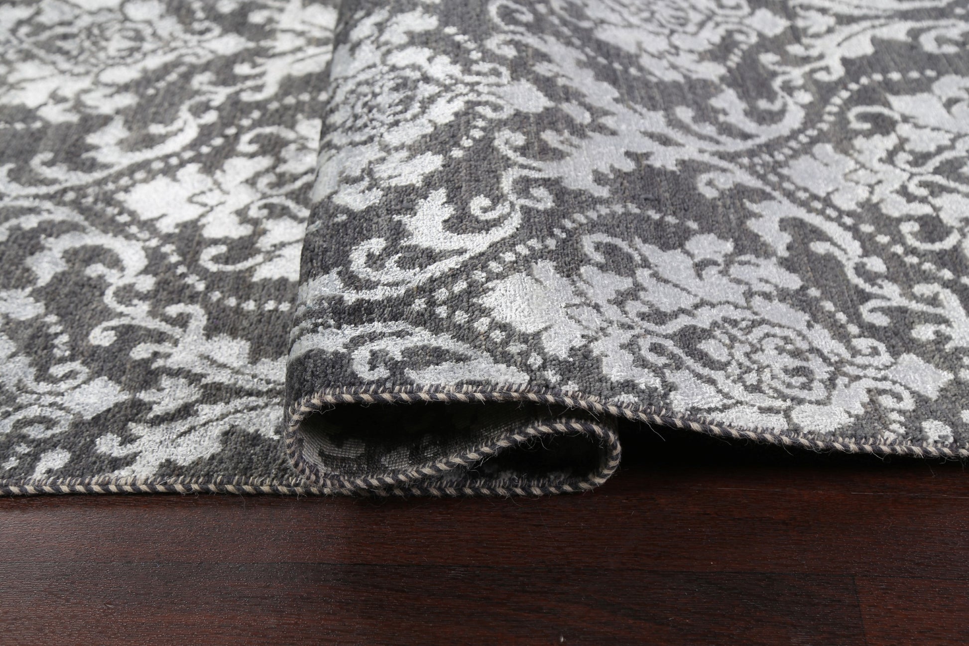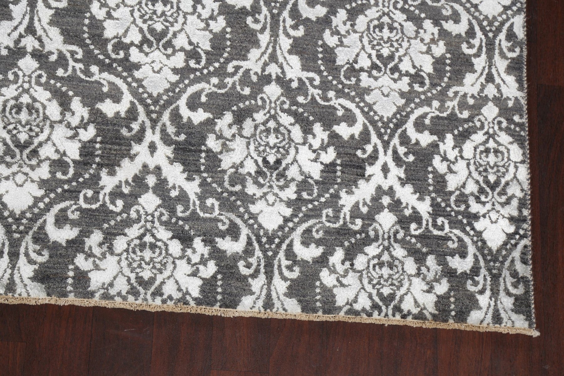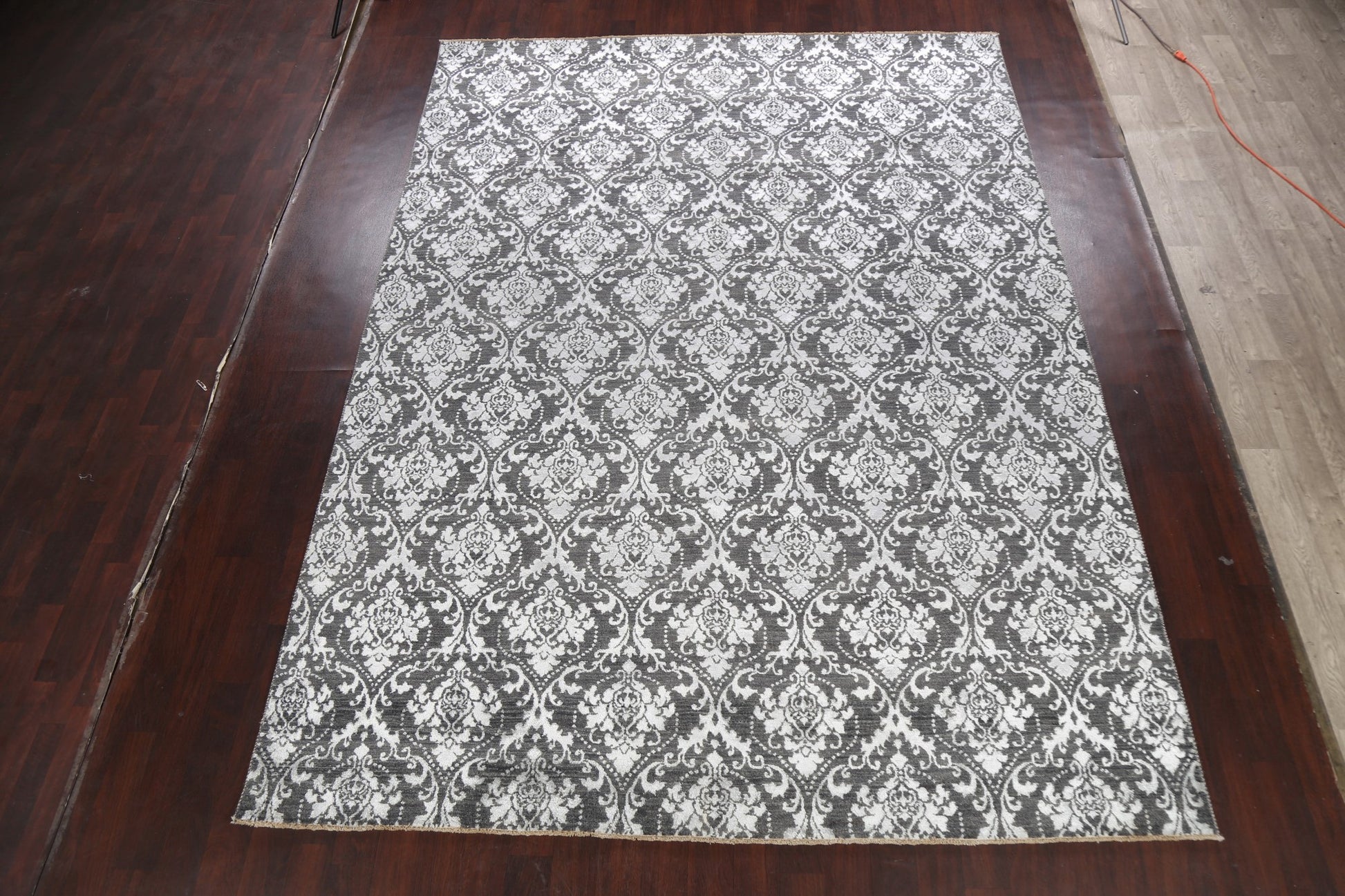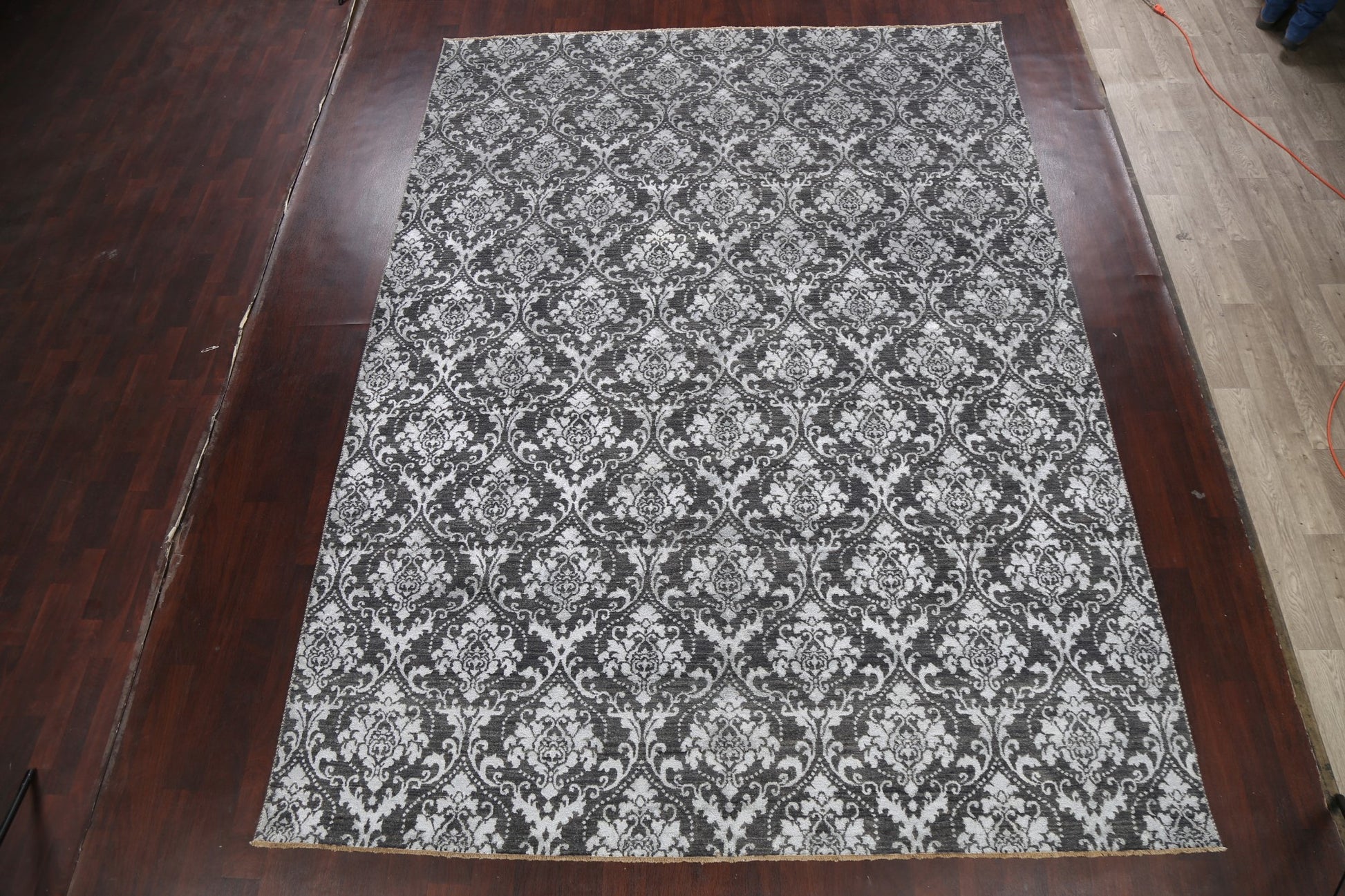 A Beautiful Genuine Pakistan Versace rug is Hand Knotted by skillful weavers in Pakistan with Wool & Silk Material. This rug is in New, First Quality condition. dimensions are 12' 4'' X 9' 1'' in foot and 376 X 277 in centimeter. the primary color is Greys & Charcoal.