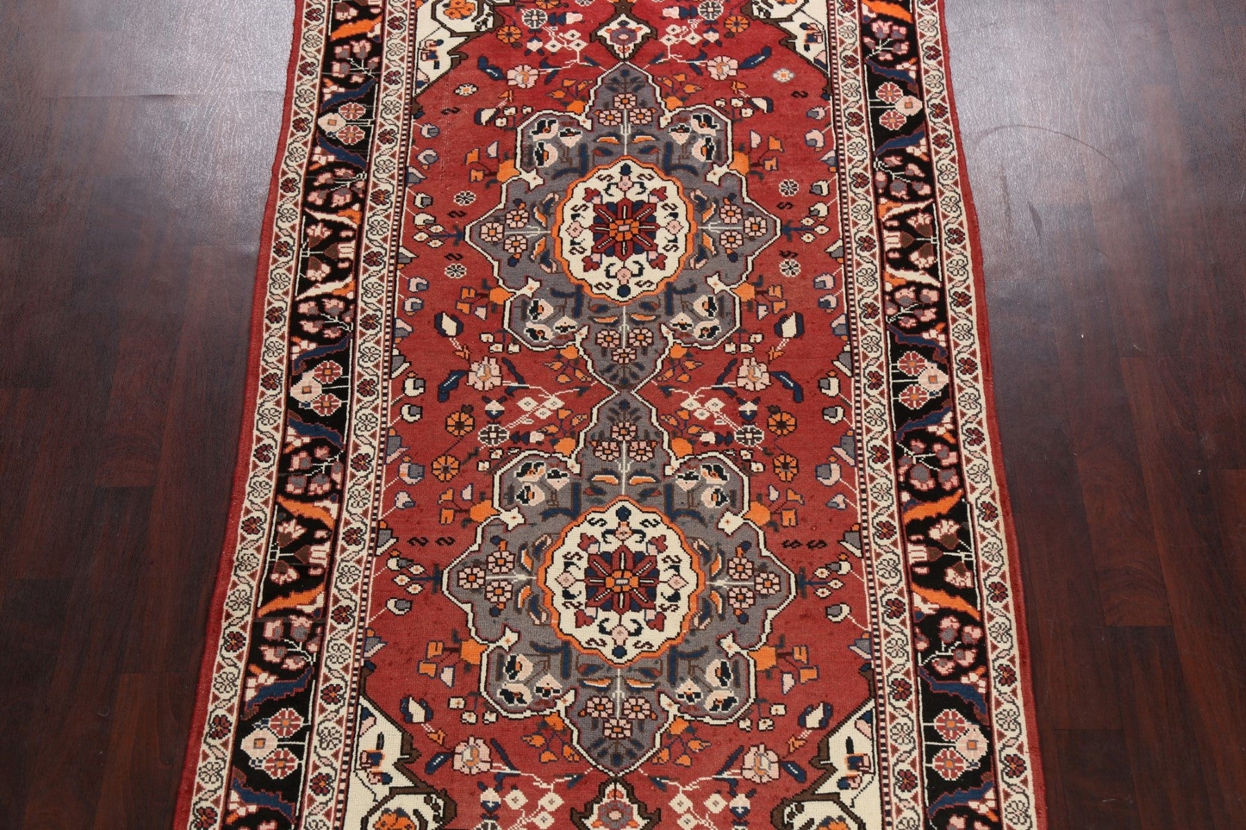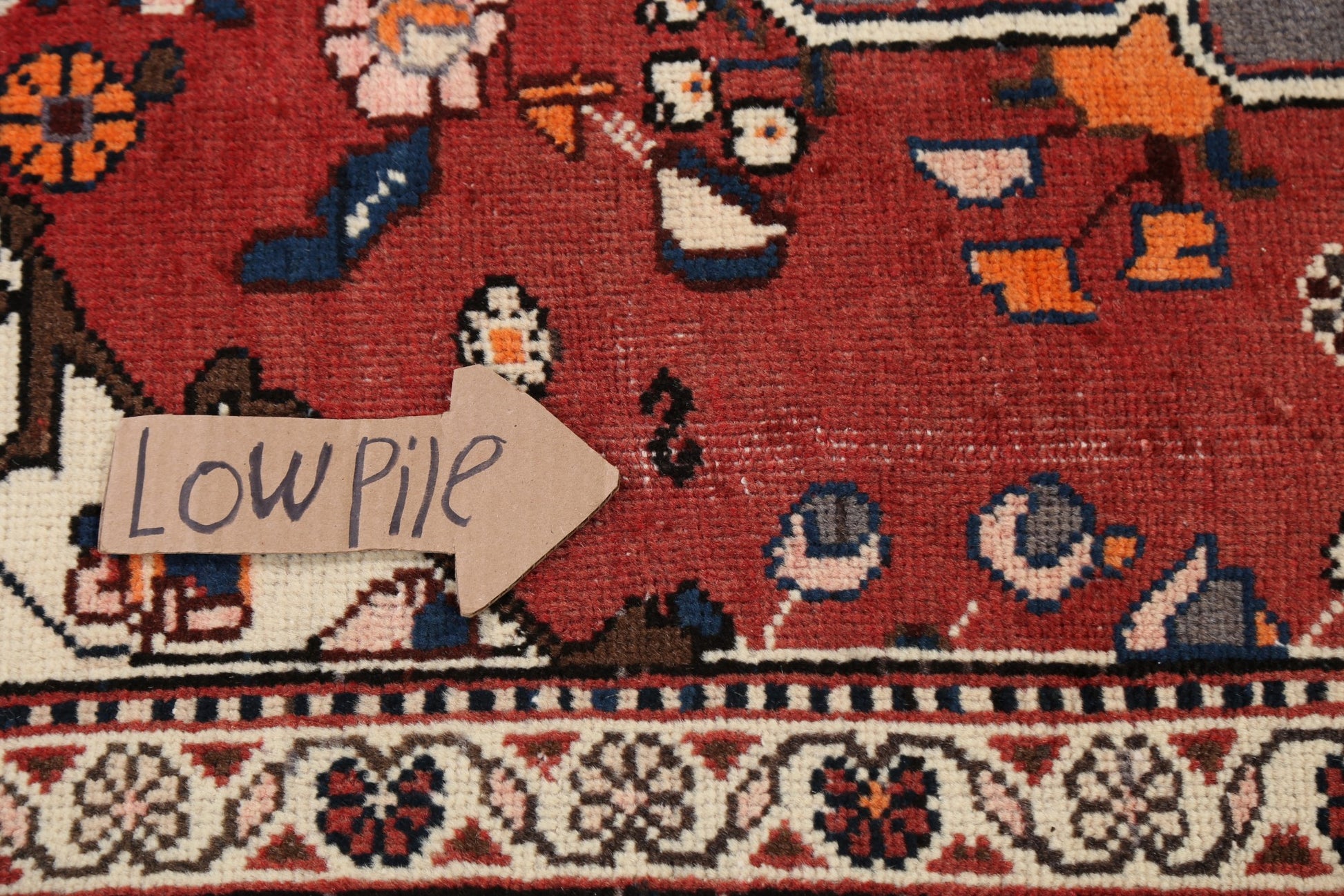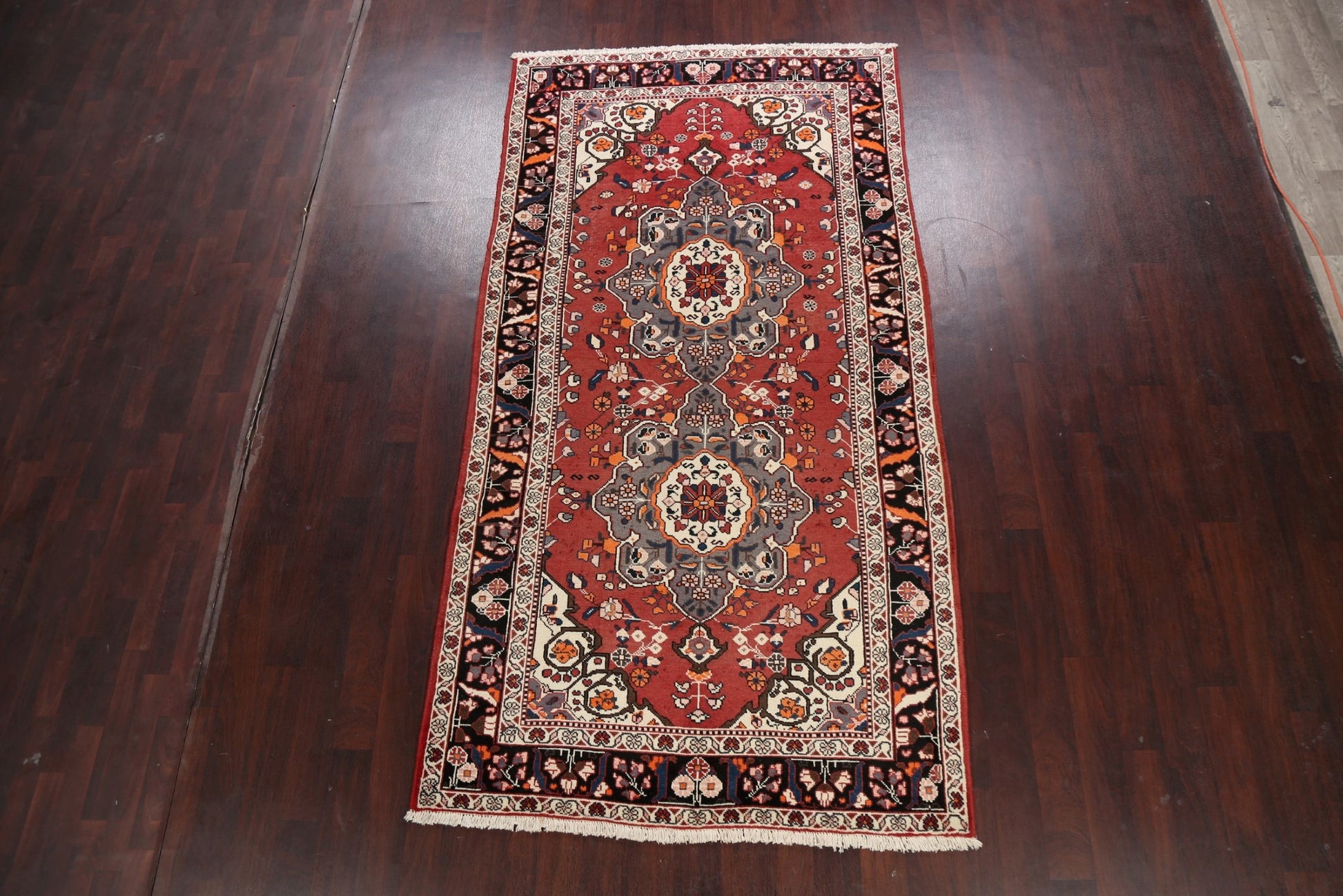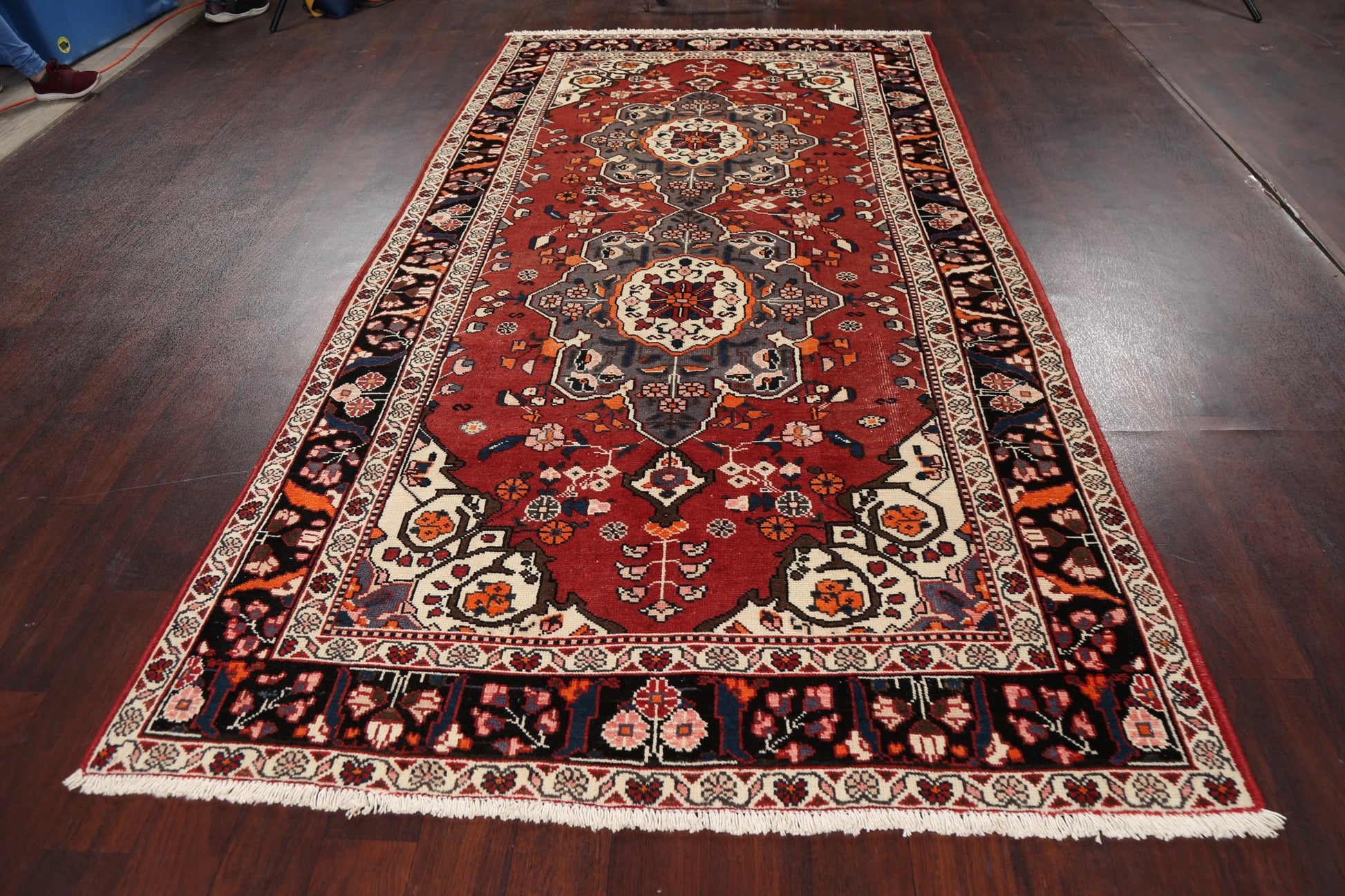 A Beautiful Genuine Persia ( Persia ) Bakhtiari rug is Hand Knotted by skillful weavers in Persia ( Persia ) with 100% Wool Material. This rug is in Very Good ( Low Pile ) condition. dimensions are 9' 11'' X 5' 2'' in foot and 302 X 157 in centimeter. the primary color is Red.