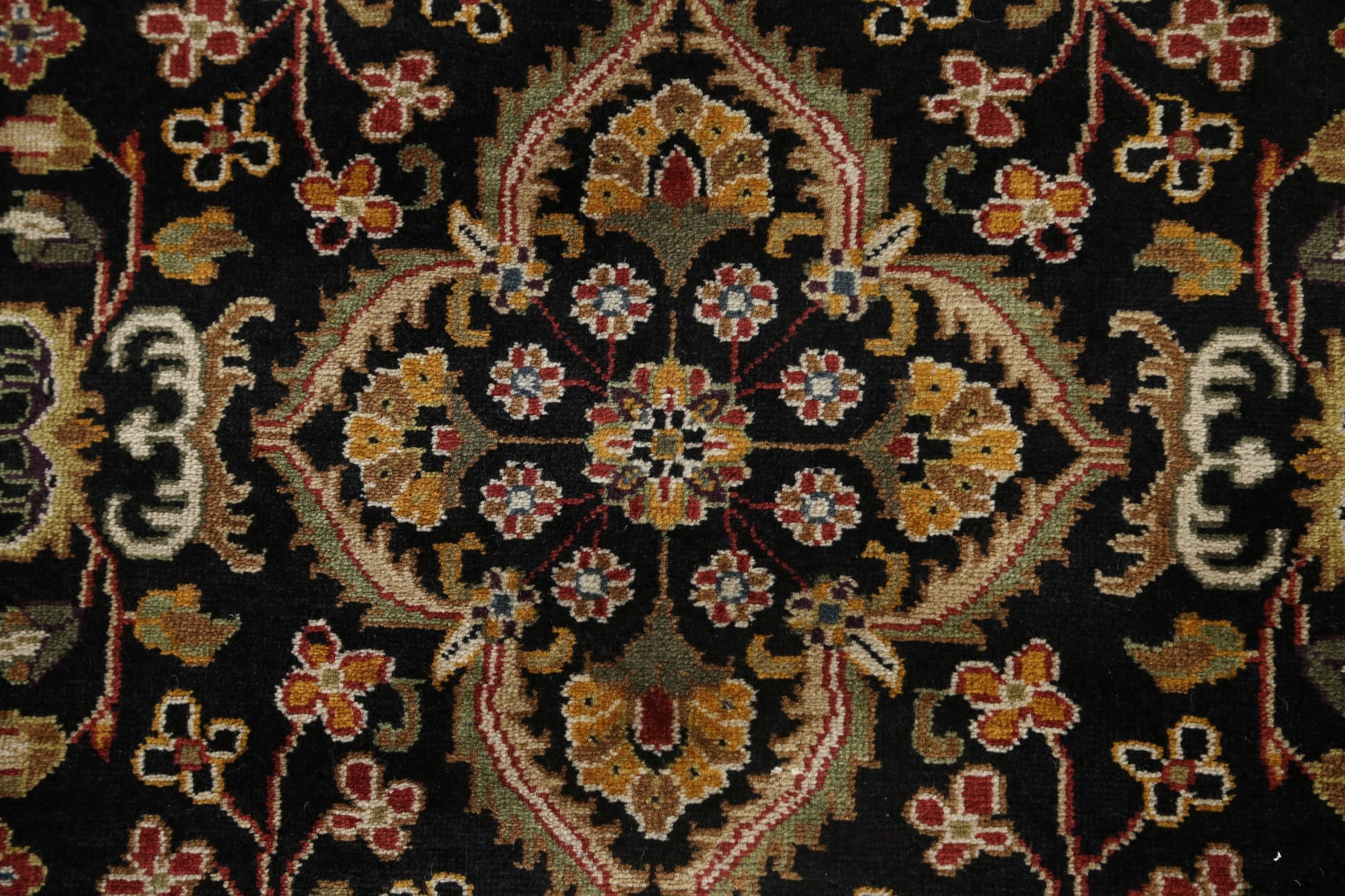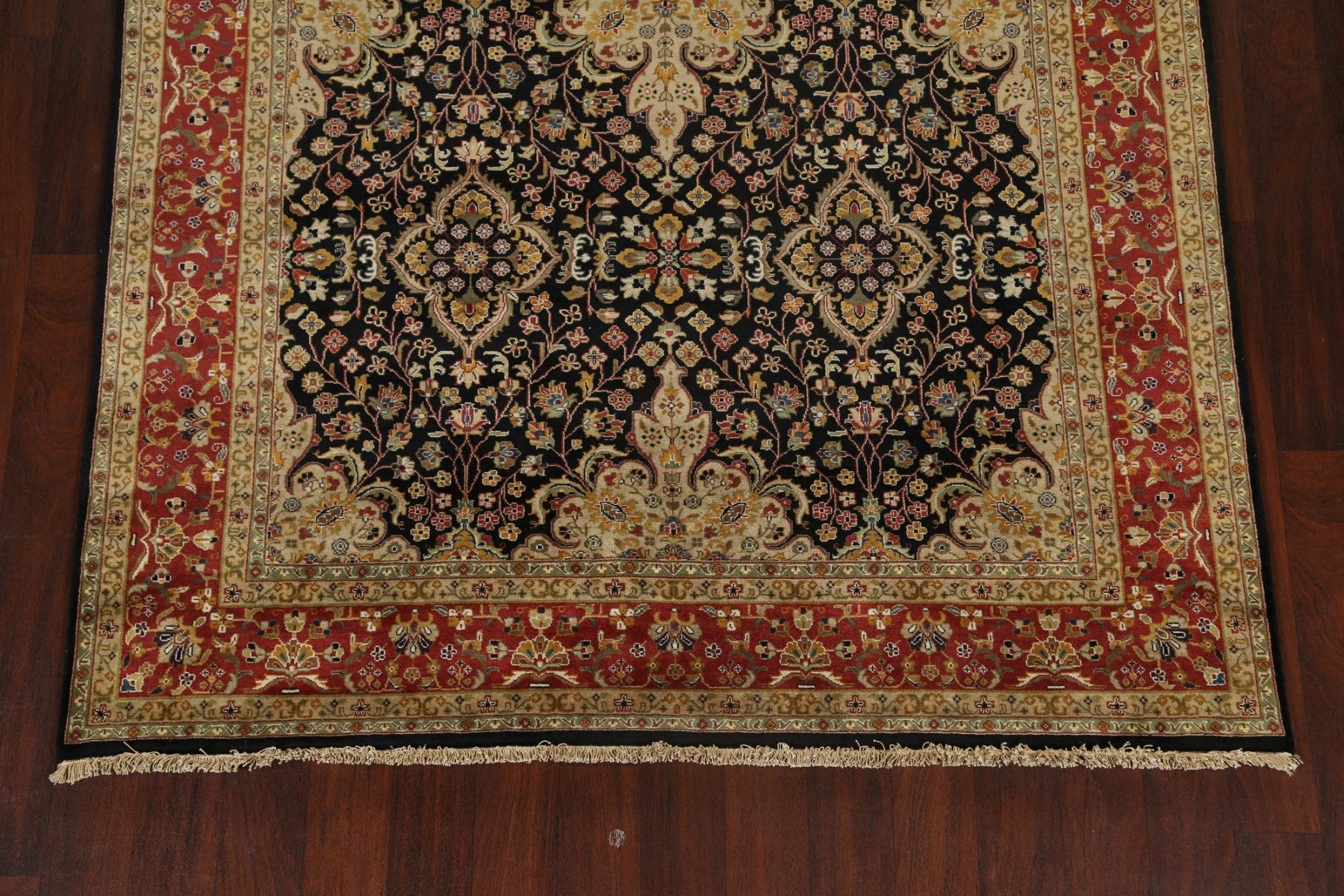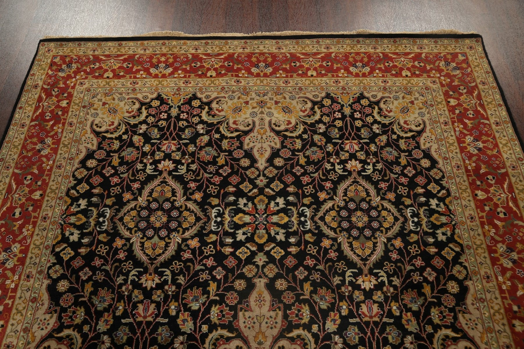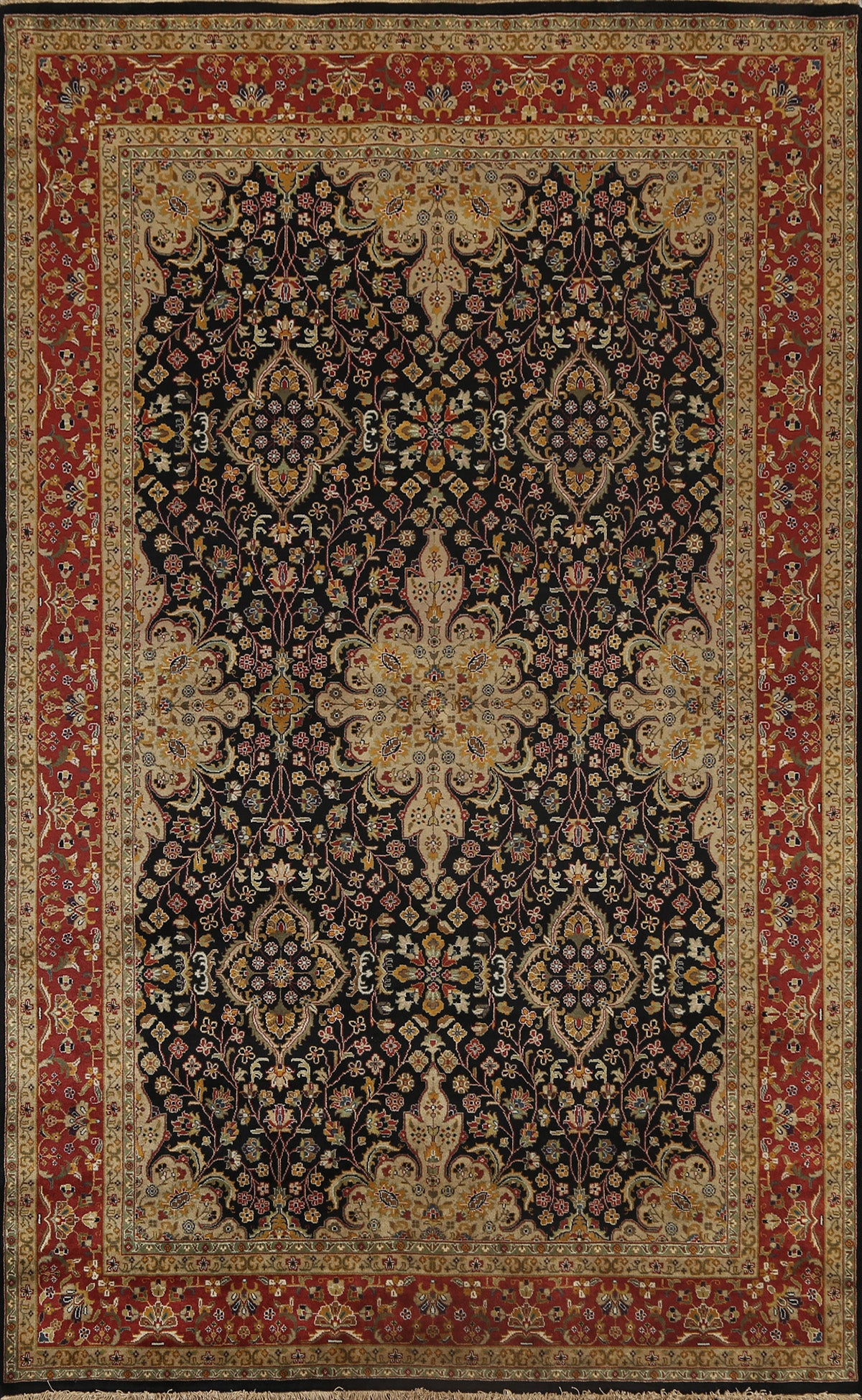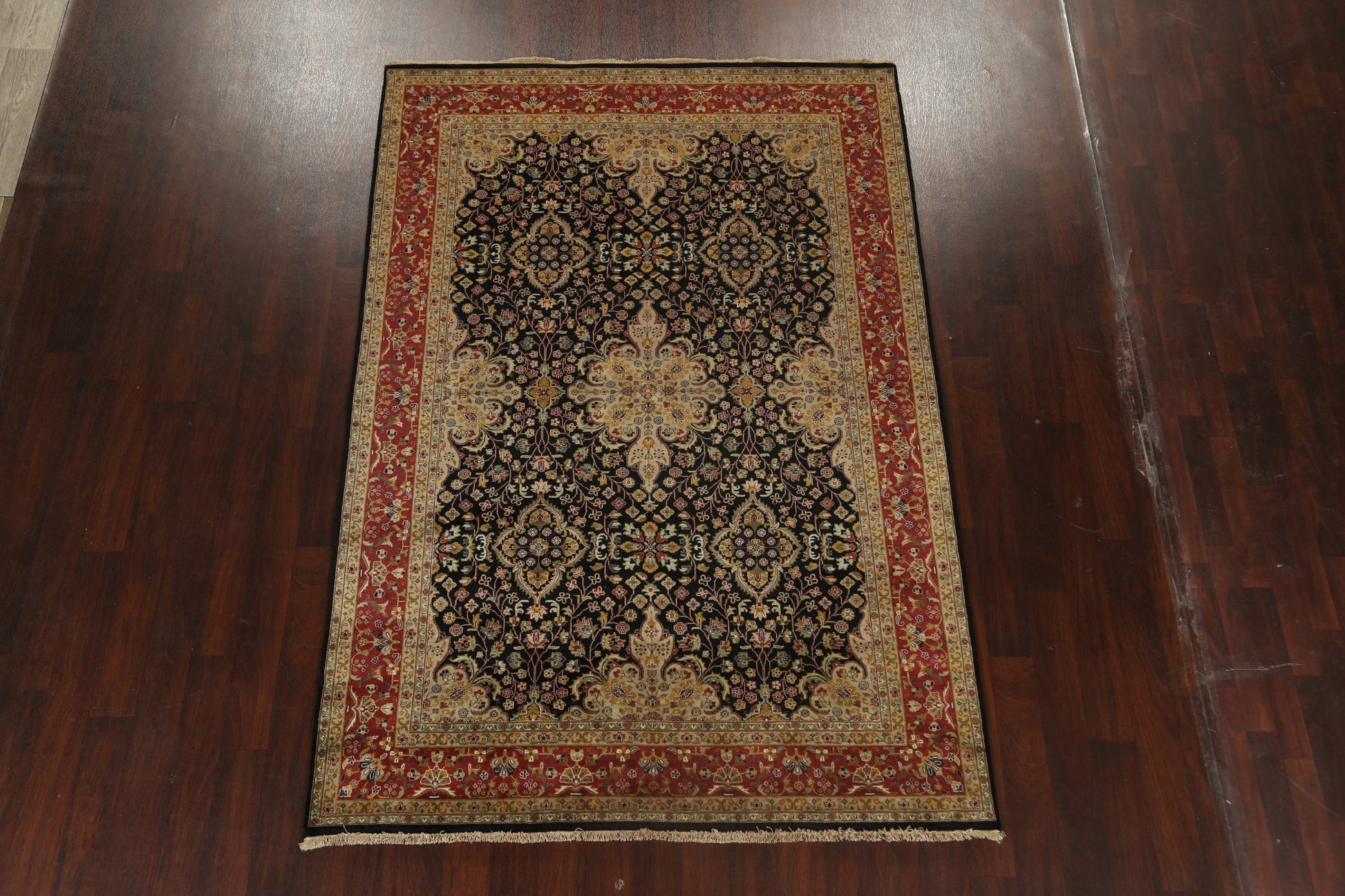 A Beautiful Genuine India Kashan rug is Hand Knotted by skillful weavers in India with 100% Wool Material. This rug is in New, First Quality condition. dimensions are 8' 11'' X 6' 1'' in foot and 272 X 185 in centimeter. the primary color is Black.