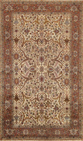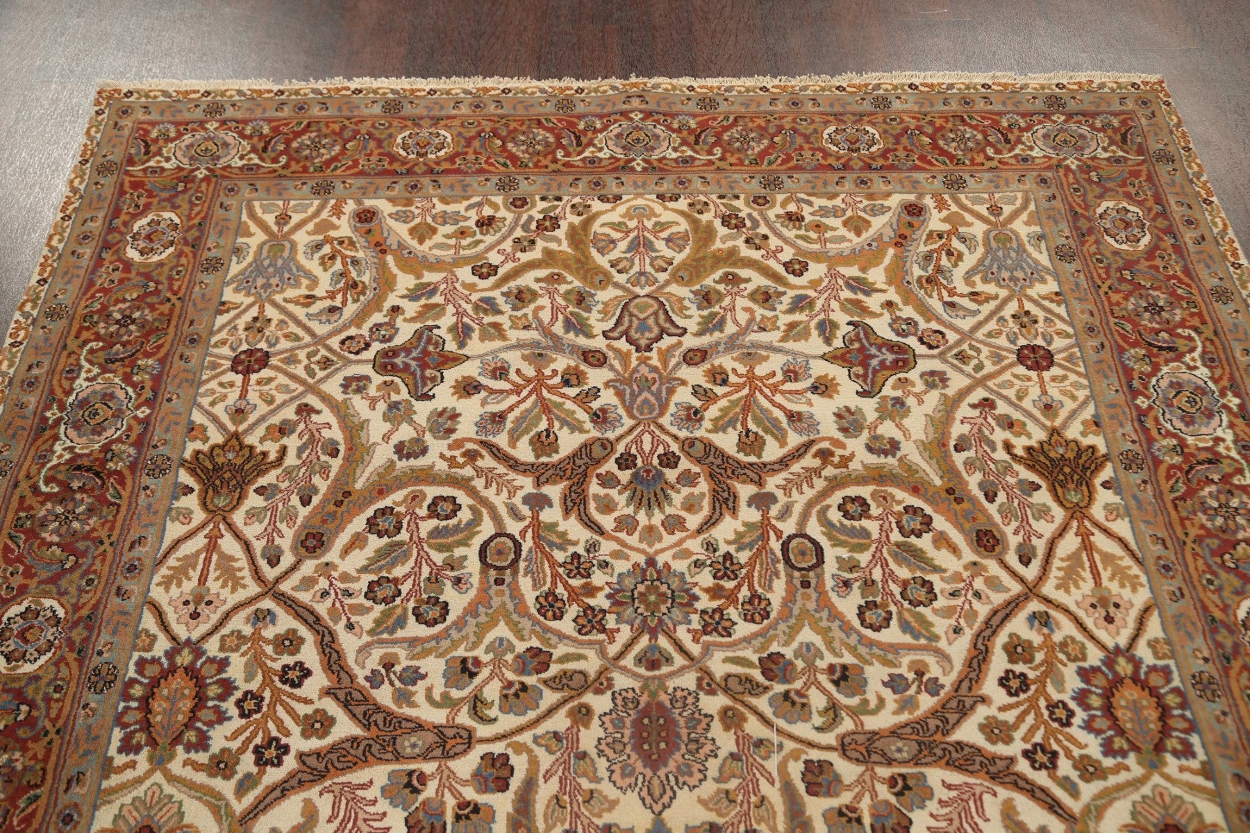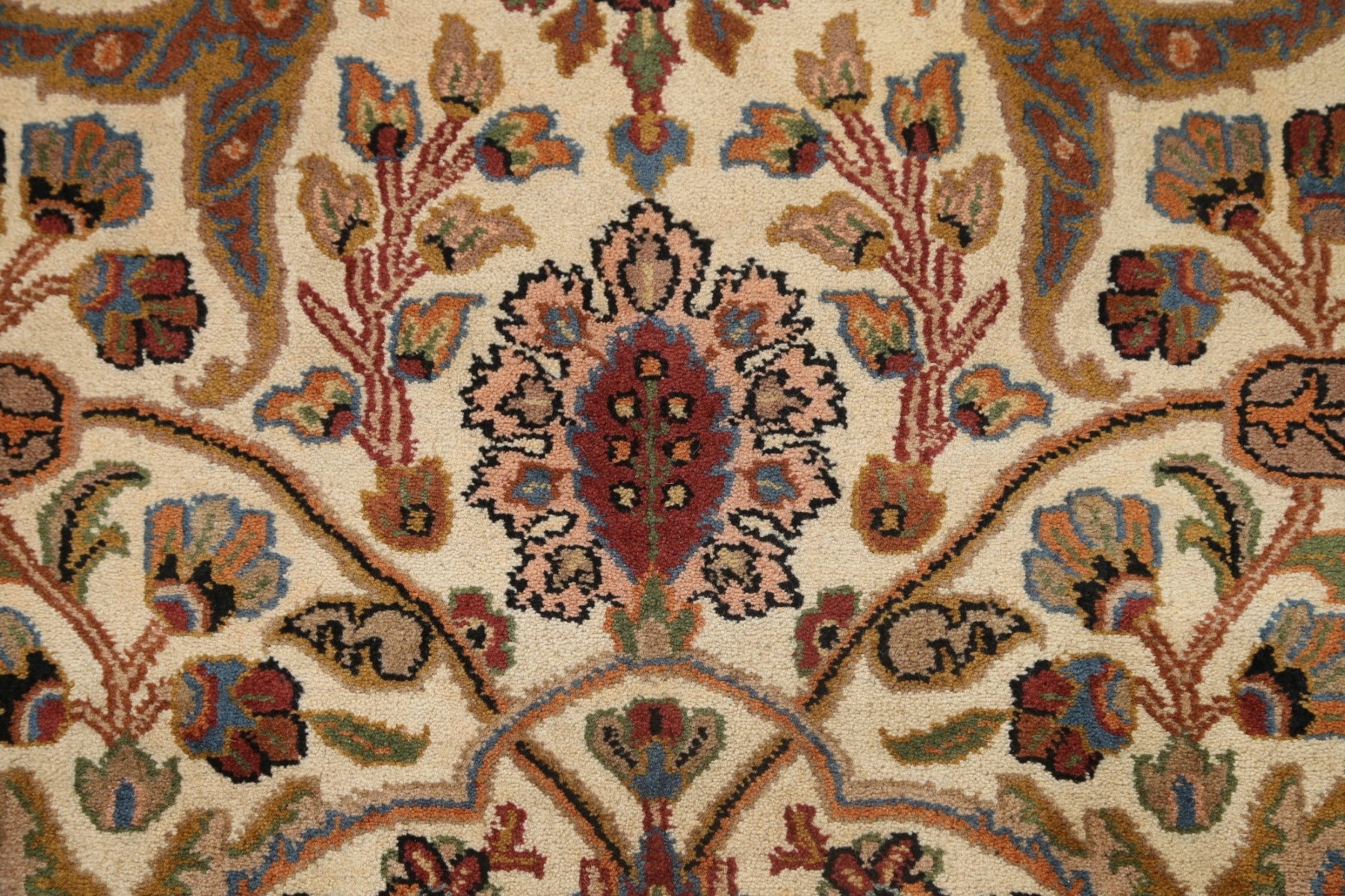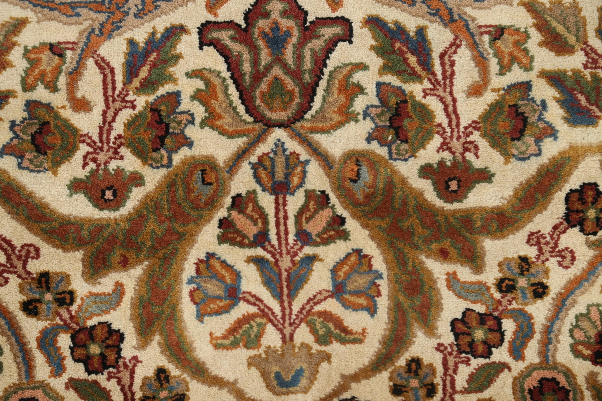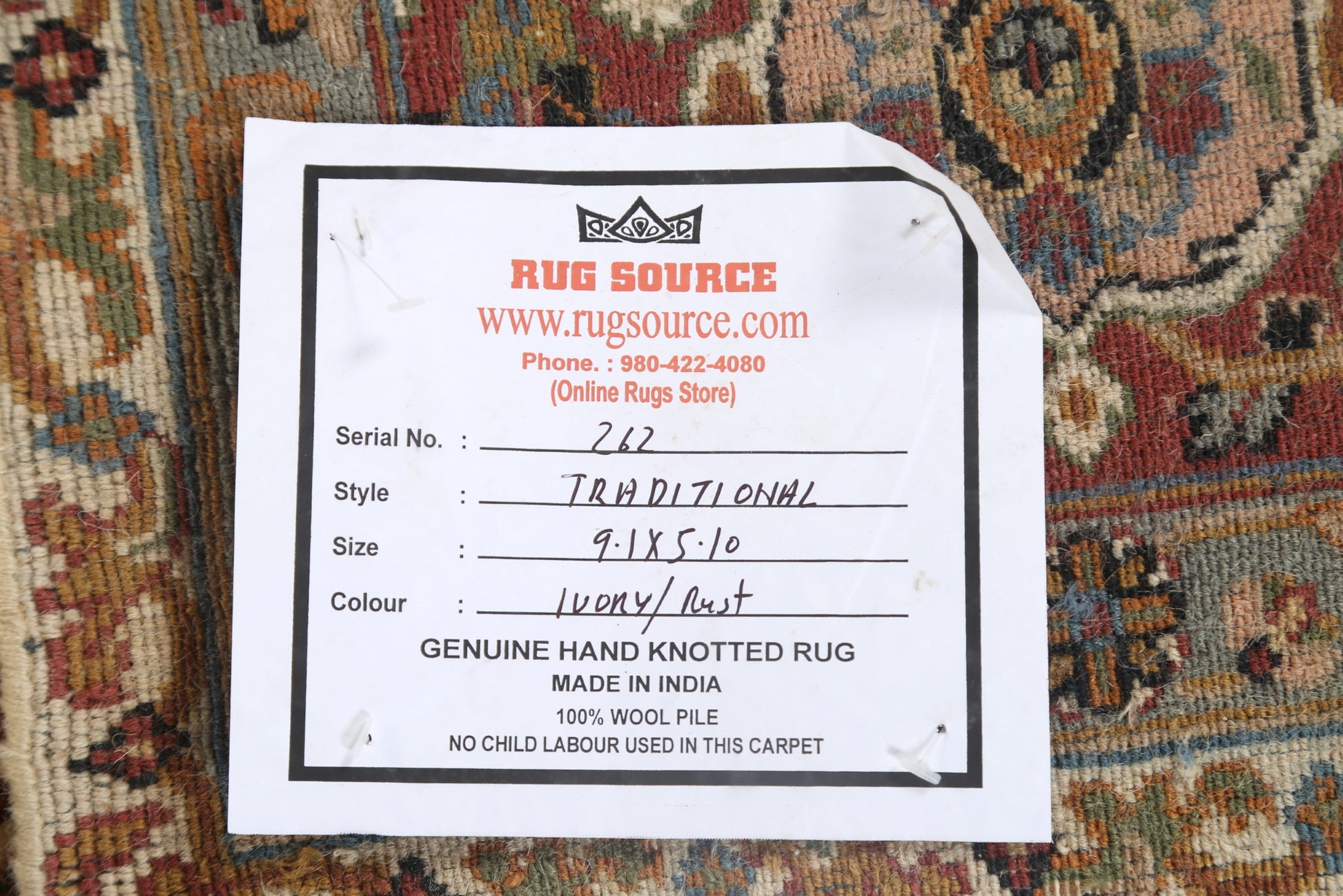A Beautiful Genuine India Kashan rug is Hand Knotted by skillful weavers in India with 100% Wool Material. This rug is in New, First Quality condition. dimensions are 9' 1'' X 5' 10'' in foot and 277 X 178 in centimeter. the primary color is Beige & Ivories.