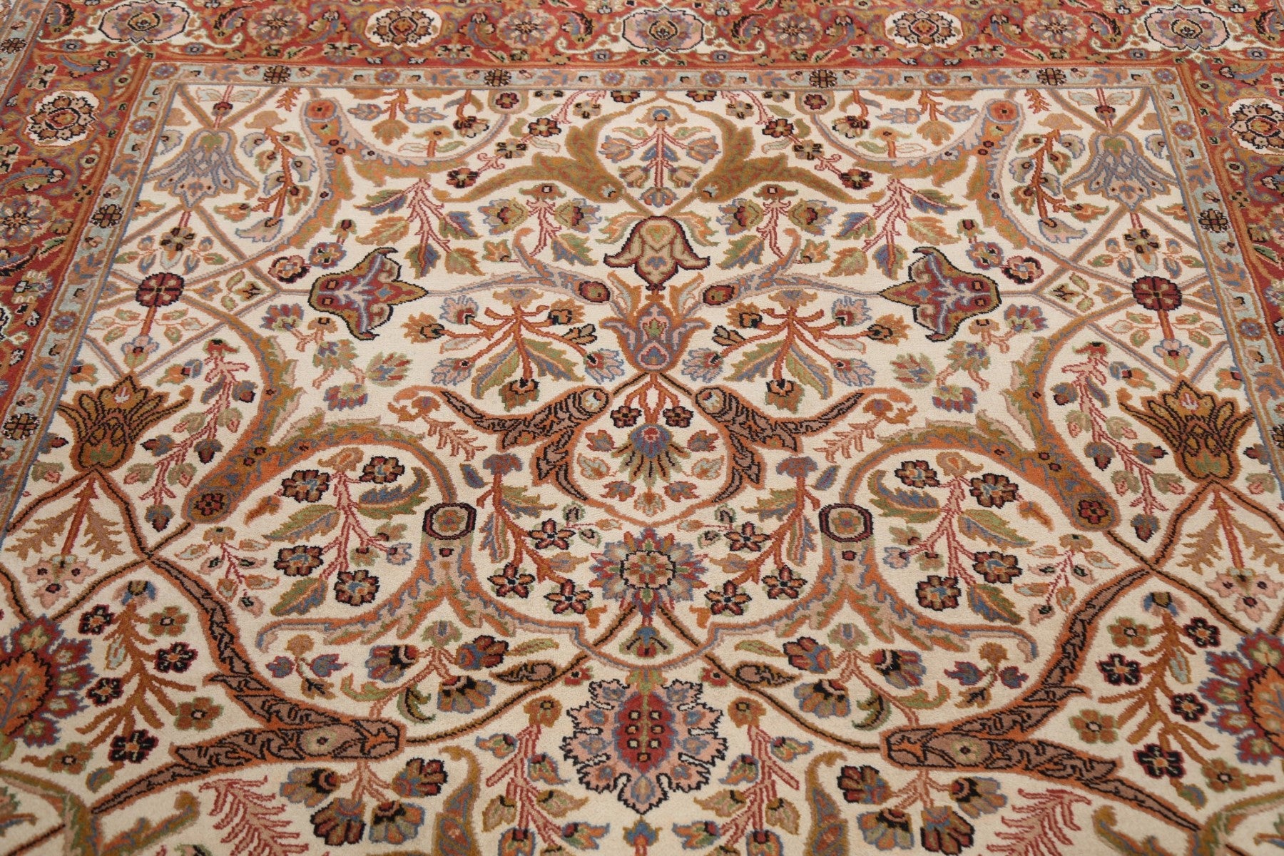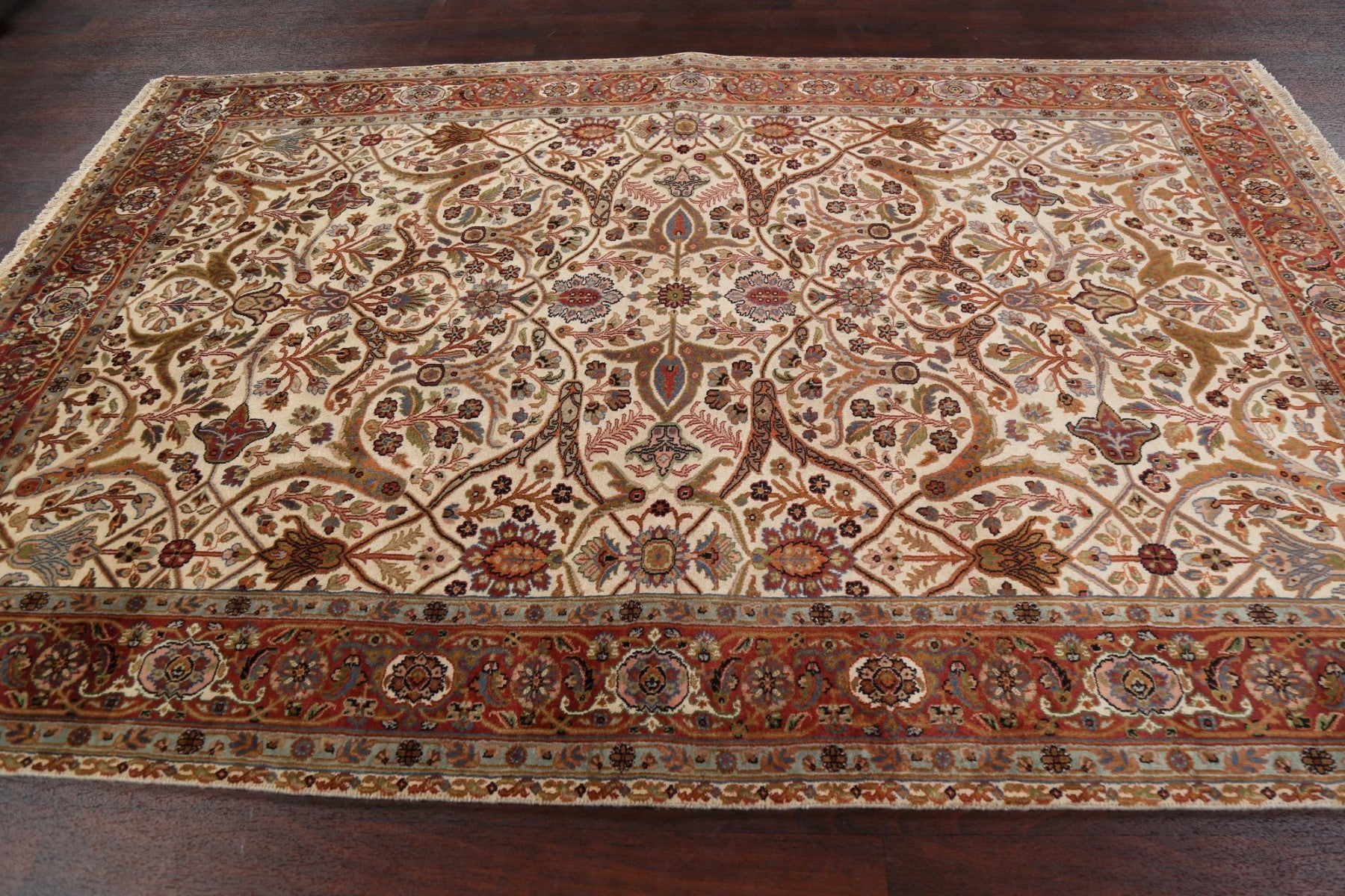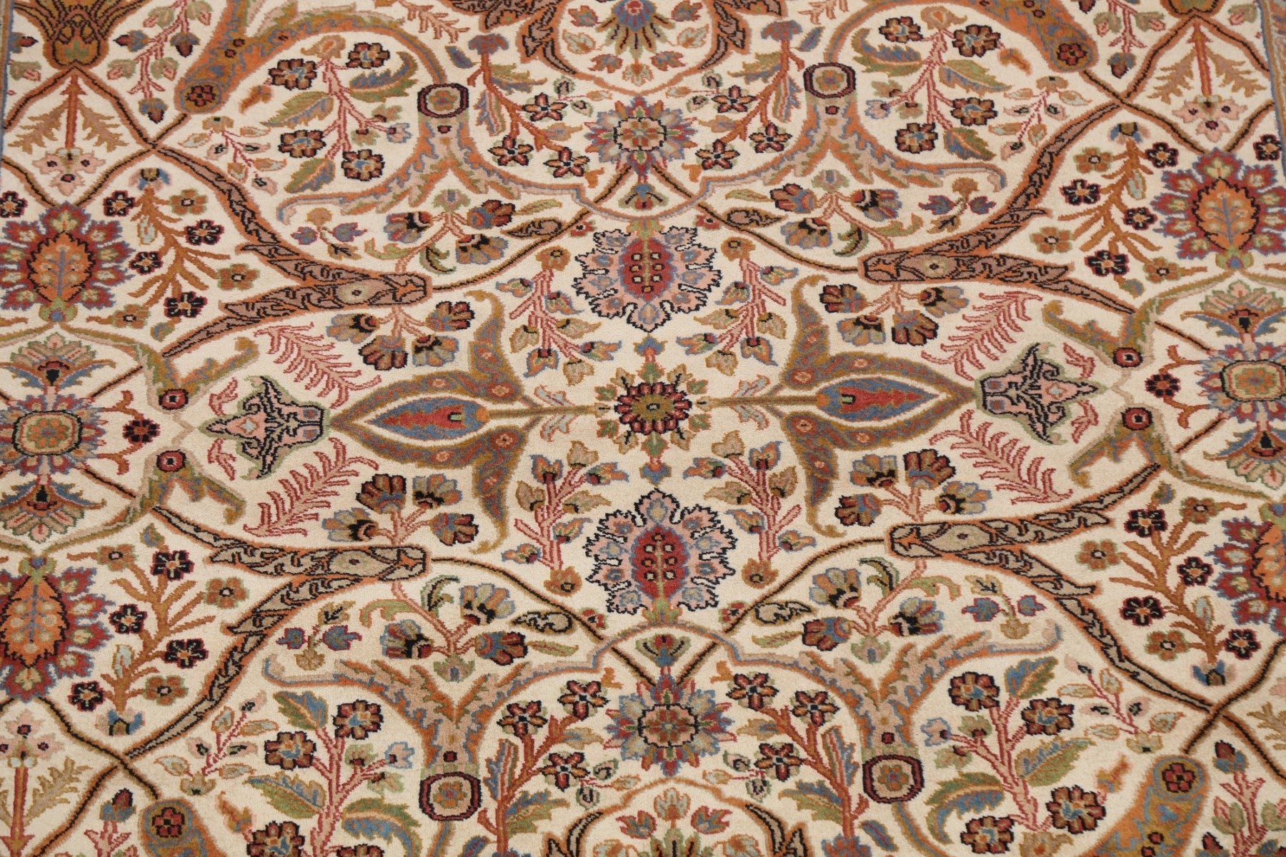 A Beautiful Genuine India Kashan rug is Hand Knotted by skillful weavers in India with 100% Kork Wool Material. This rug is in New, First Quality condition. dimensions are 8' 10'' X 6' 0'' in foot and 269 X 183 in centimeter. the primary color is Beige & Ivories.