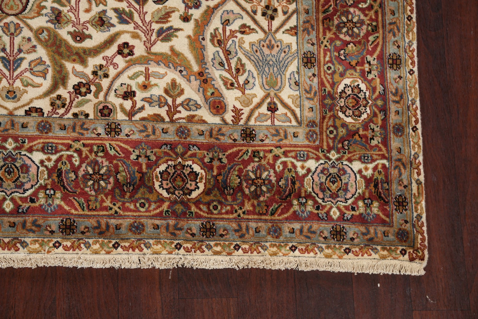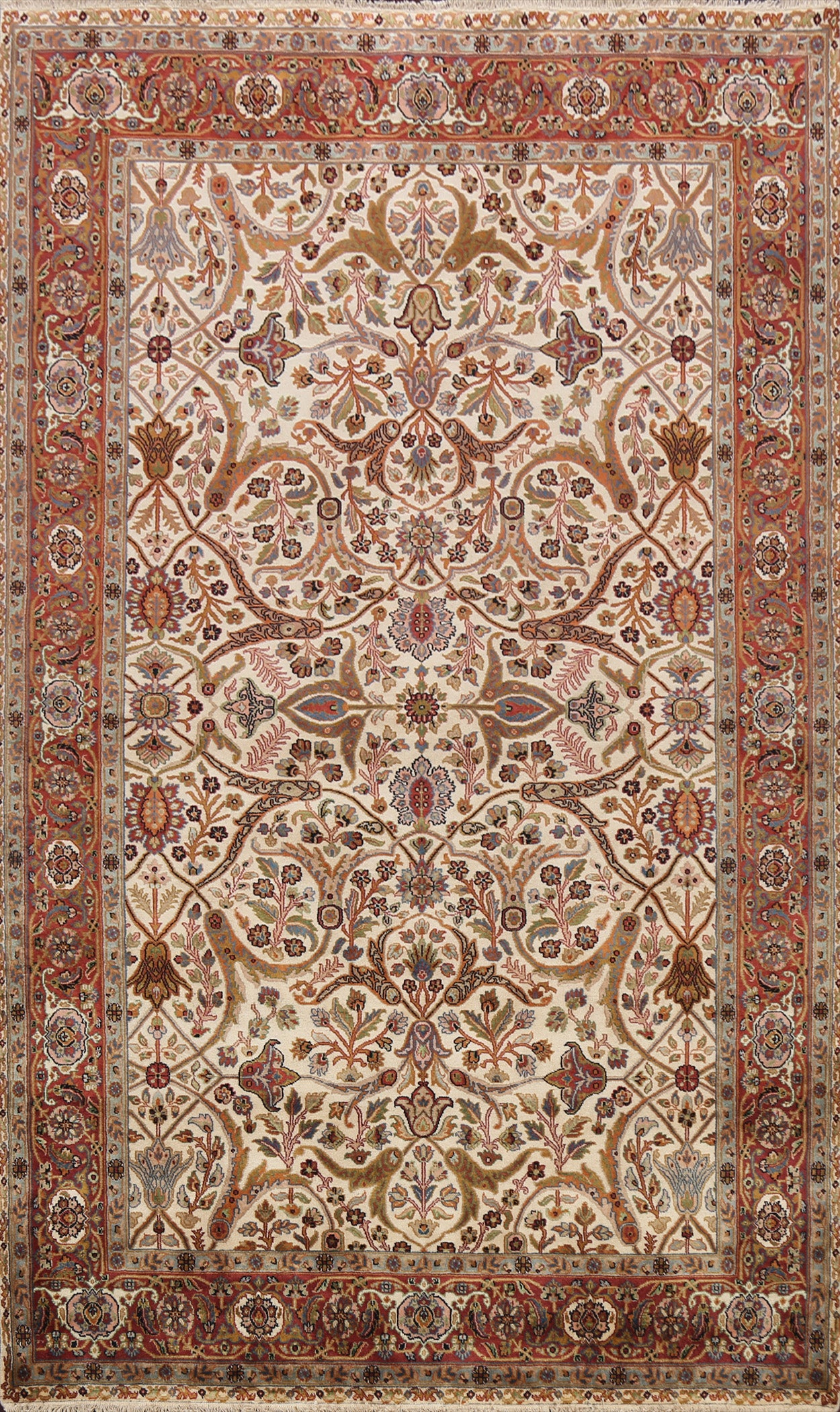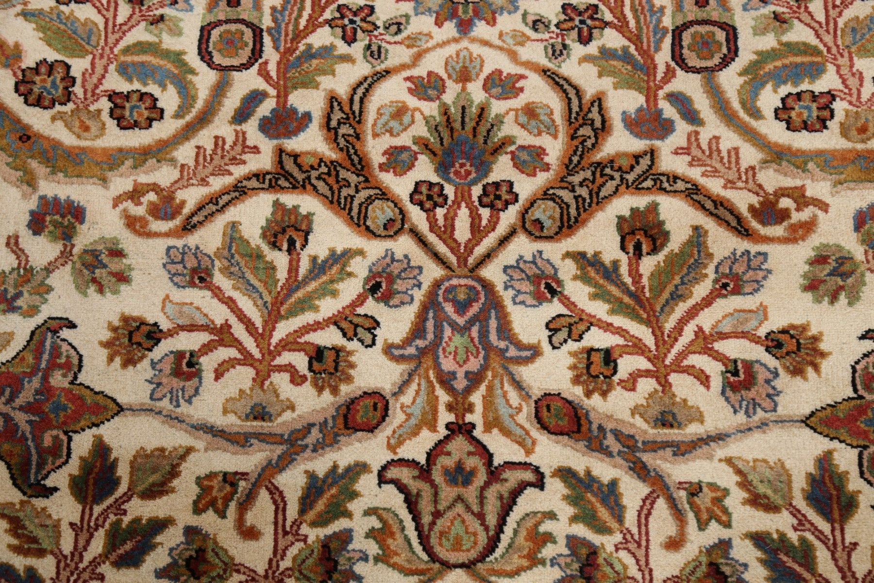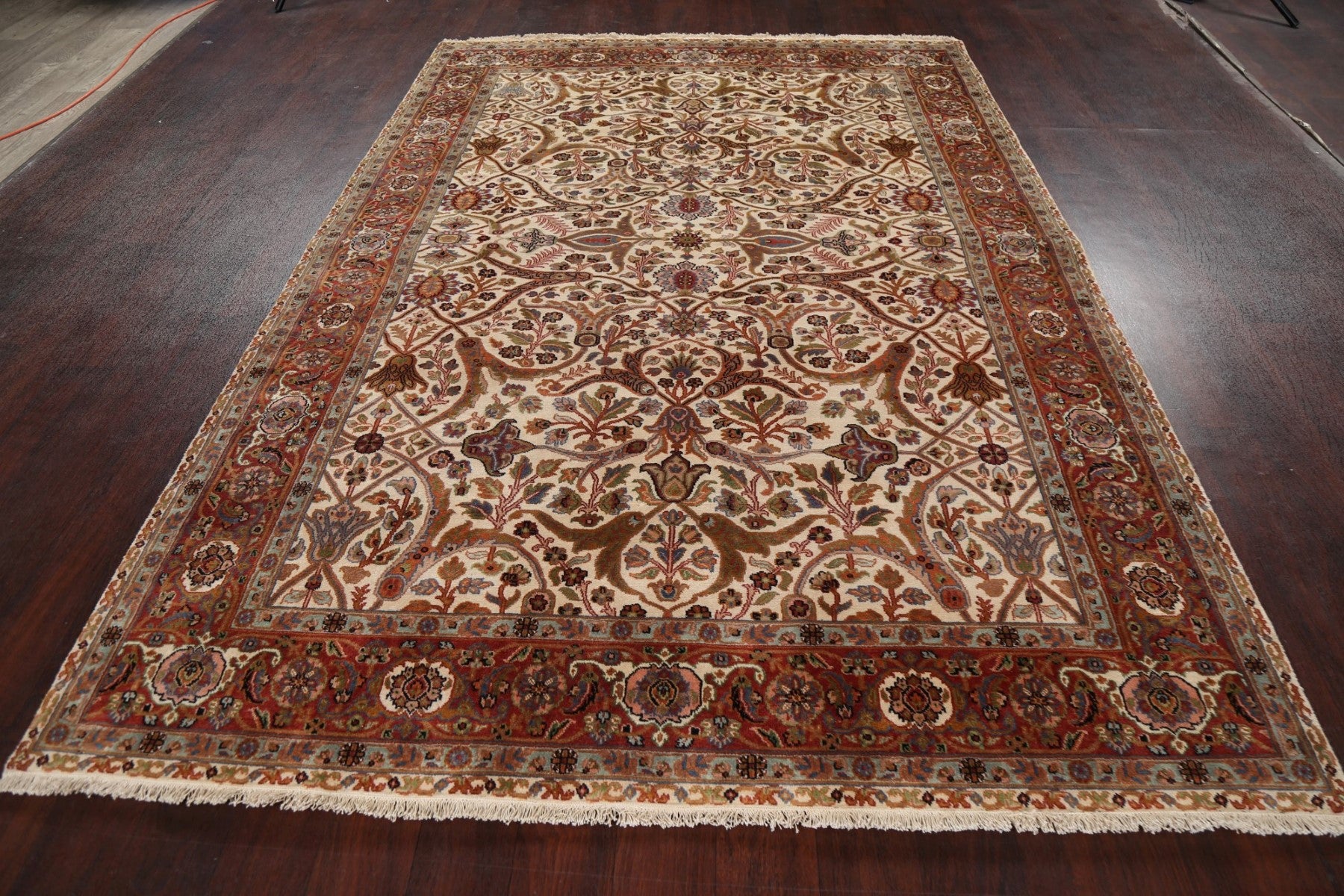 A Beautiful Genuine India Kashan rug is Hand Knotted by skillful weavers in India with 100% Kork Wool Material. This rug is in New, First Quality condition. dimensions are 8' 10'' X 6' 0'' in foot and 269 X 183 in centimeter. the primary color is Beige & Ivories.