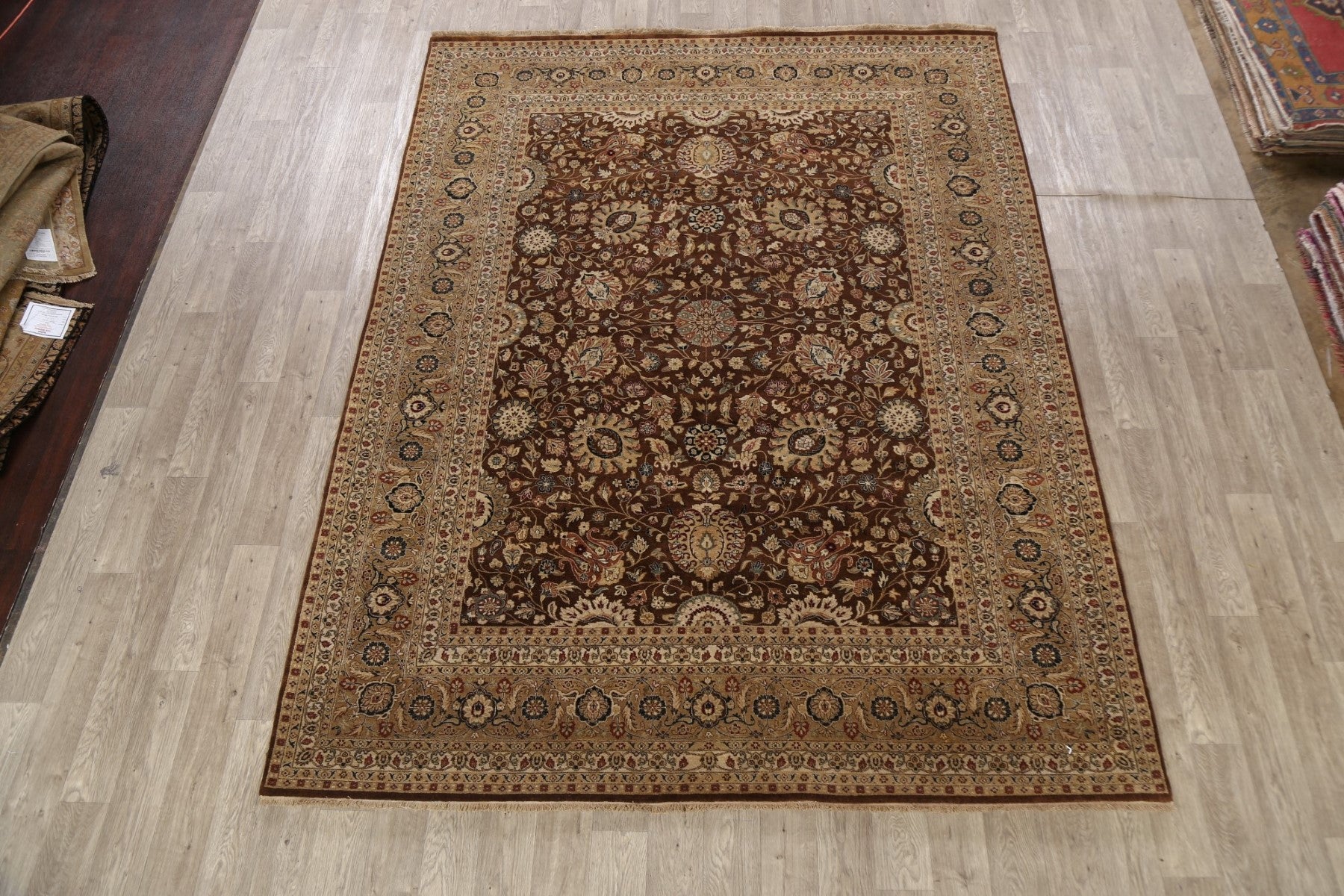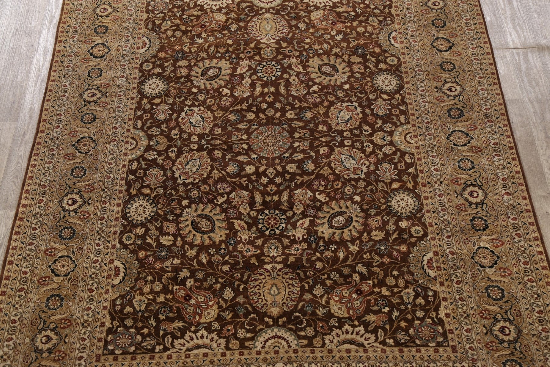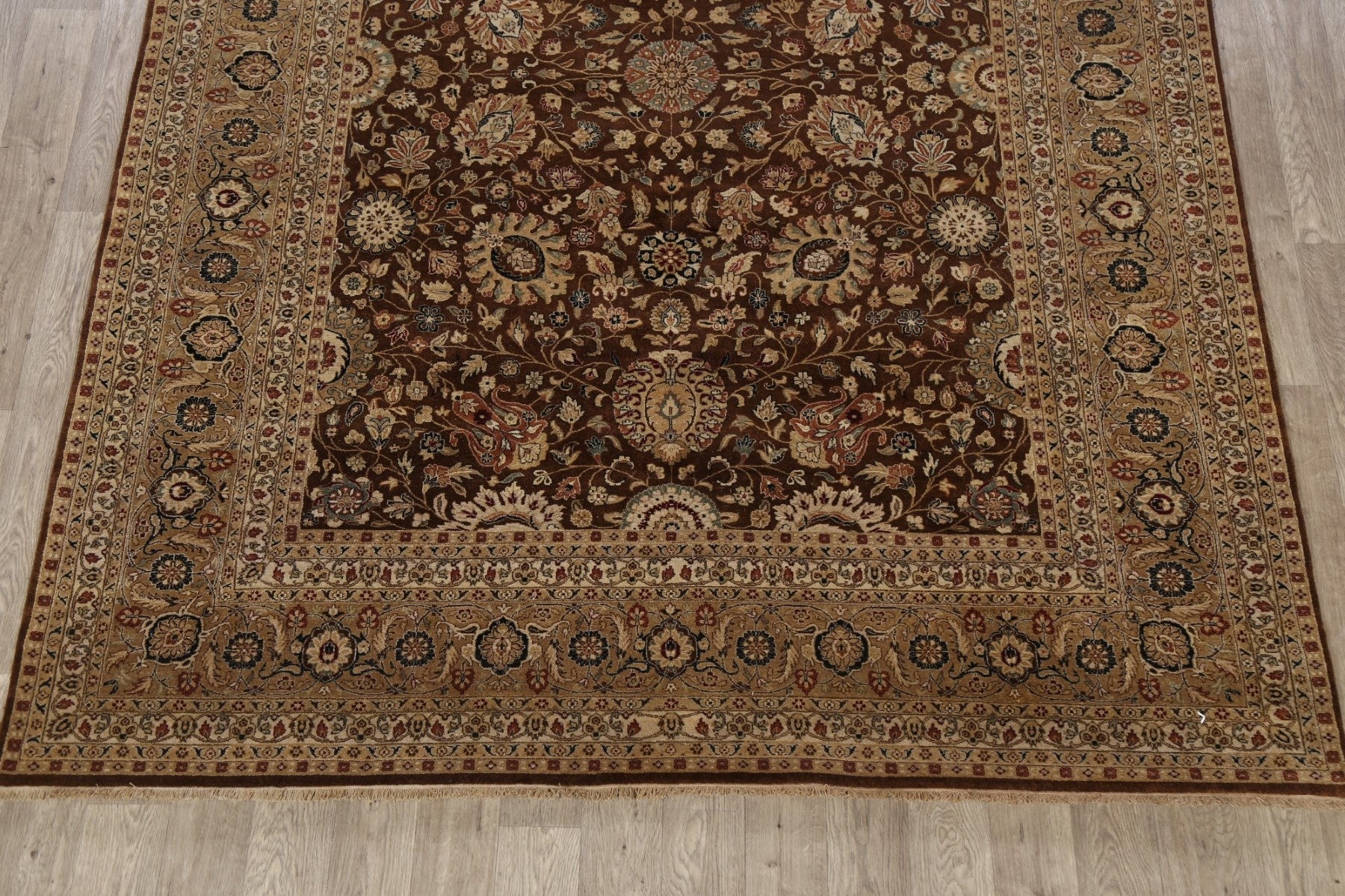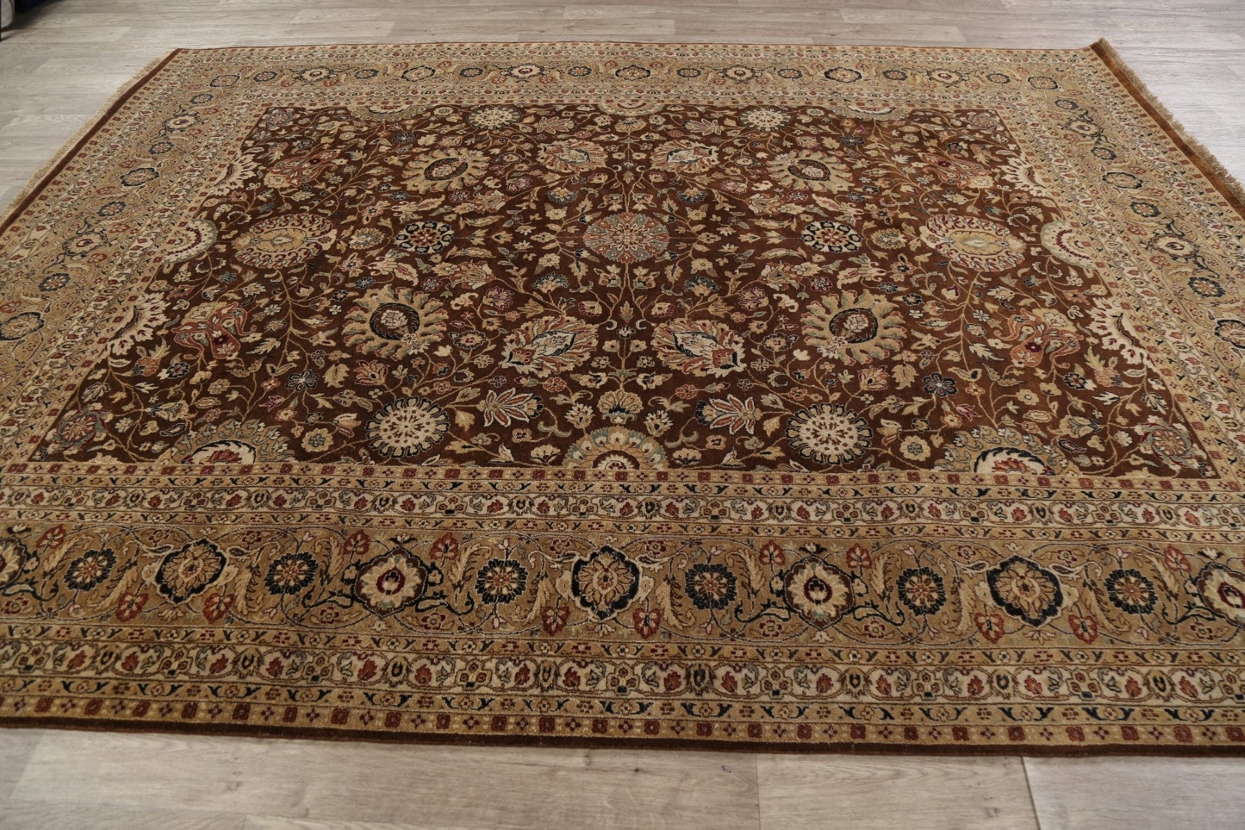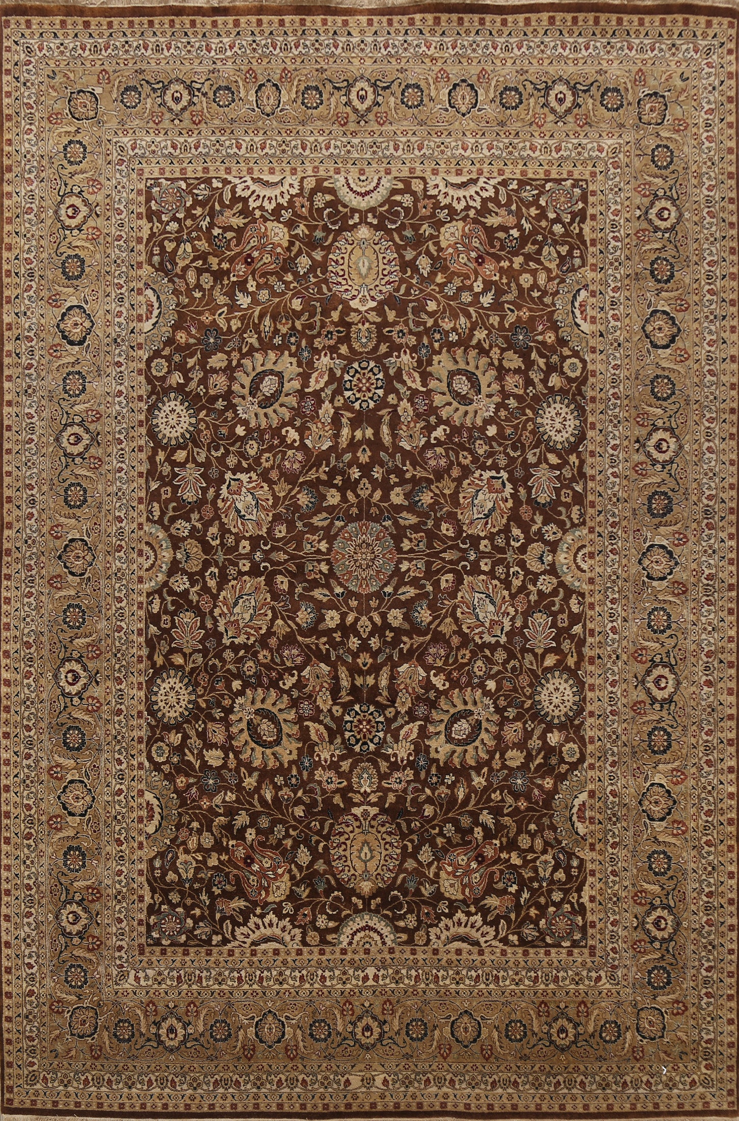 A Beautiful Genuine India Kashan rug is Hand Knotted by skillful weavers in India with 100% Wool Material. This rug is in New, First Quality condition. dimensions are 10' 3'' X 7' 10'' in foot and 312 X 239 in centimeter. the primary color is Brown.