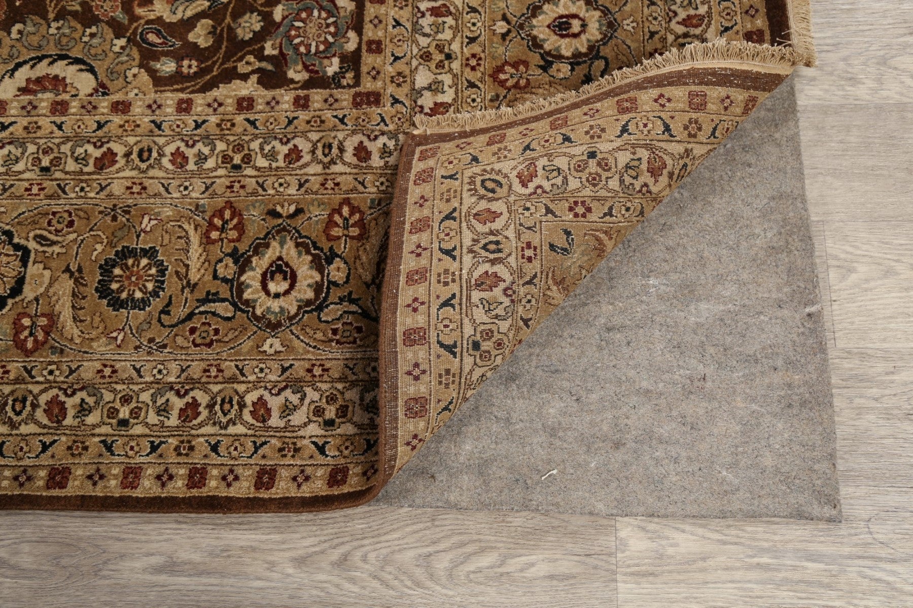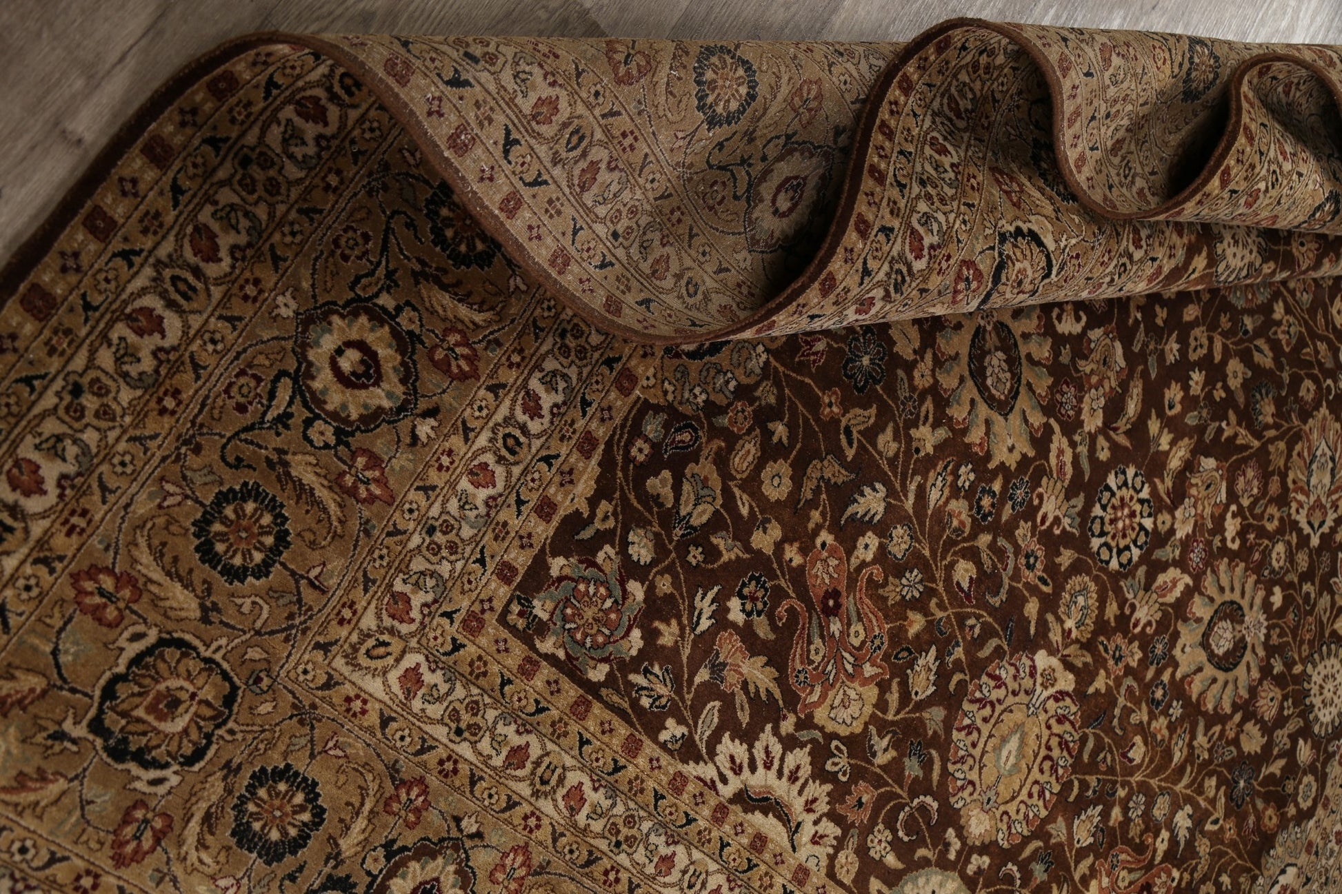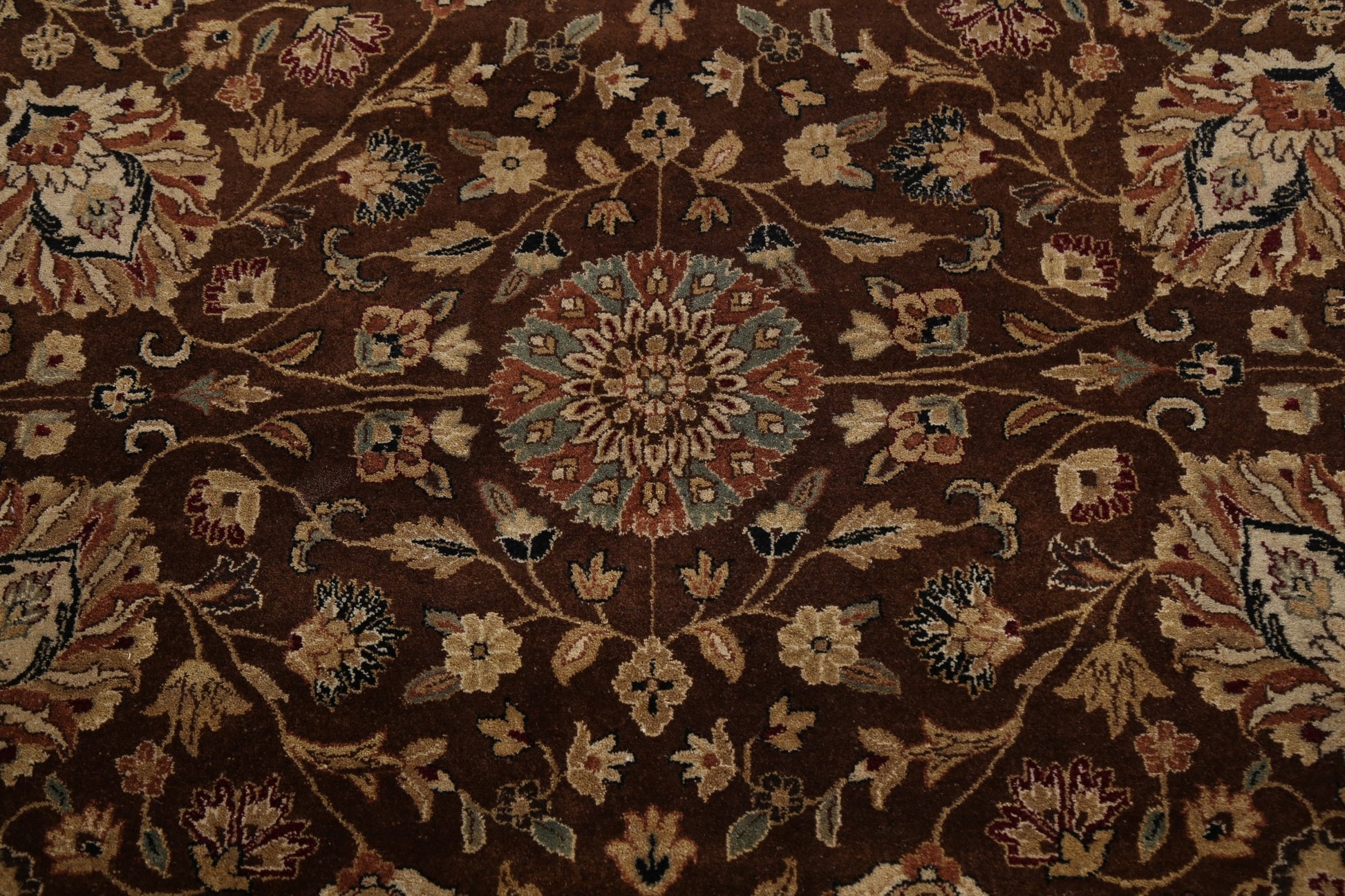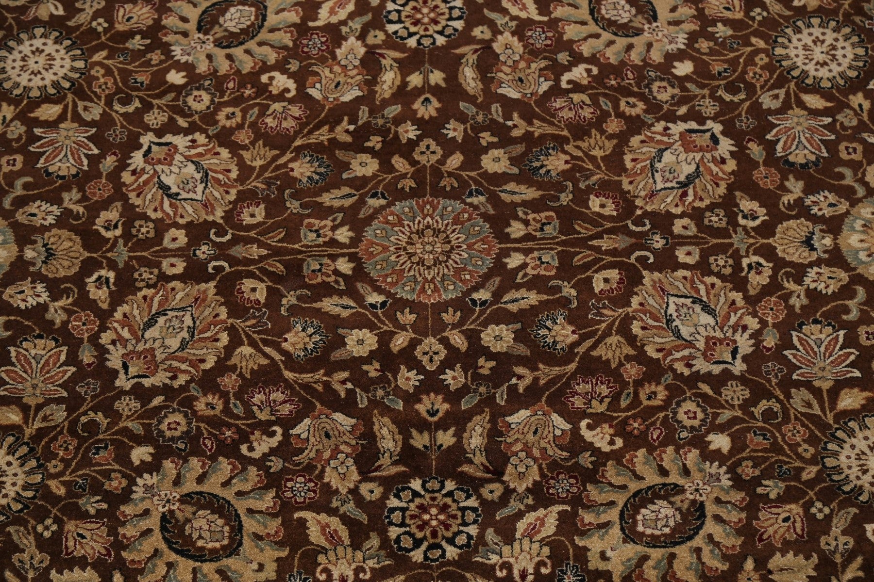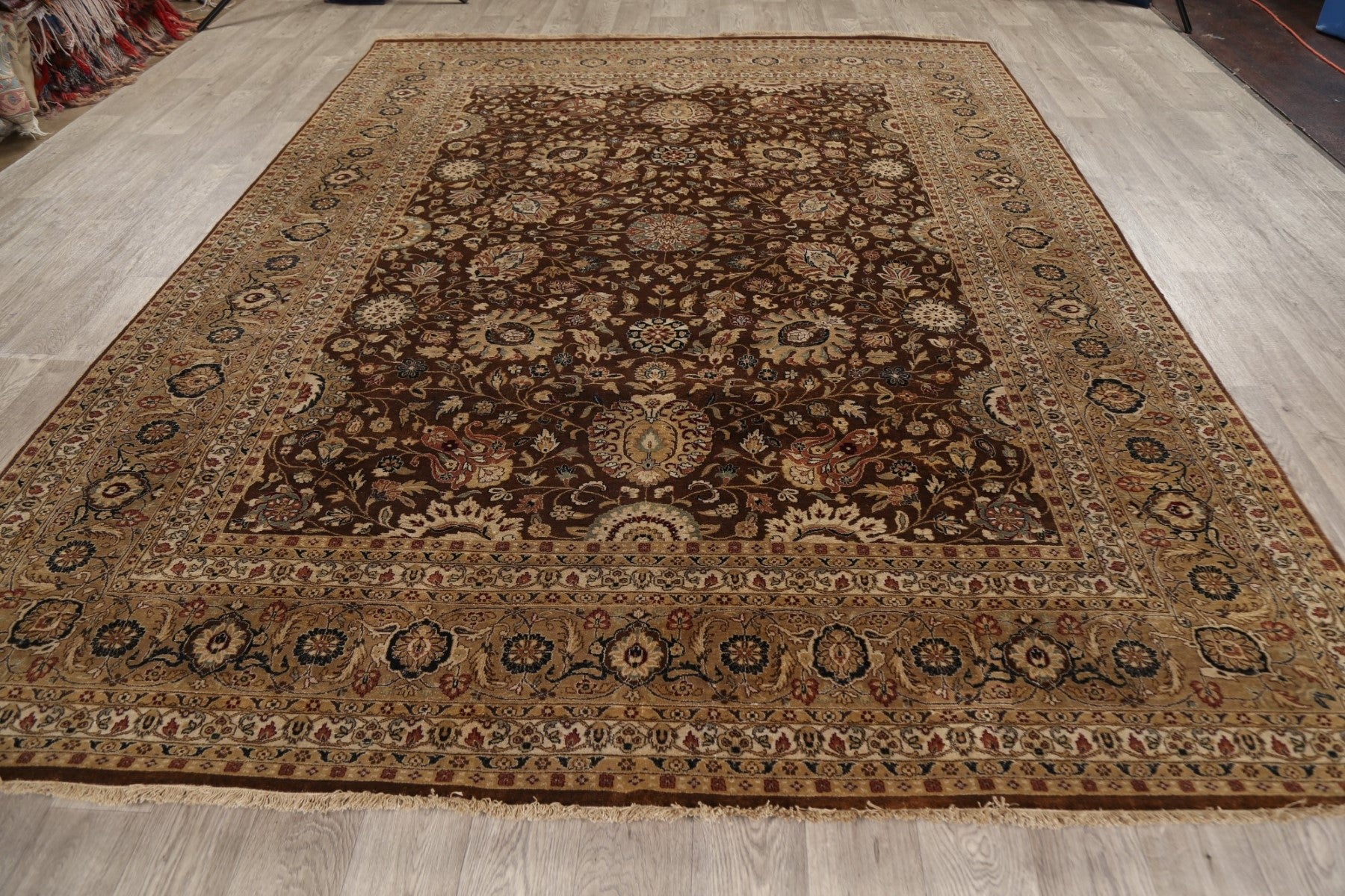 A Beautiful Genuine India Kashan rug is Hand Knotted by skillful weavers in India with 100% Wool Material. This rug is in New, First Quality condition. dimensions are 10' 3'' X 7' 10'' in foot and 312 X 239 in centimeter. the primary color is Brown.