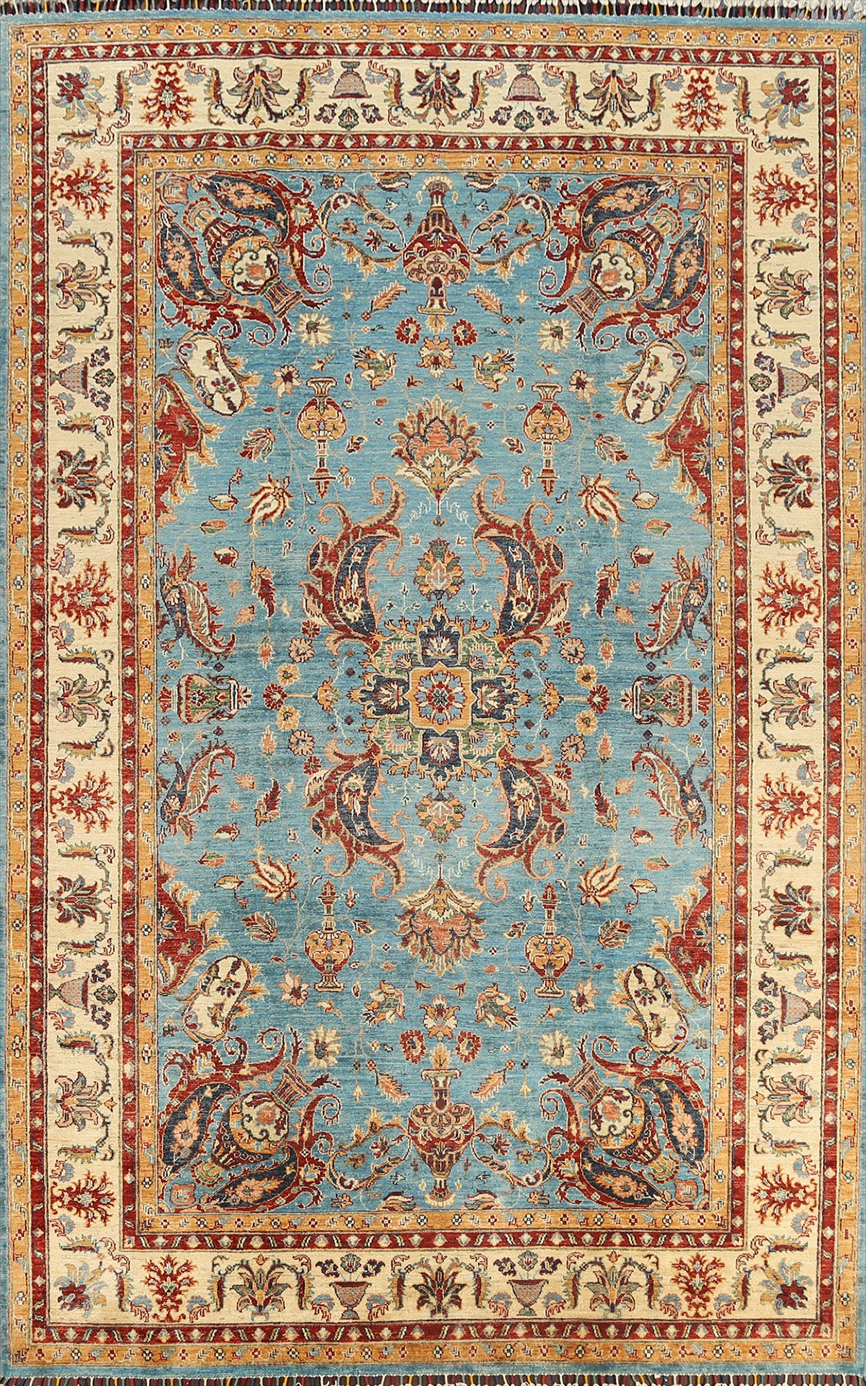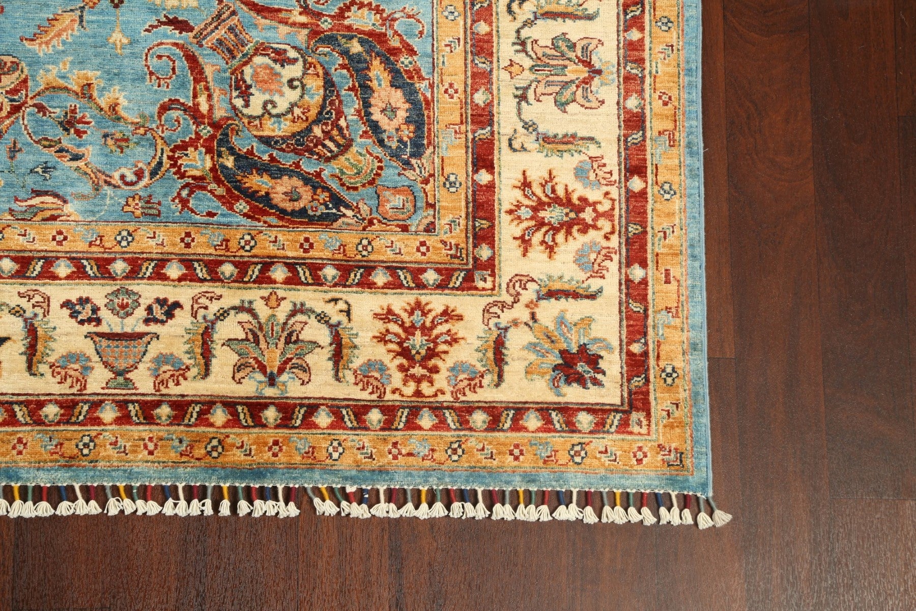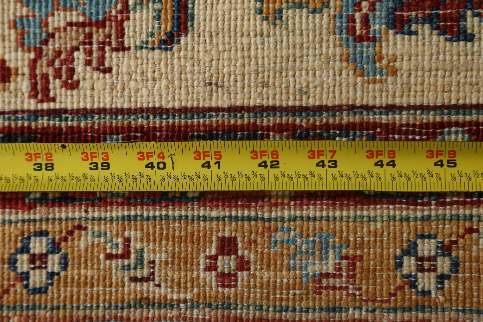 A Beautiful Genuine Pakistan Kazak rug is Hand Knotted by skillful weavers in Pakistan with 100% Wool Material. This rug is in New, First Quality condition. dimensions are 9' 9'' X 6' 10'' in foot and 297 X 208 in centimeter. the primary color is Navy Blue & Blues.