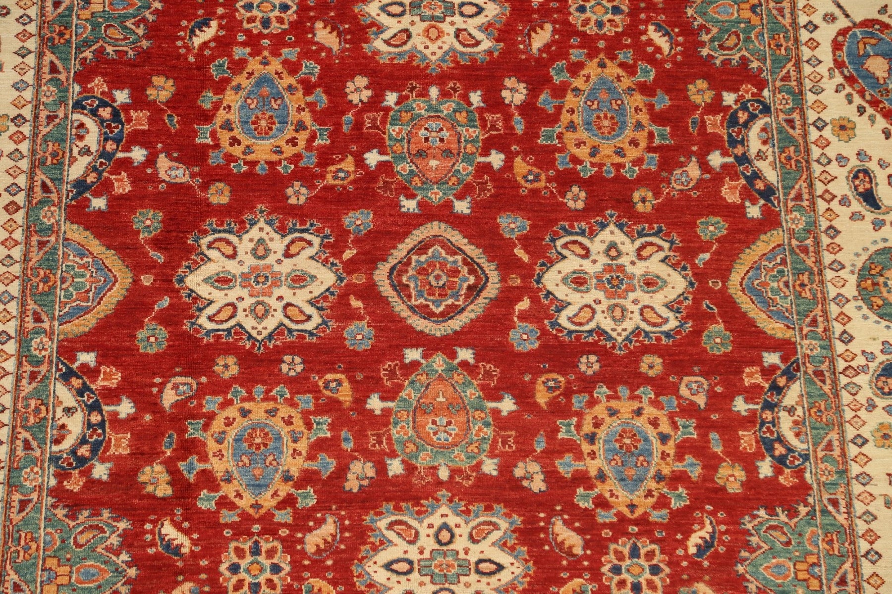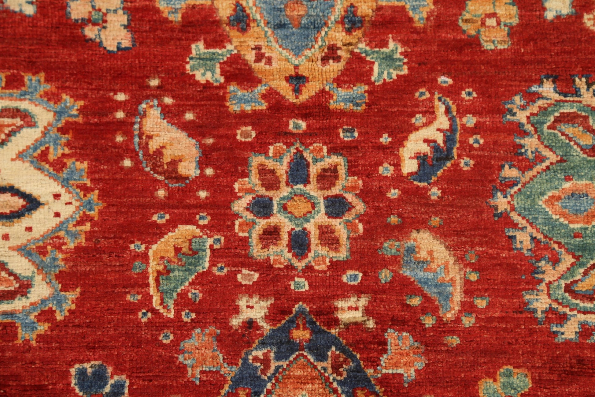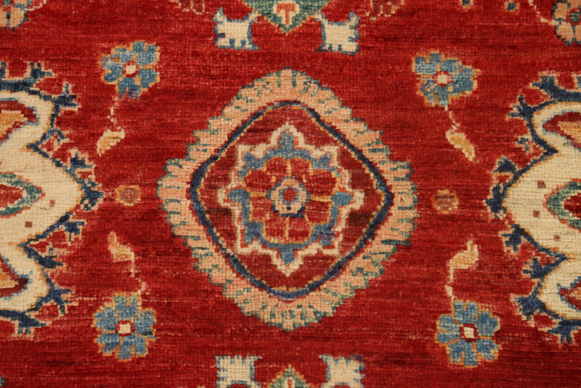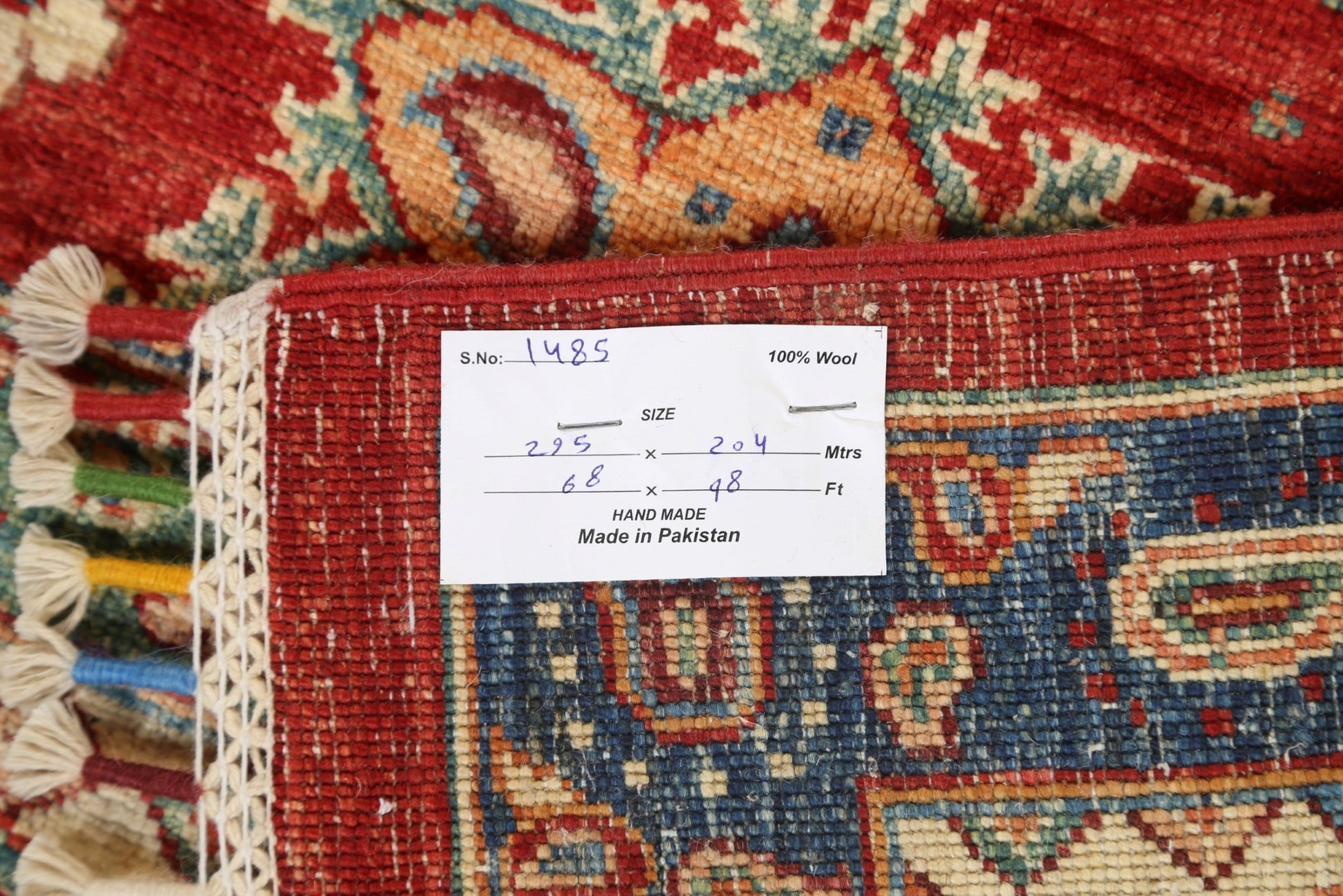 A Beautiful Genuine Pakistan Kazak rug is Hand Knotted by skillful weavers in Pakistan with 100% Wool Material. This rug is in New, First Quality condition. dimensions are 9' 8'' X 6' 8'' in foot and 295 X 203 in centimeter. the primary color is Red.