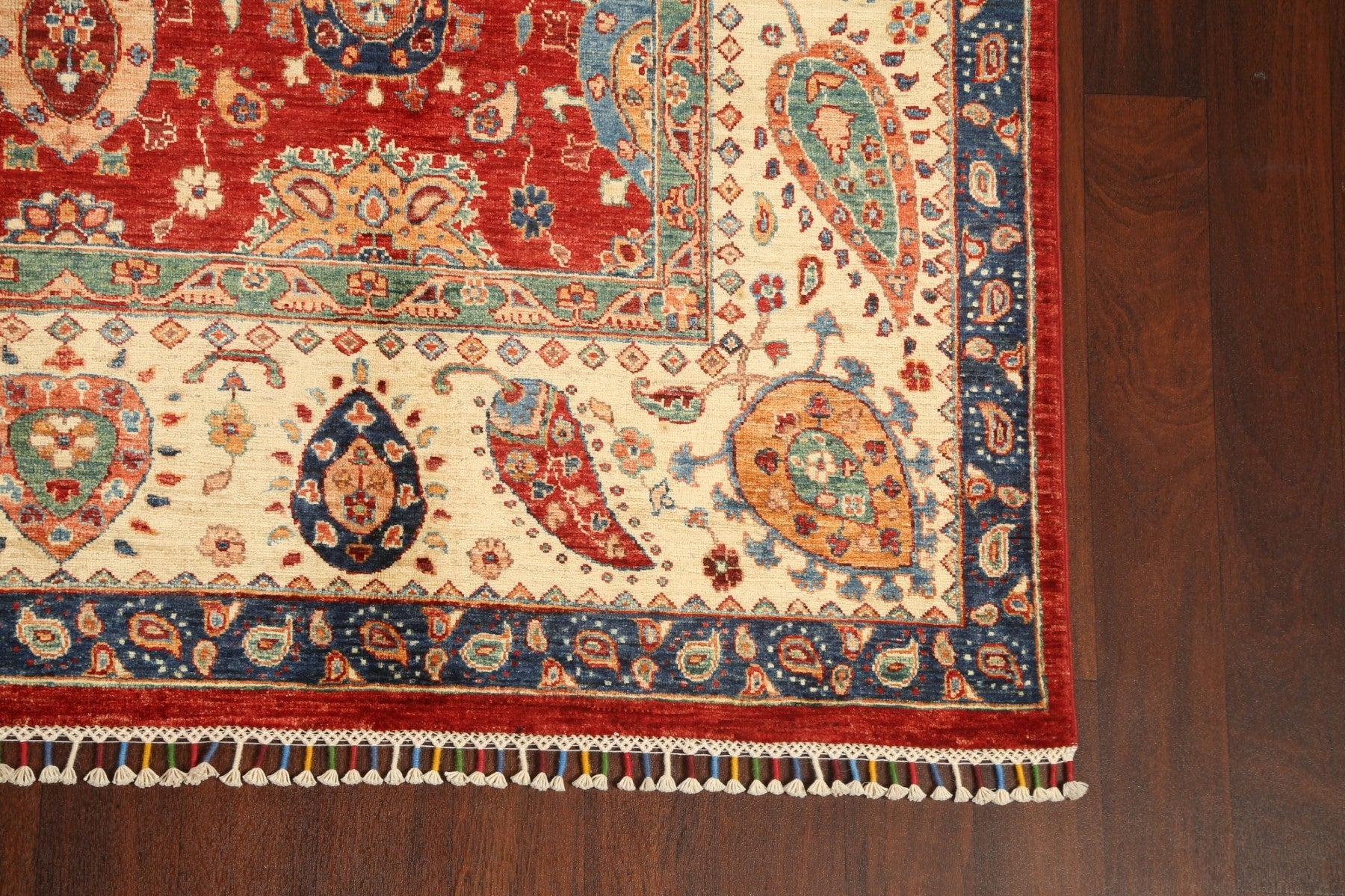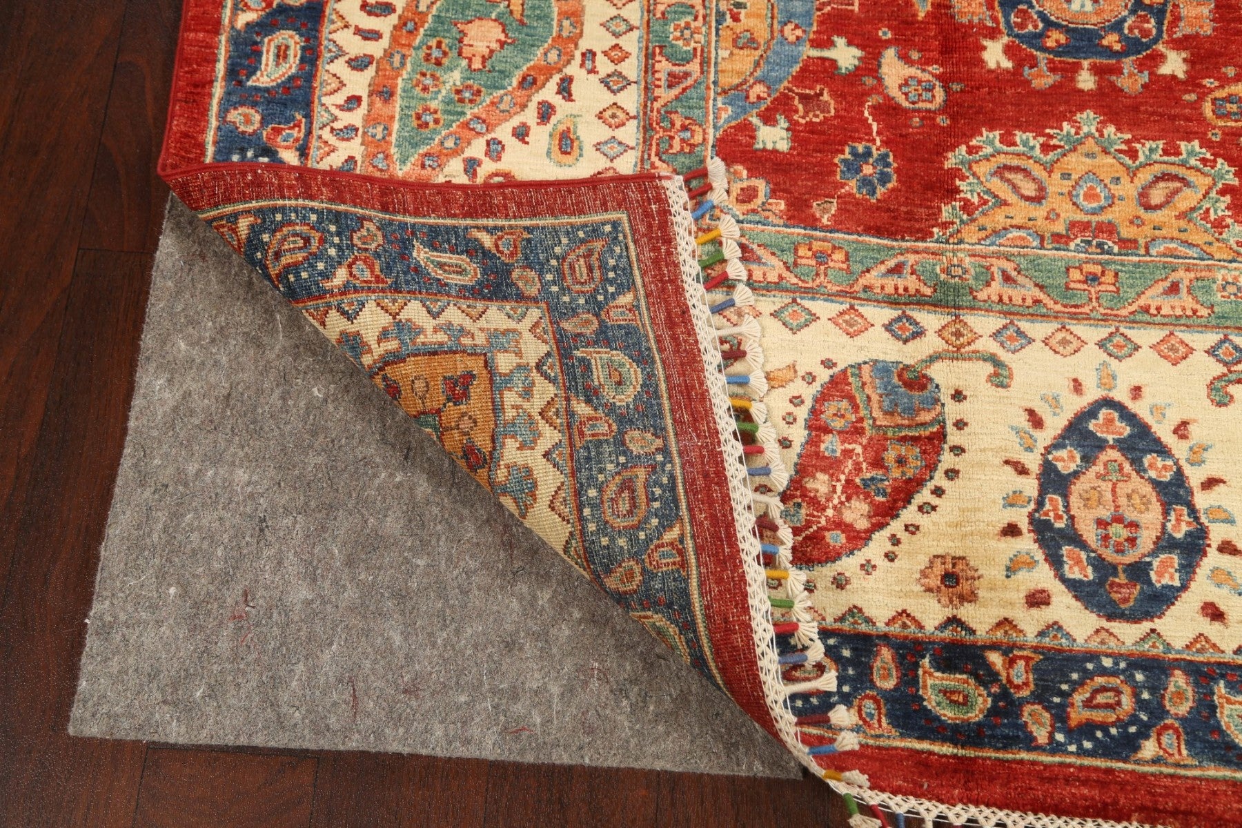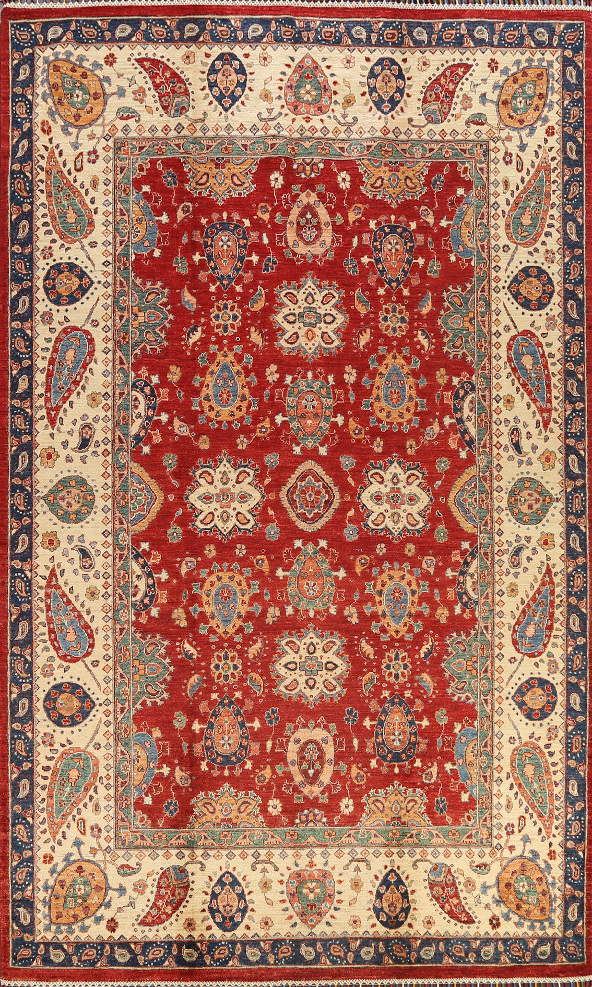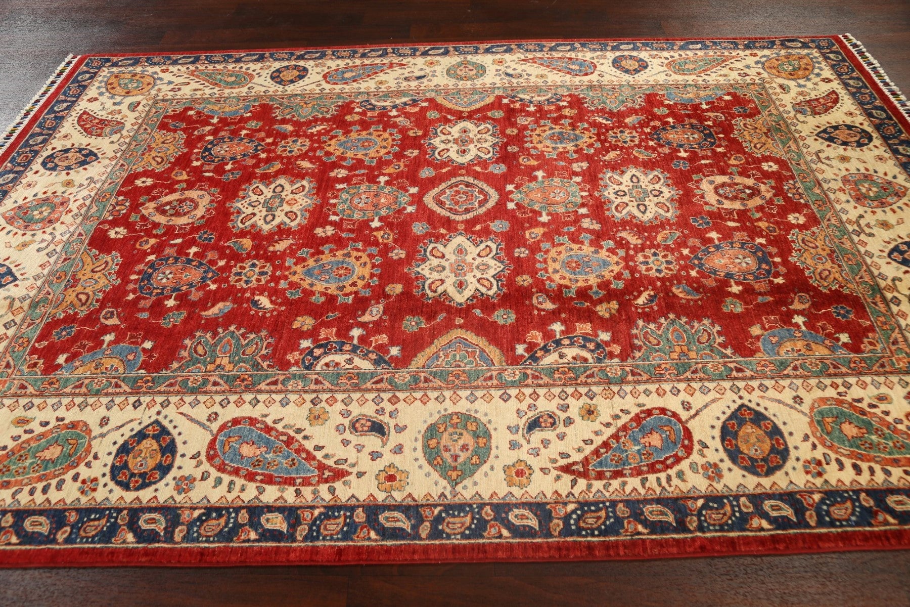 A Beautiful Genuine Pakistan Kazak rug is Hand Knotted by skillful weavers in Pakistan with 100% Wool Material. This rug is in New, First Quality condition. dimensions are 9' 8'' X 6' 8'' in foot and 295 X 203 in centimeter. the primary color is Red.