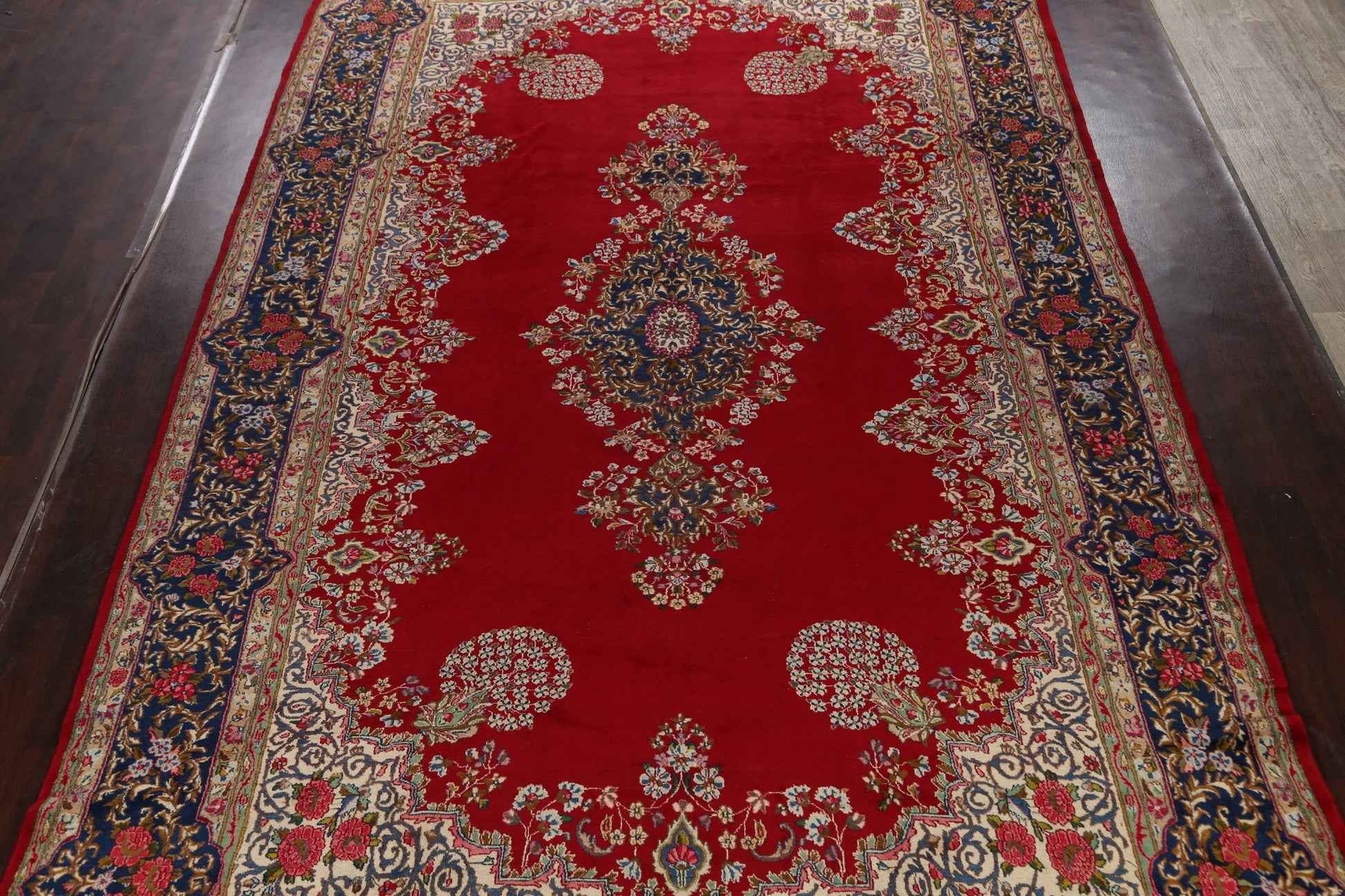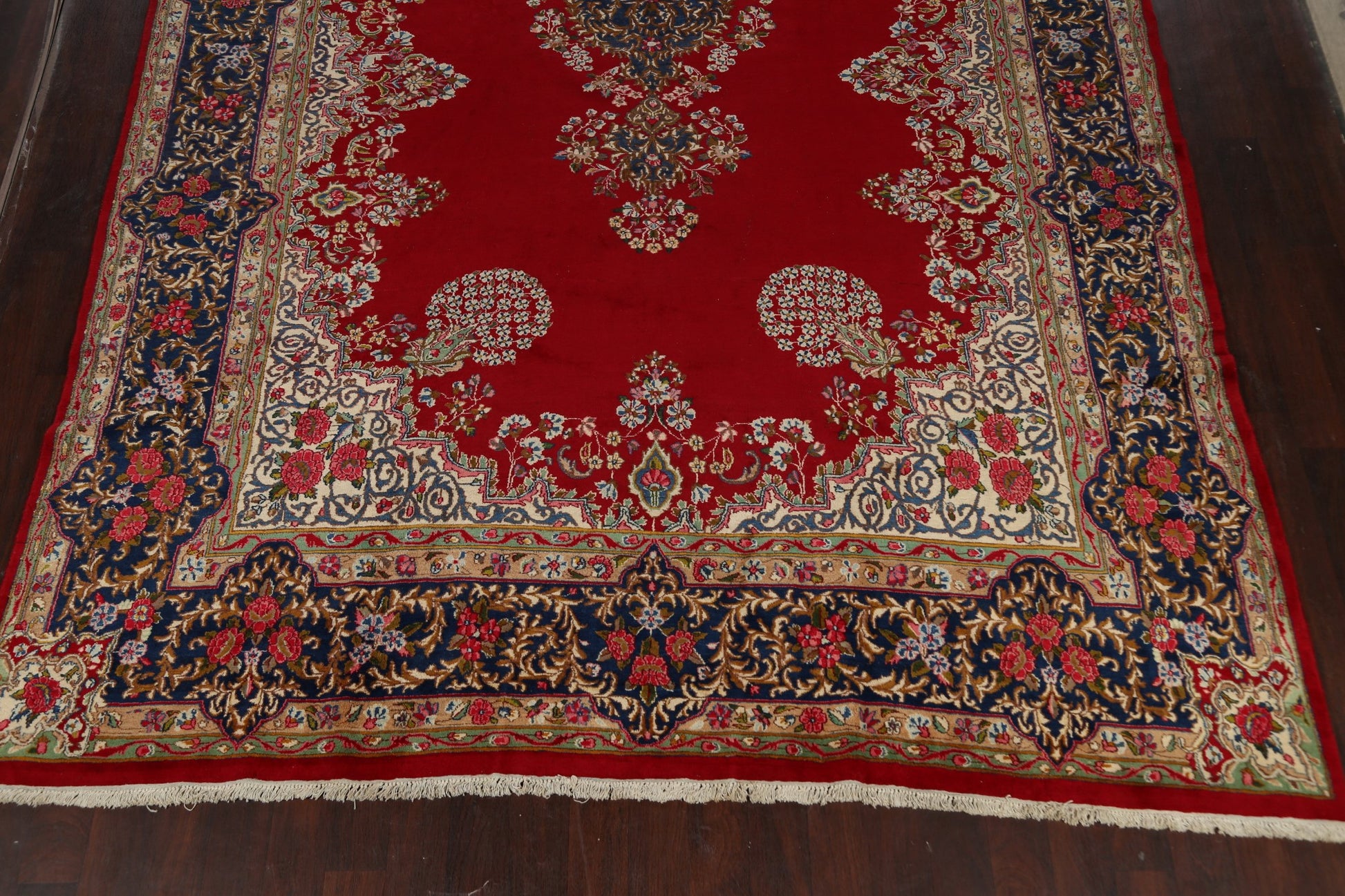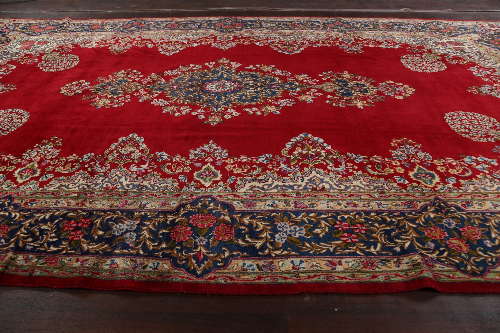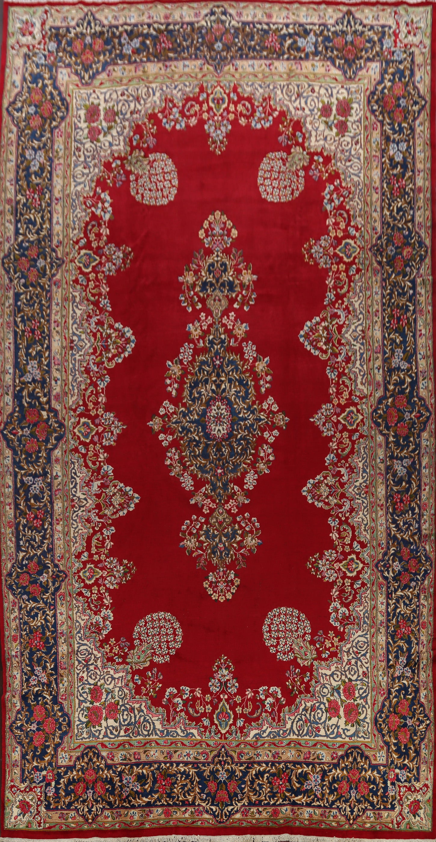 A Beautiful Genuine Persia ( Persia ) Kerman rug is Hand Knotted by skillful weavers in Persia ( Persia ) with 100% Wool Material. This rug is in Very Good condition. dimensions are 16' 9'' X 9' 11'' in foot and 511 X 302 in centimeter. the primary color is Red.