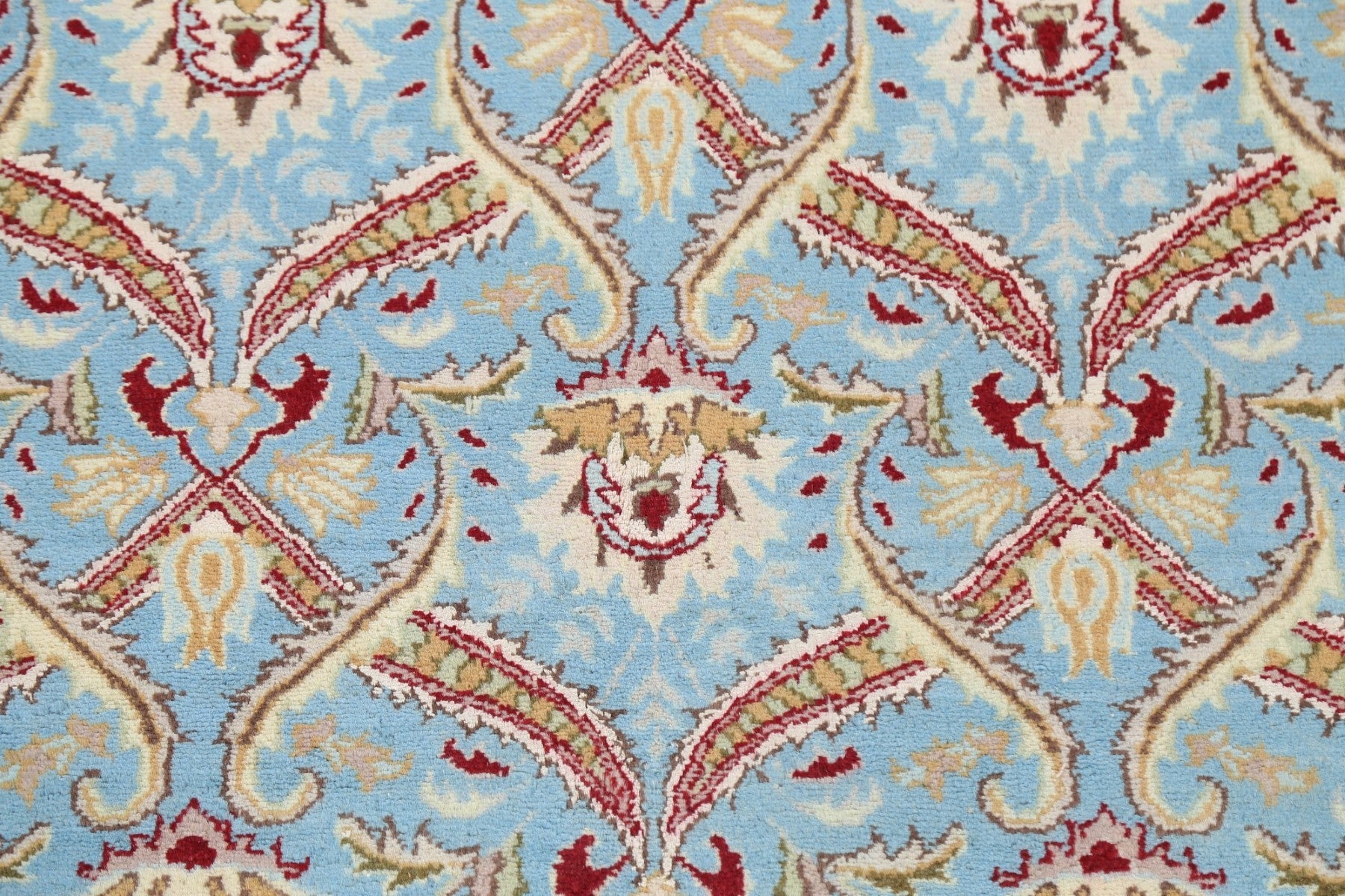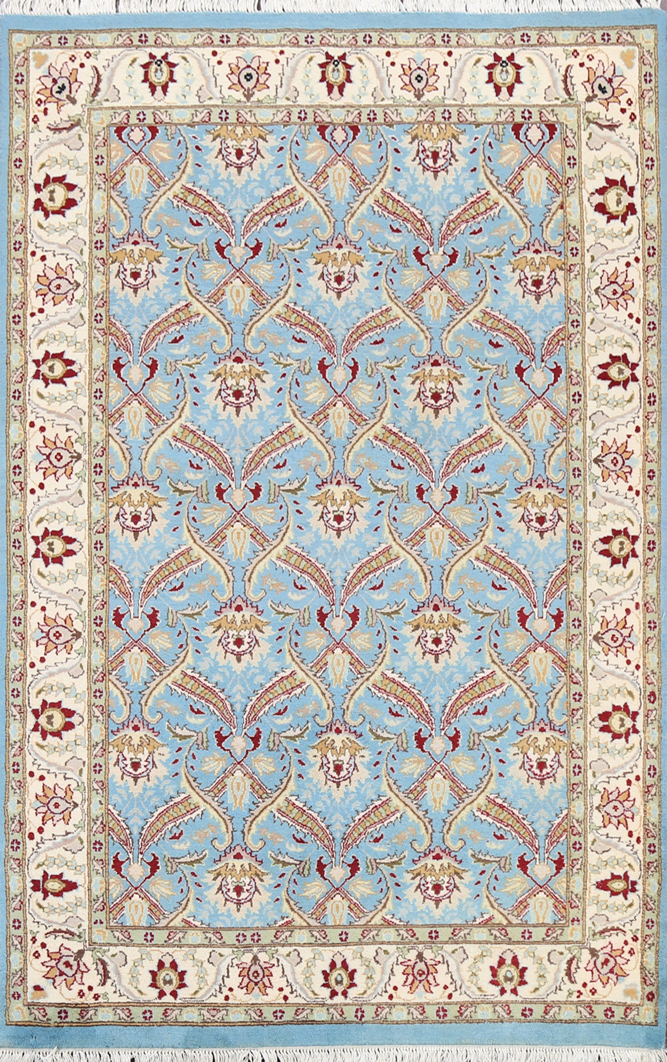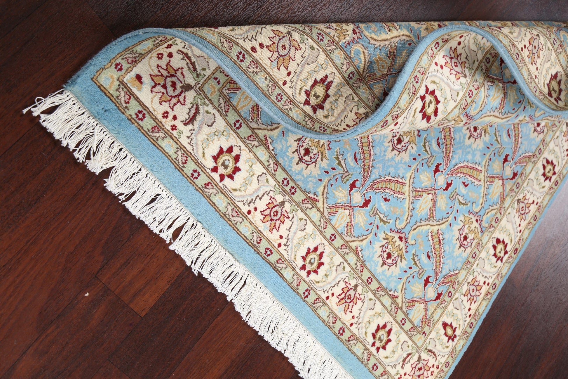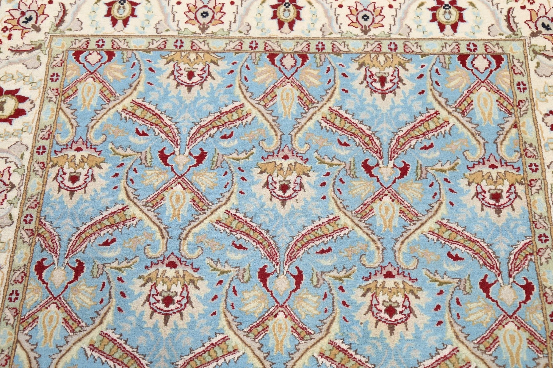 A Beautiful Genuine Pakistan Tabriz rug is Hand Knotted by skillful weavers in Pakistan with Wool & Silk Material. This rug is in New, First Quality condition. dimensions are 5' 11'' X 4' 0'' in foot and 180 X 122 in centimeter. the primary color is Navy Blue & Blues.