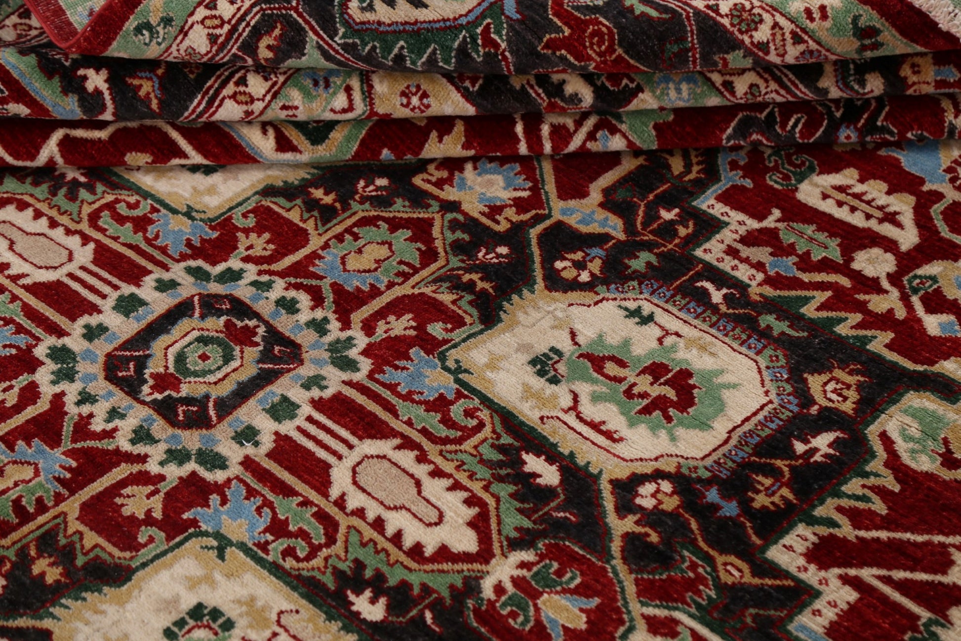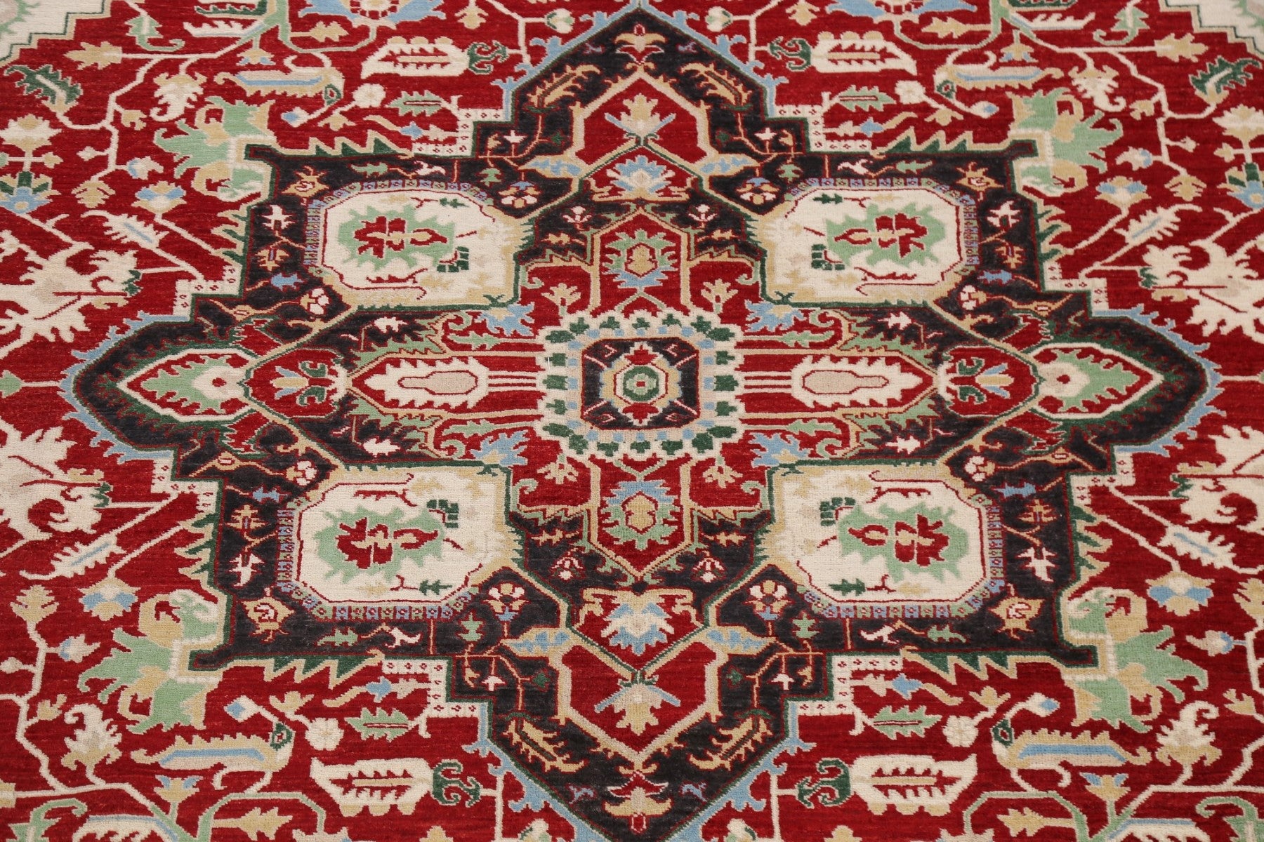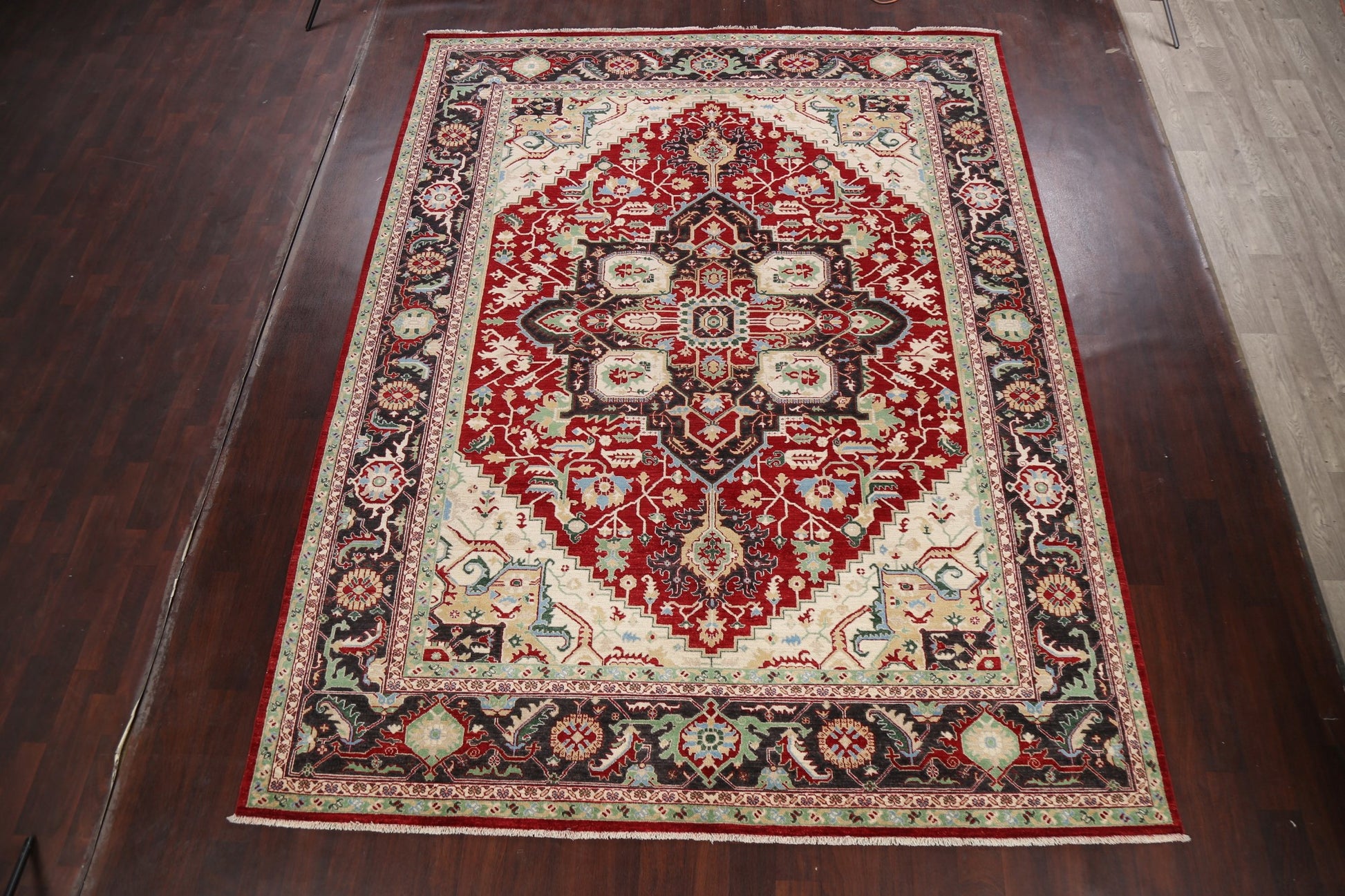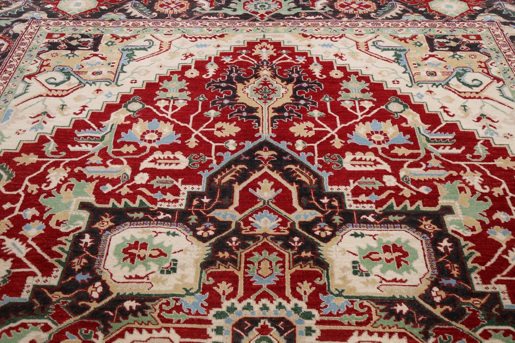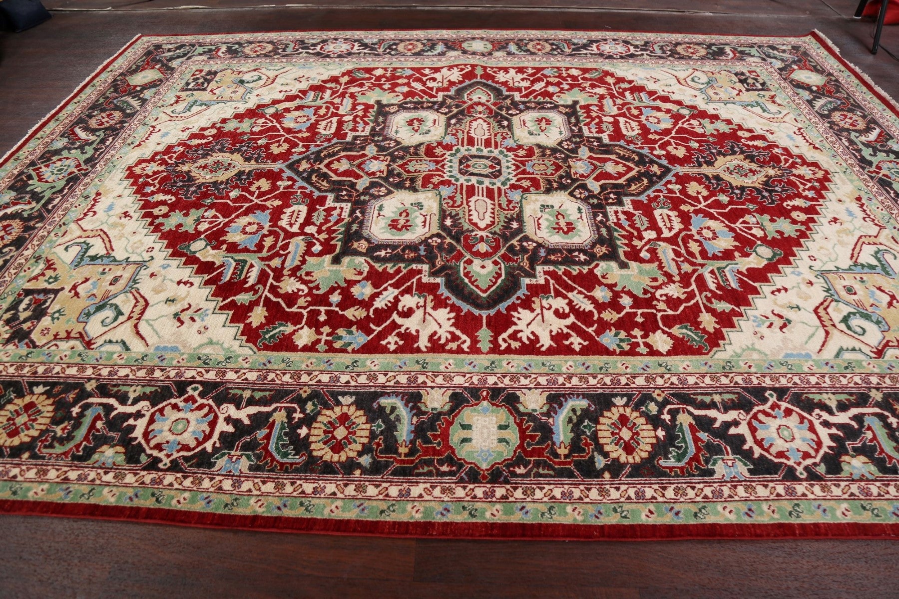 A Beautiful Genuine Pakistan Heriz rug is Hand Knotted by skillful weavers in Pakistan with 100% Wool Material. This rug is in New, First Quality condition. dimensions are 11' 8'' X 9' 0'' in foot and 356 X 274 in centimeter. the primary color is Red.
