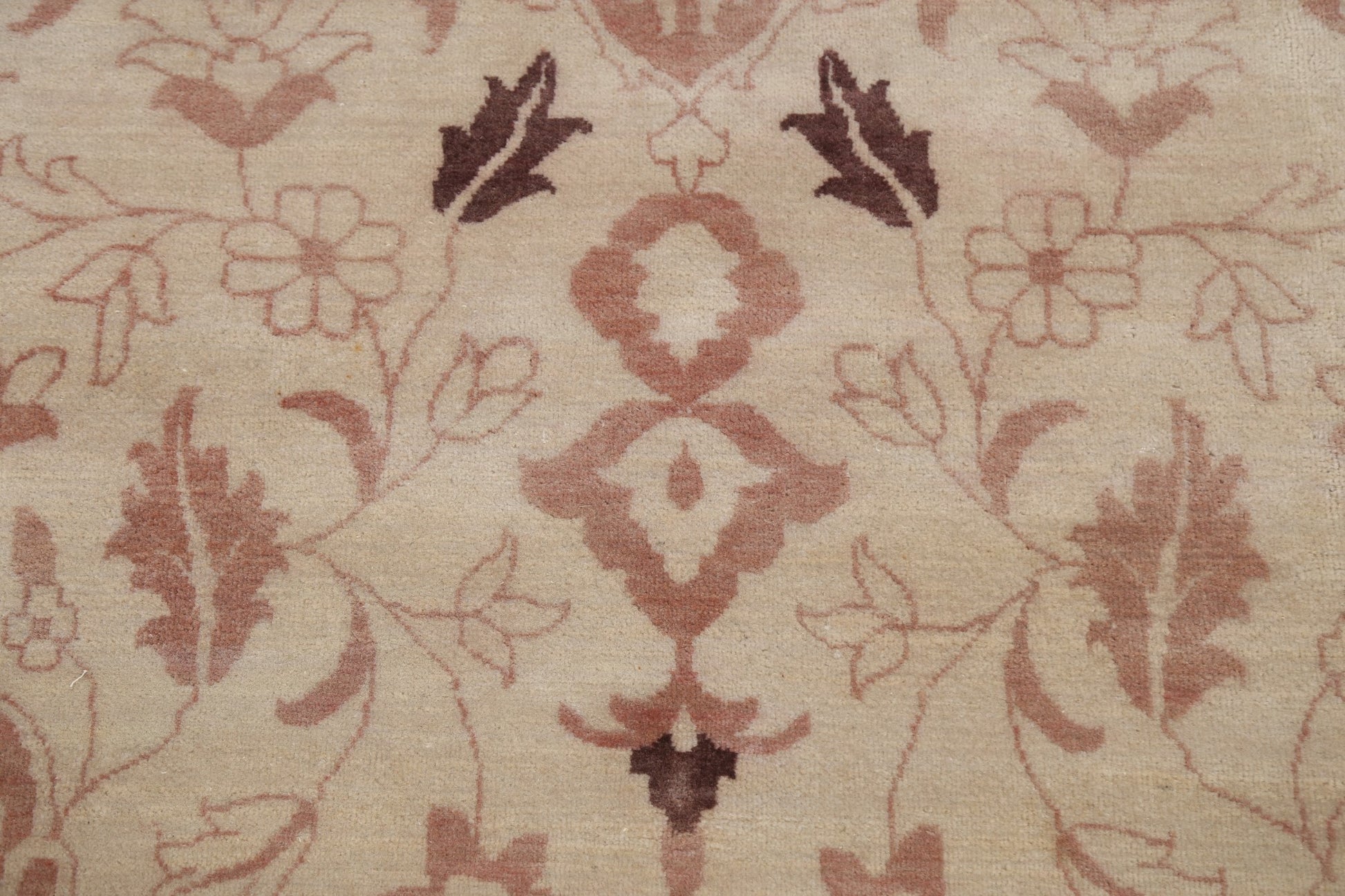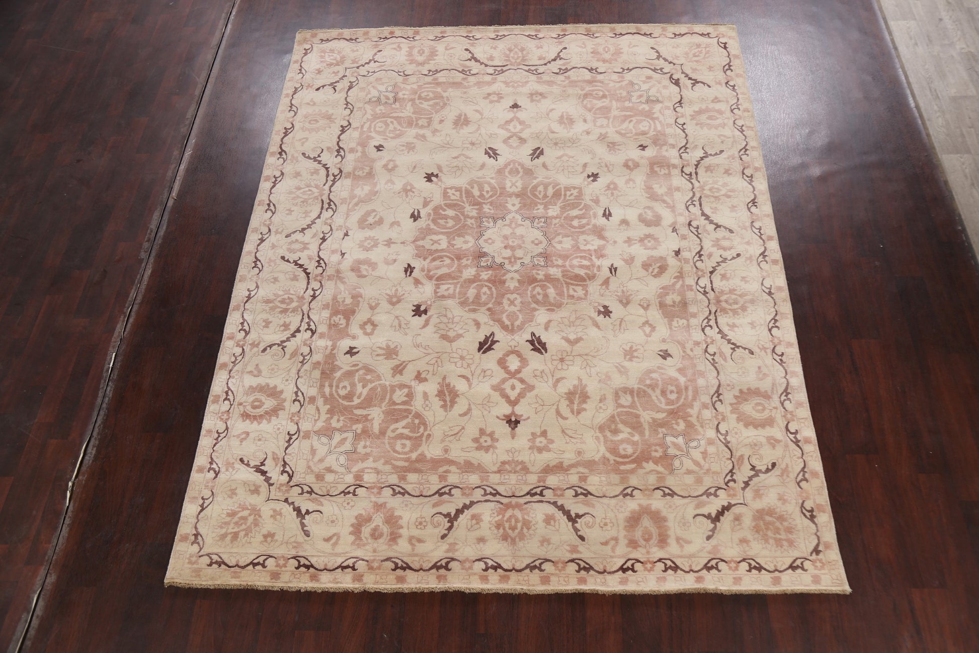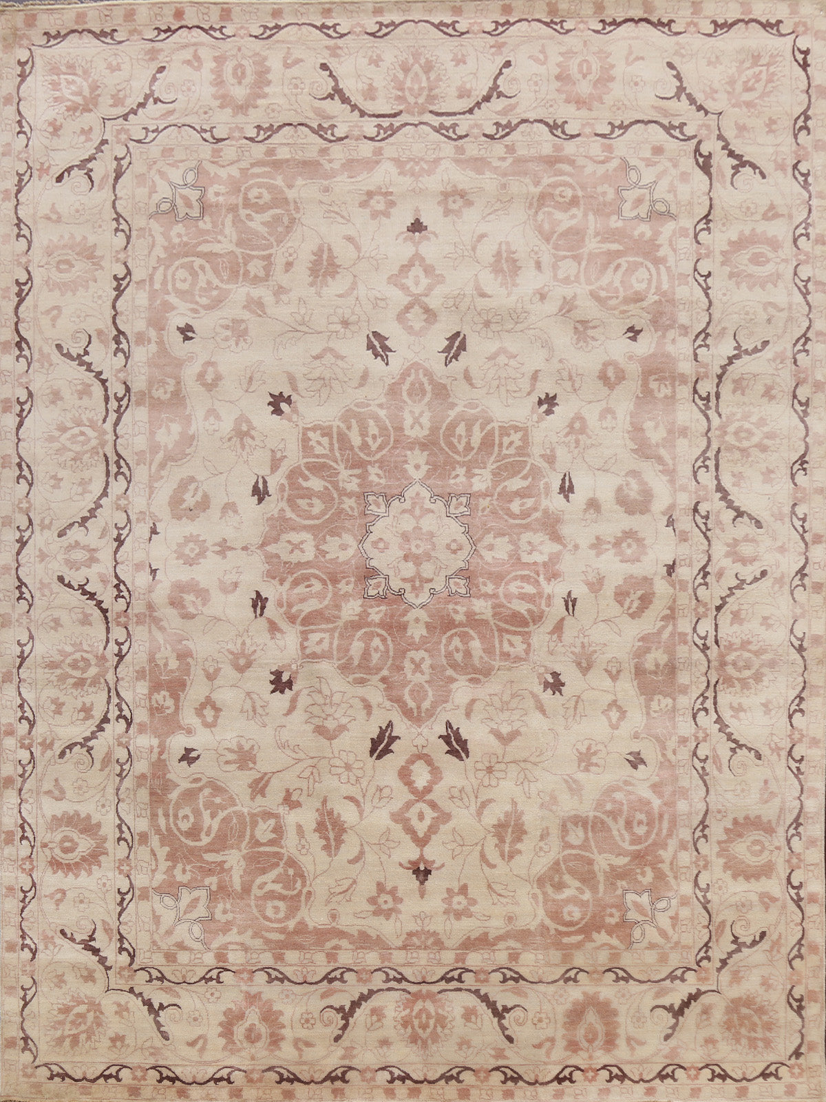 A Beautiful Genuine India Kashan rug is Hand Knotted by skillful weavers in India with 100% Wool Material. This rug is in New, First Quality condition. dimensions are 9' 11'' X 8' 0'' in foot and 302 X 244 in centimeter. the primary color is Beige & Ivories.