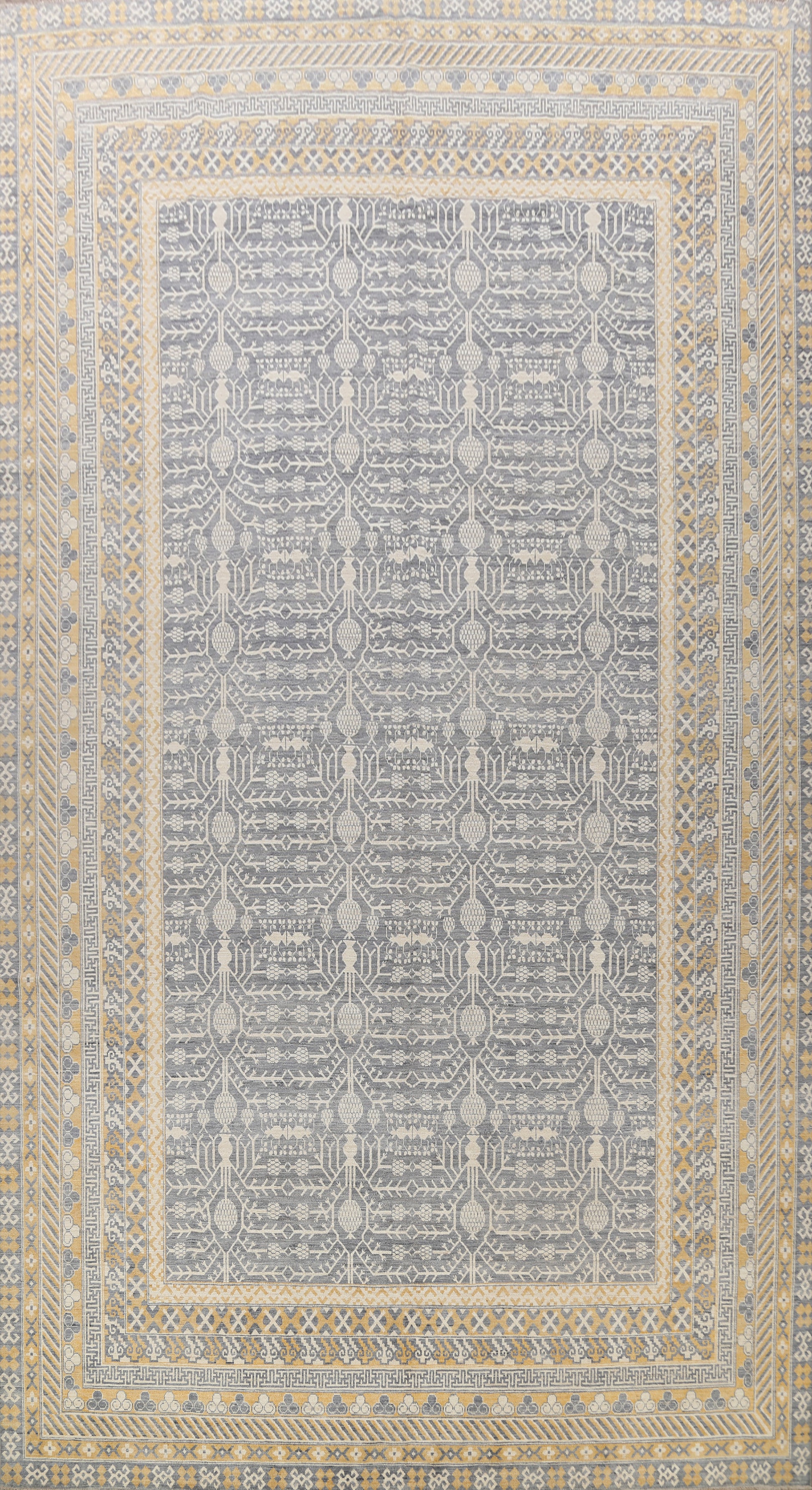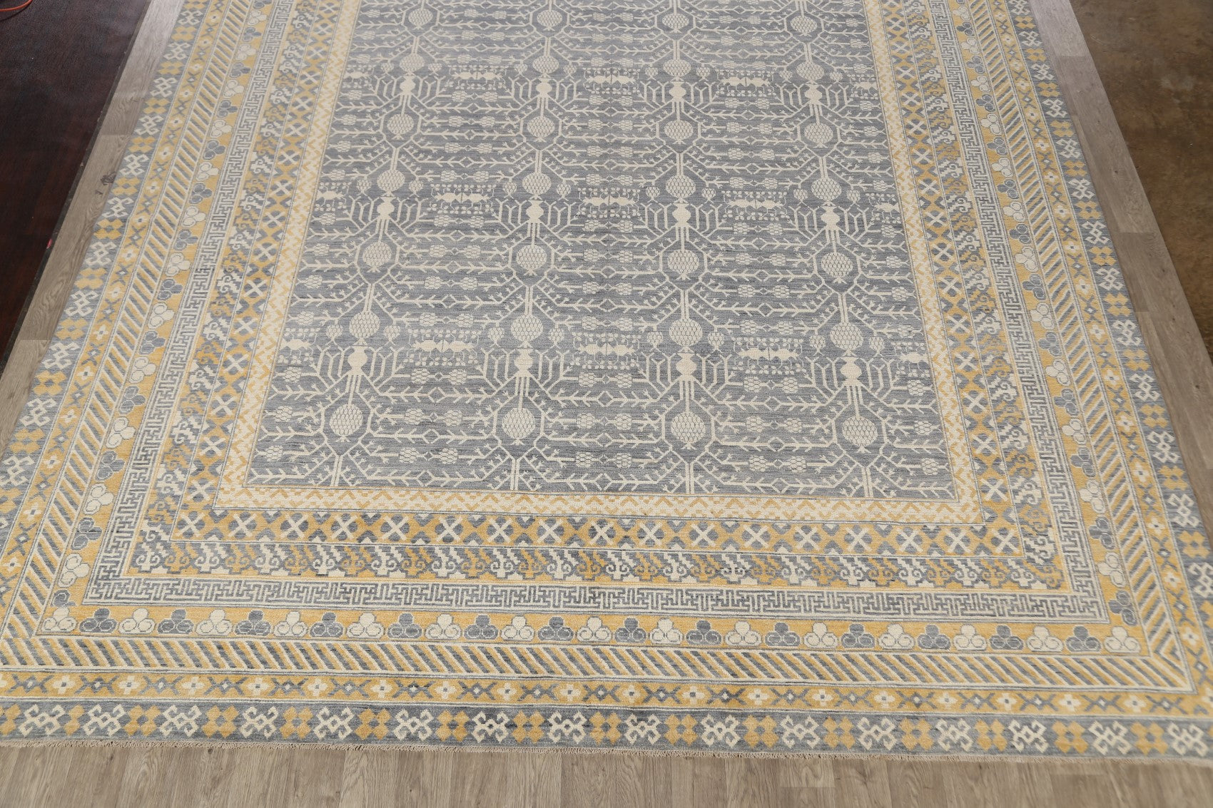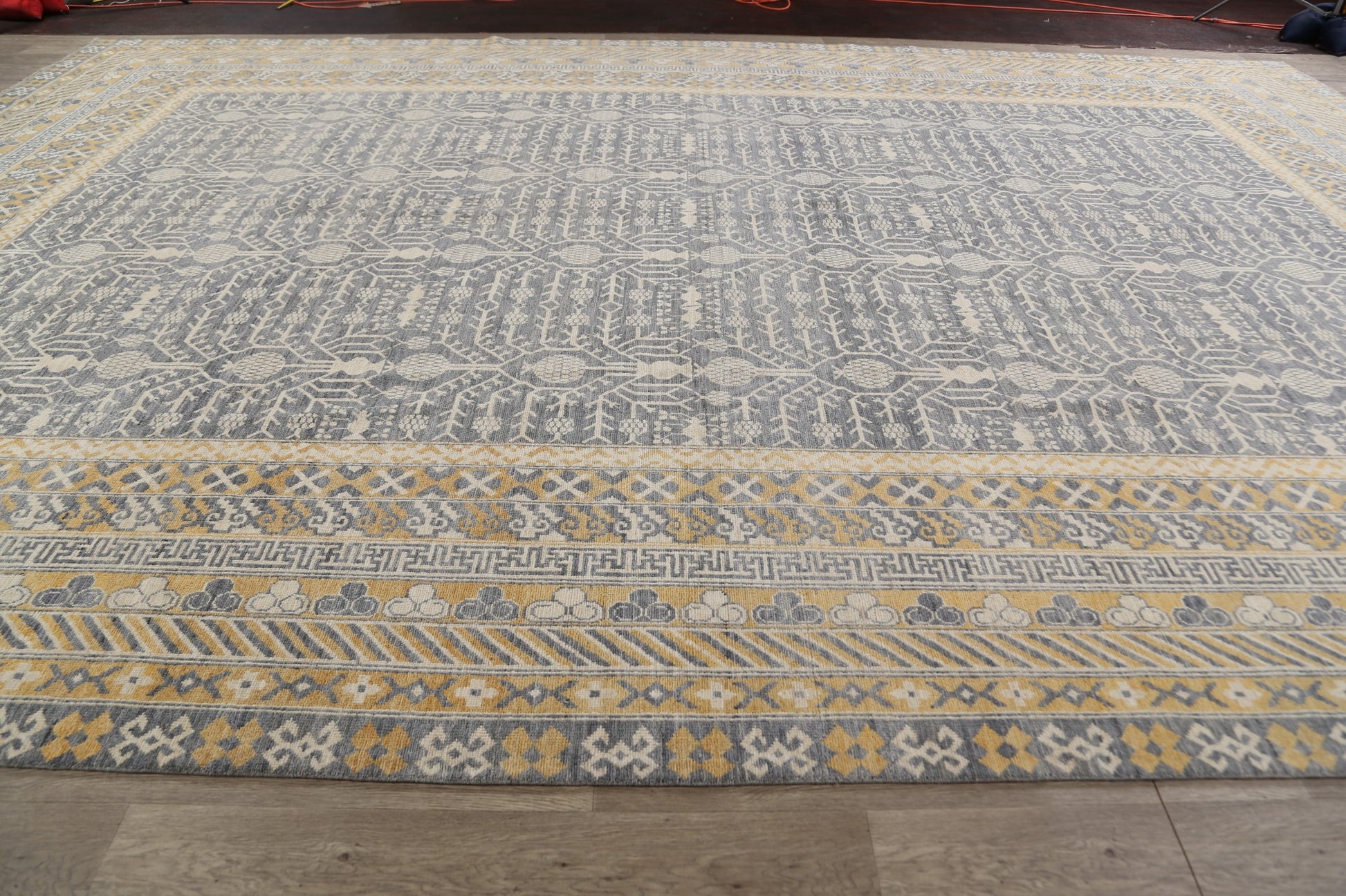 A Beautiful Genuine Pakistan Khotan rug is Hand Knotted by skillful weavers in Pakistan with 100% Wool Material. This rug is in New, First Quality condition. dimensions are 17' 11'' X 12' 2'' in foot and 546 X 371 in centimeter. the primary color is Greys & Charcoal.