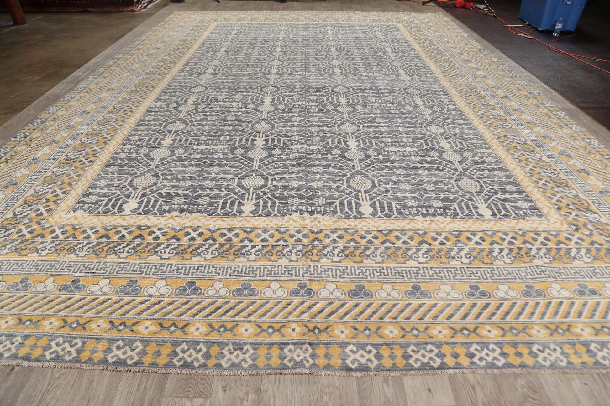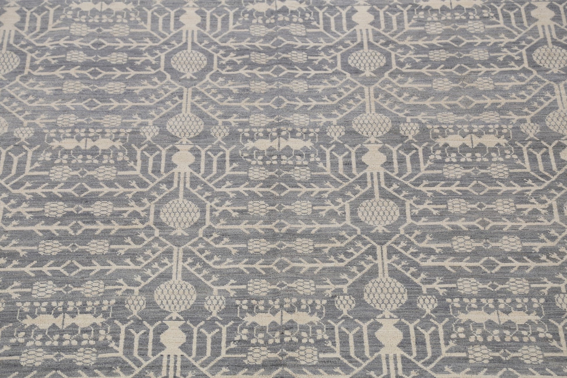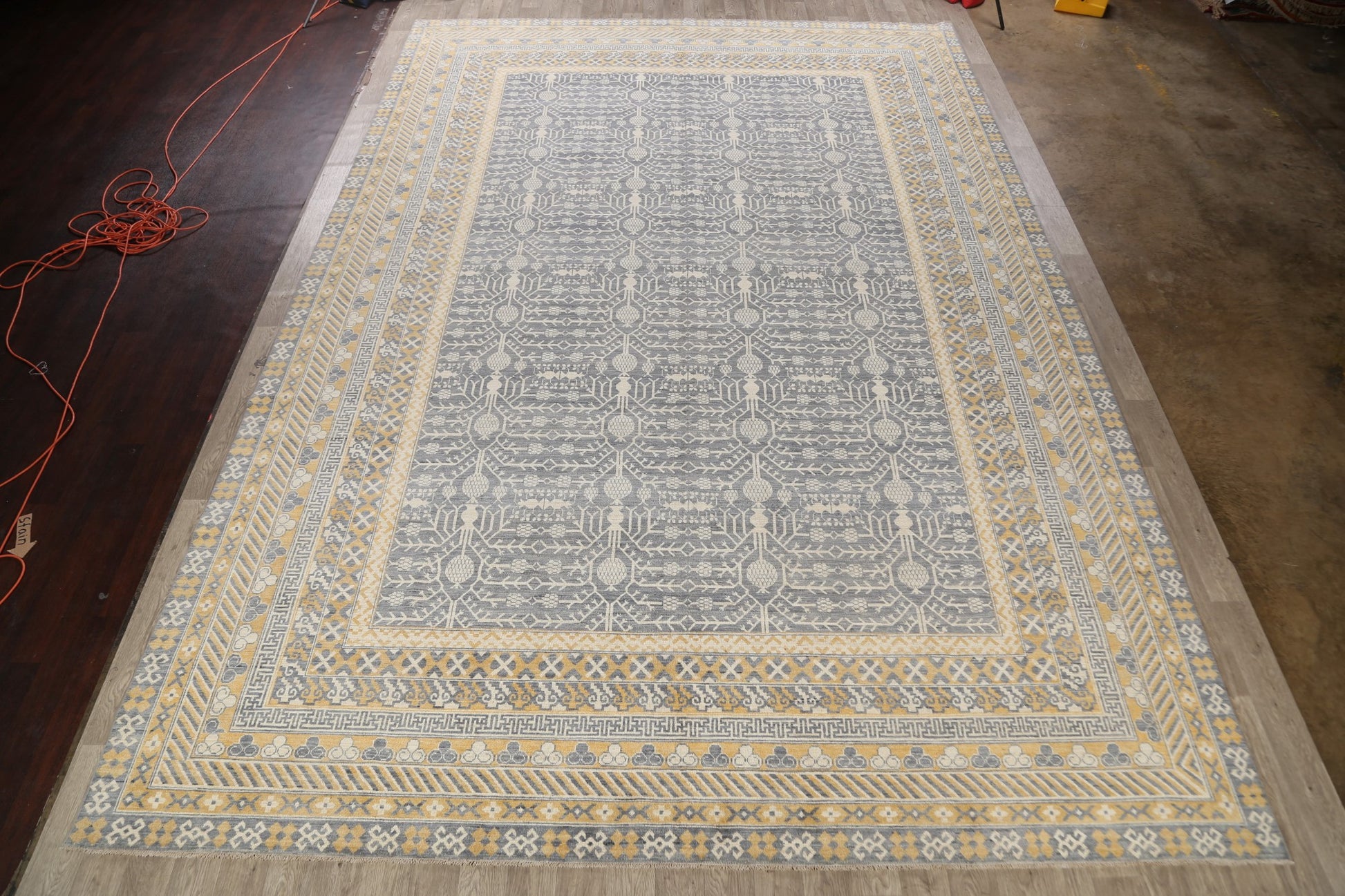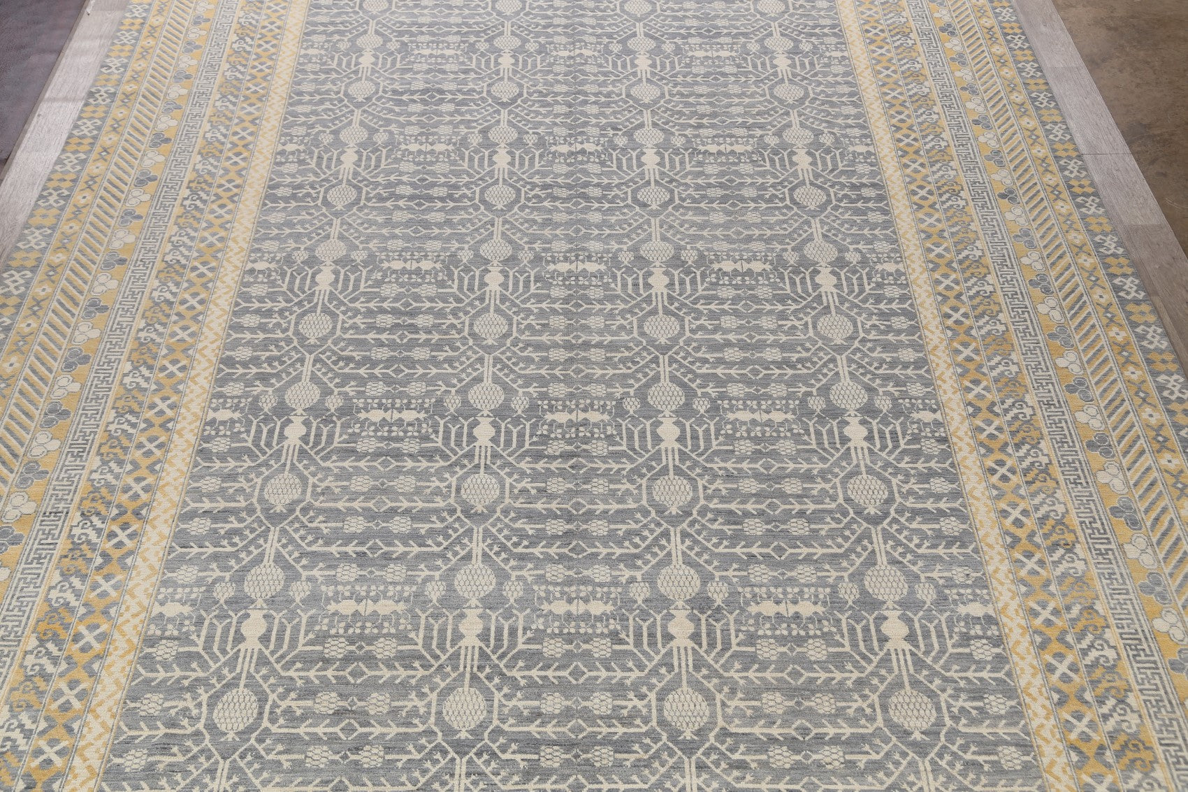 A Beautiful Genuine Pakistan Khotan rug is Hand Knotted by skillful weavers in Pakistan with 100% Wool Material. This rug is in New, First Quality condition. dimensions are 17' 11'' X 12' 2'' in foot and 546 X 371 in centimeter. the primary color is Greys & Charcoal.