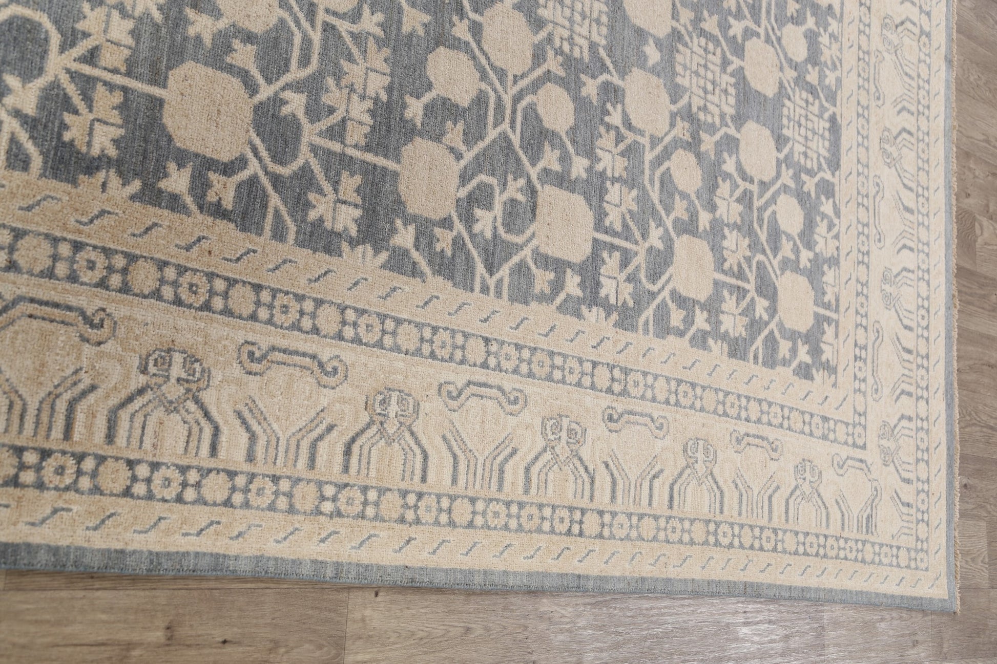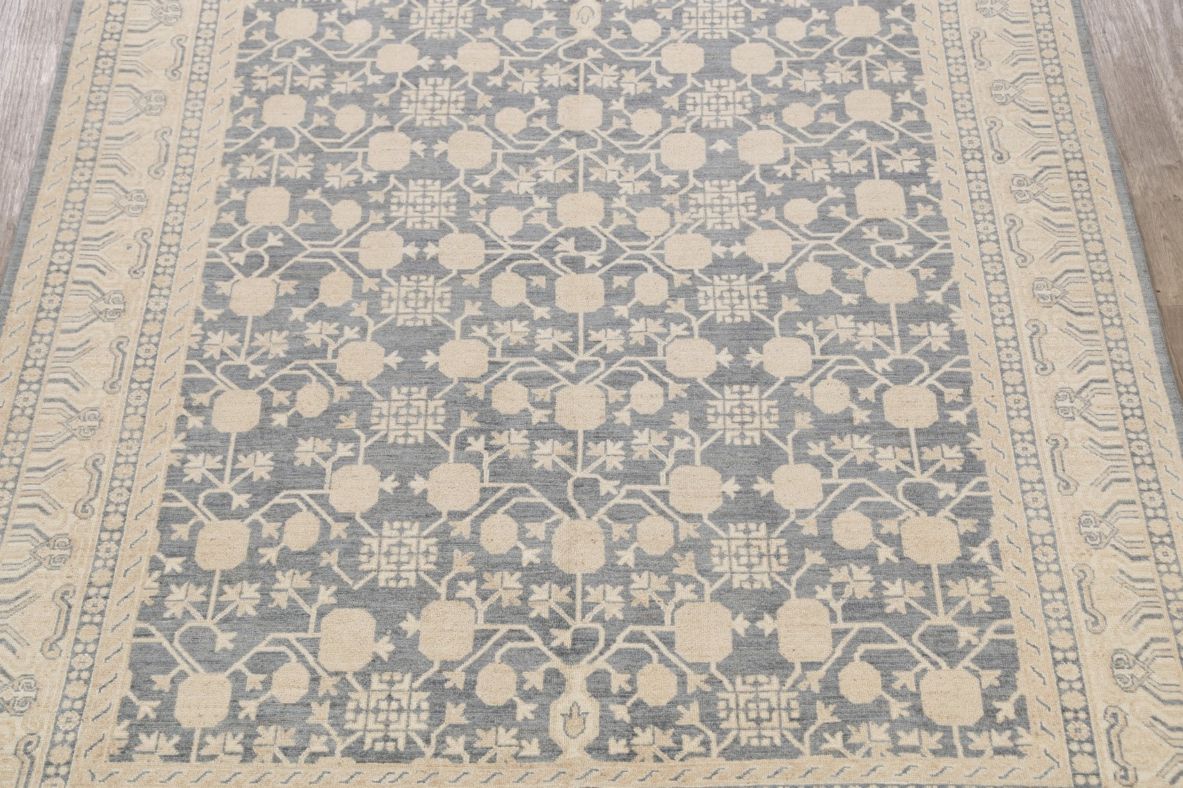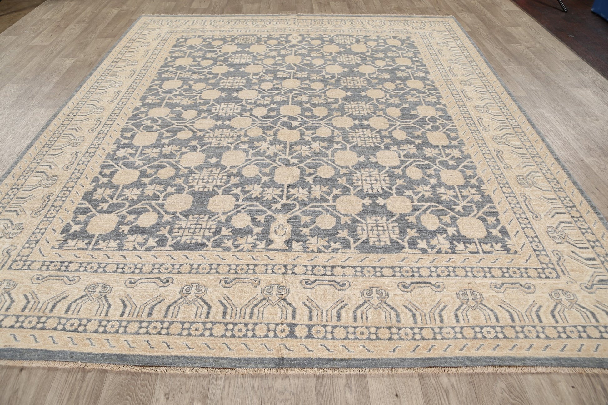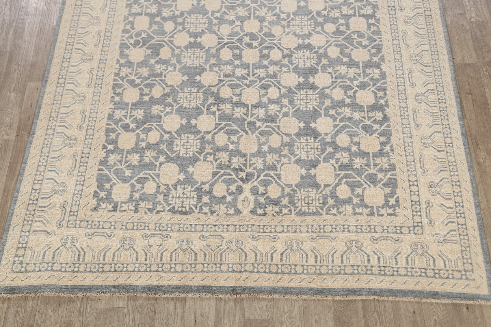 A Beautiful Genuine Pakistan Khotan rug is Hand Knotted by skillful weavers in Pakistan with 100% Wool Material. This rug is in New, First Quality condition. dimensions are 9' 7'' X 8' 1'' in foot and 292 X 246 in centimeter. the primary color is Greys & Charcoal.