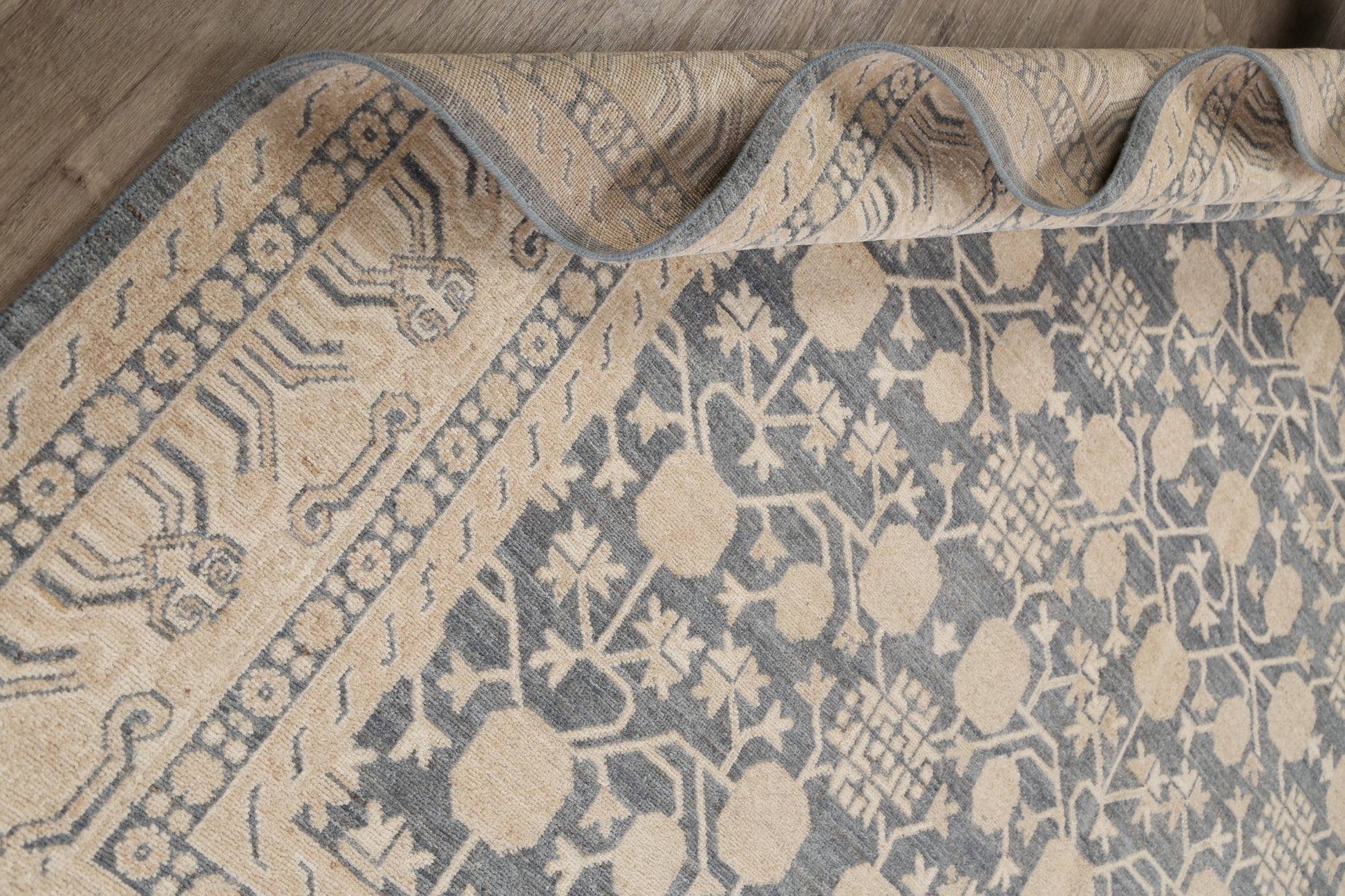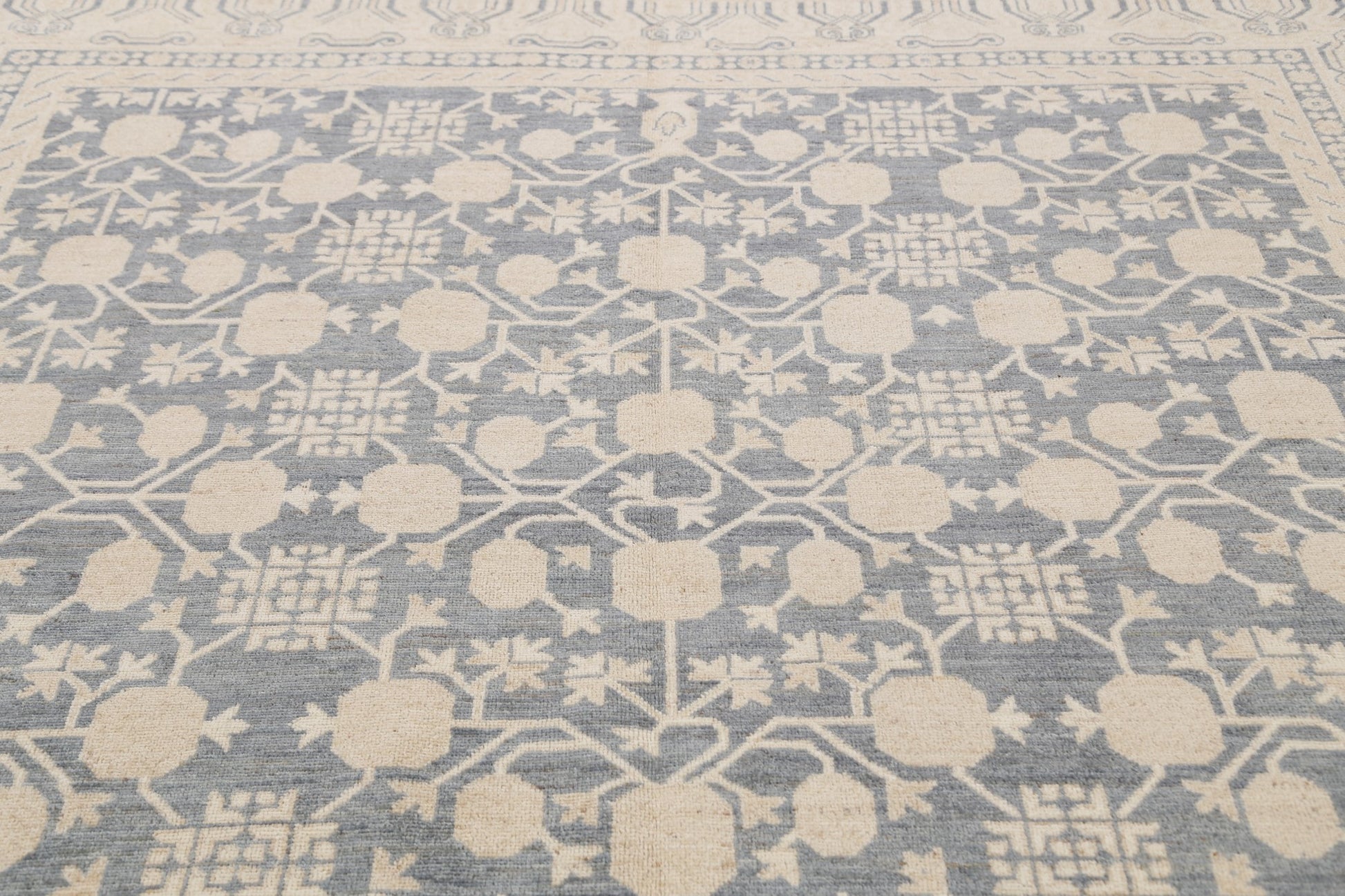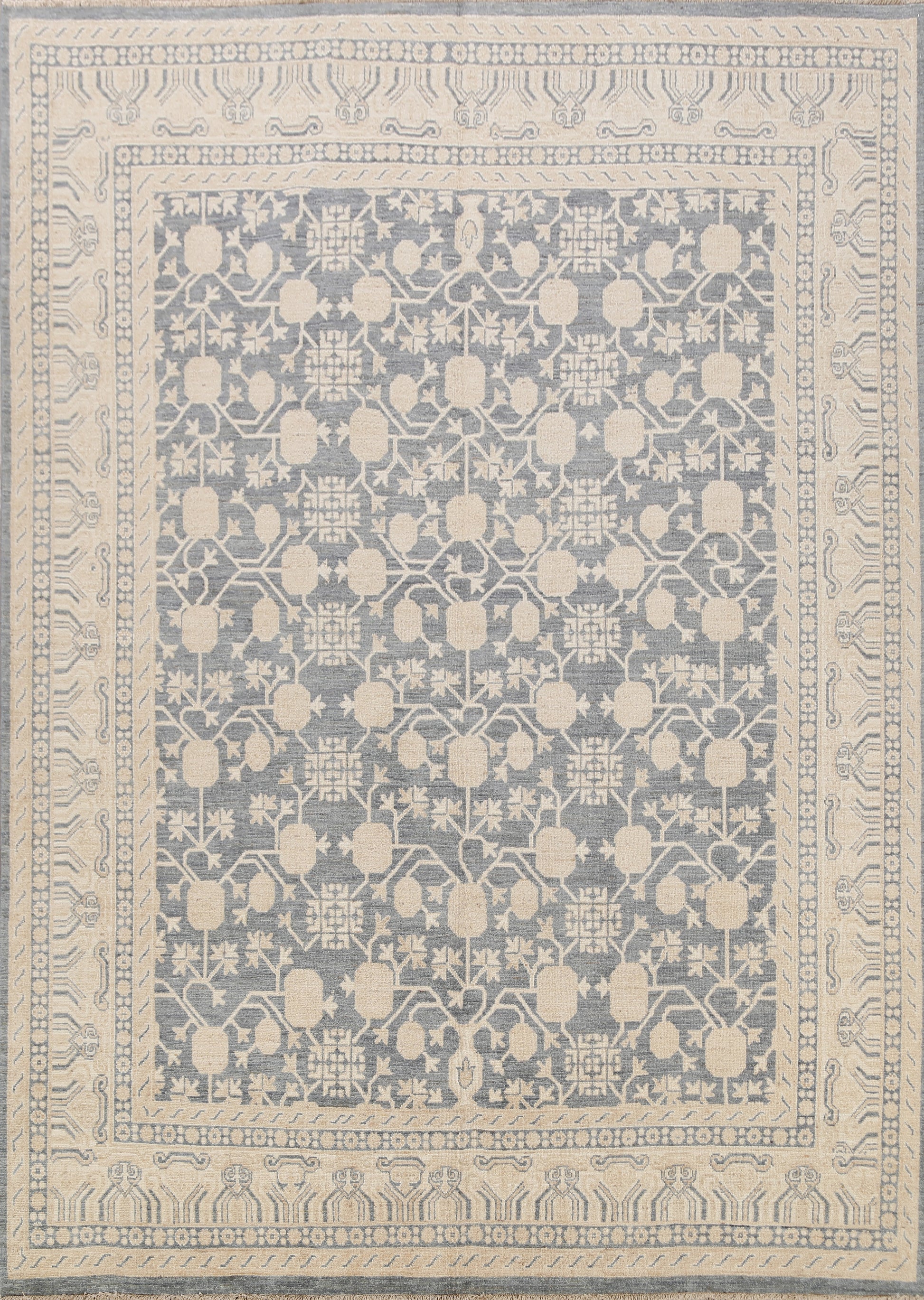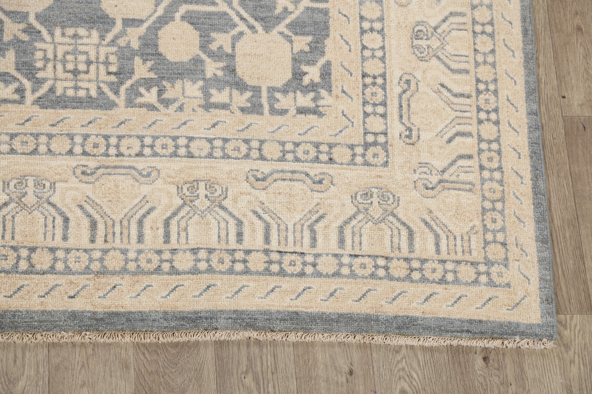 A Beautiful Genuine Pakistan Khotan rug is Hand Knotted by skillful weavers in Pakistan with 100% Wool Material. This rug is in New, First Quality condition. dimensions are 9' 7'' X 8' 1'' in foot and 292 X 246 in centimeter. the primary color is Greys & Charcoal.