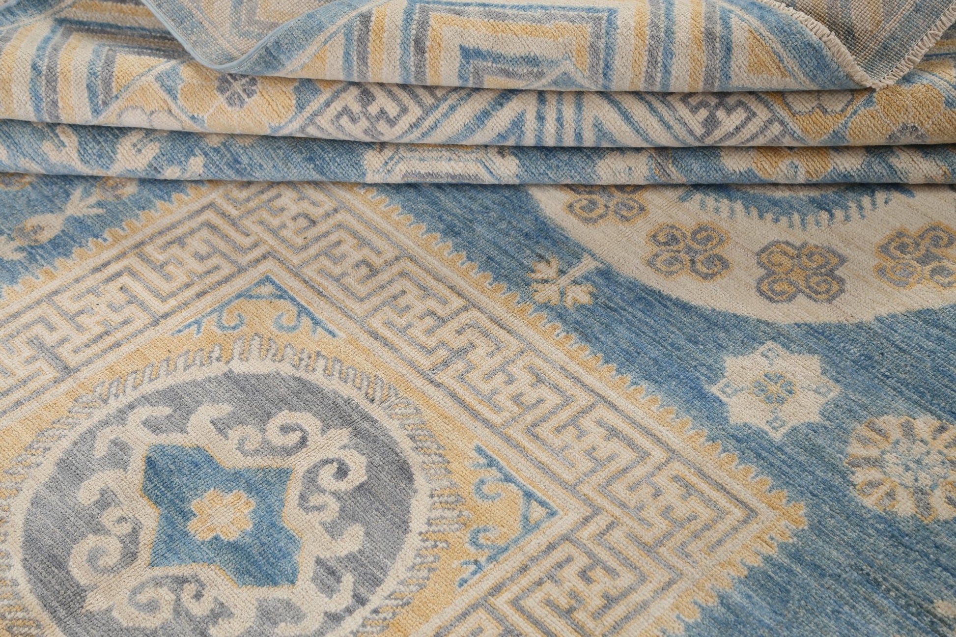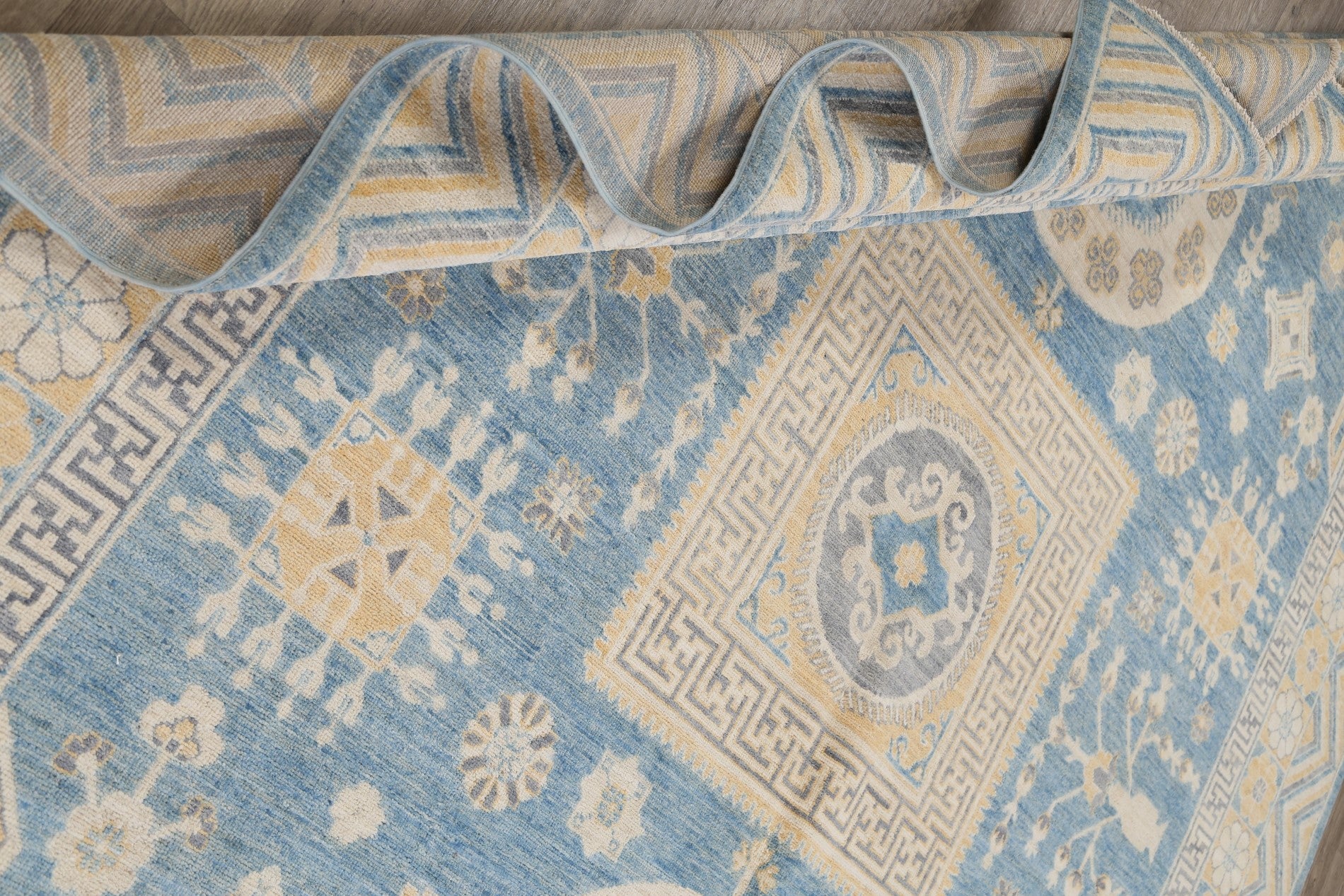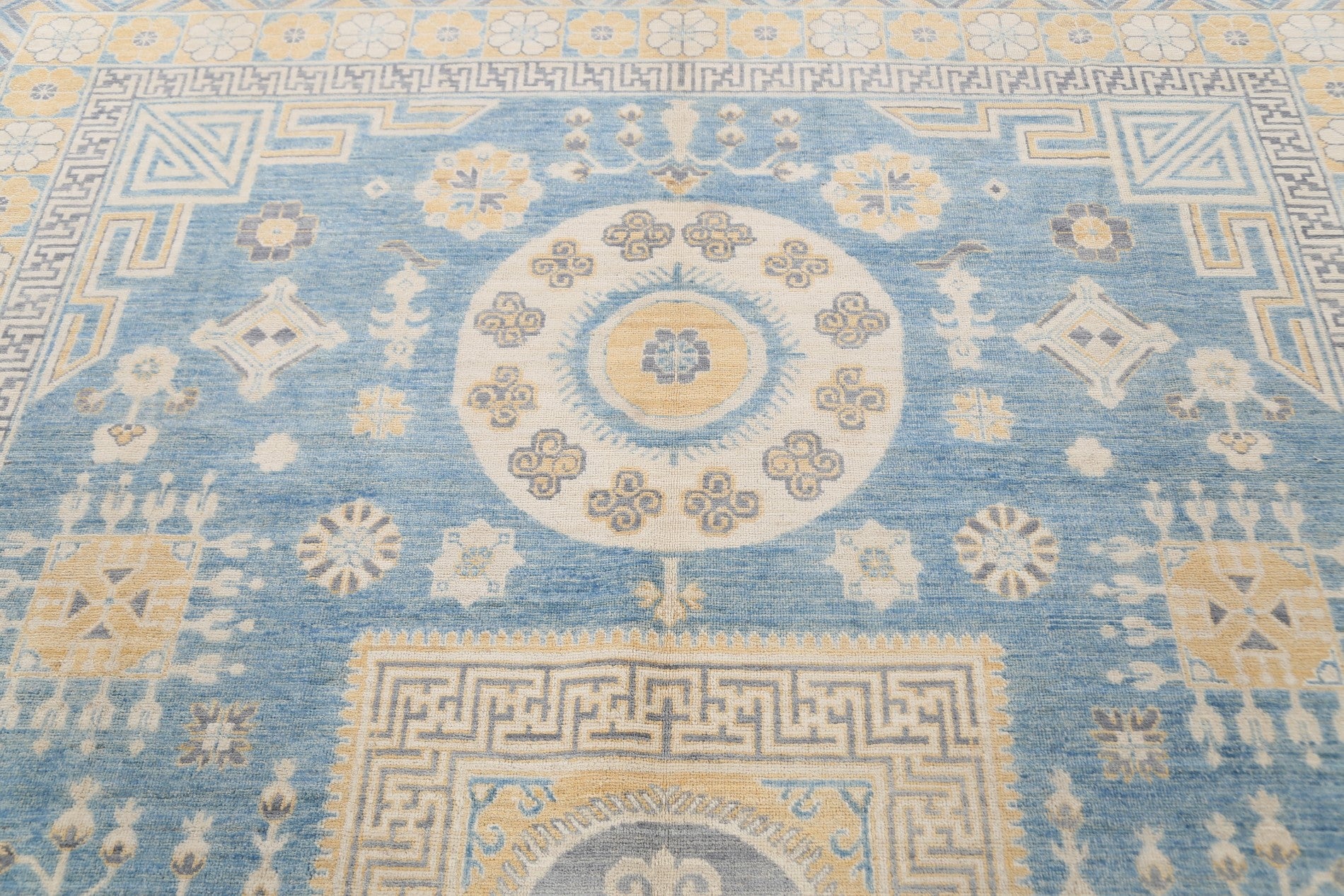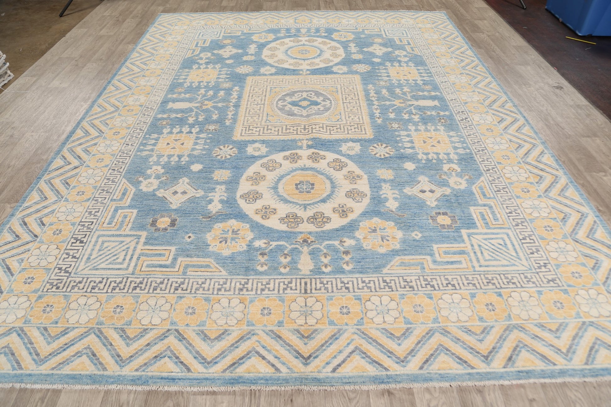 A Beautiful Genuine Pakistan Khotan rug is Hand Knotted by skillful weavers in Pakistan with 100% Wool Material. This rug is in New, First Quality condition. dimensions are 11' 11'' X 9' 2'' in foot and 363 X 279 in centimeter. the primary color is Navy Blue & Blues.