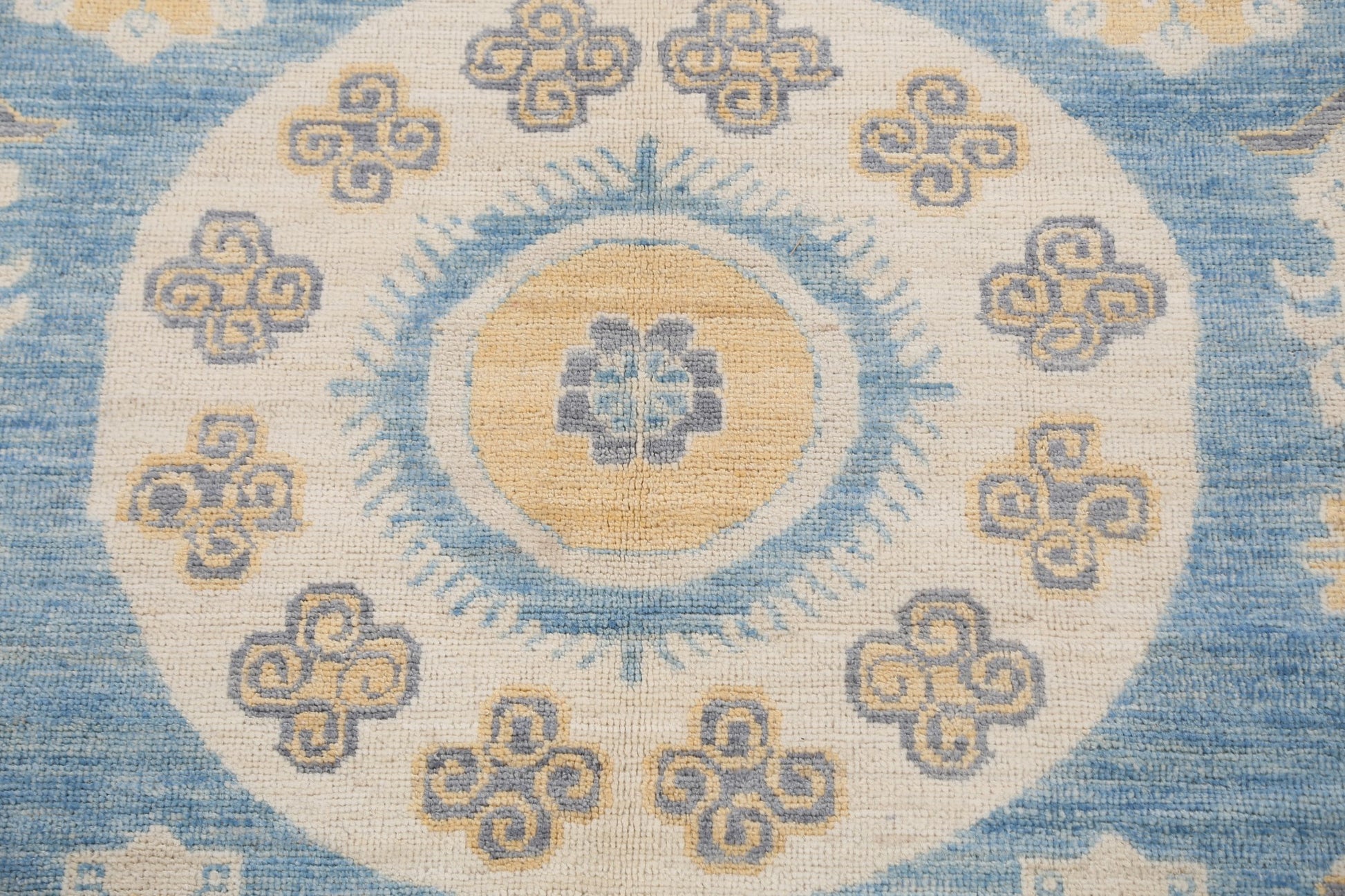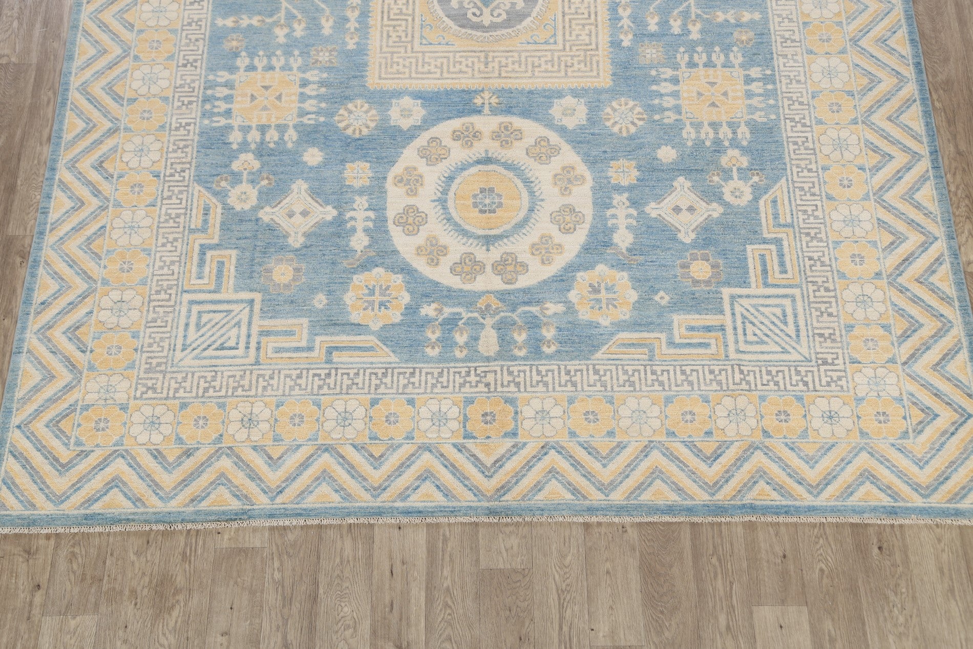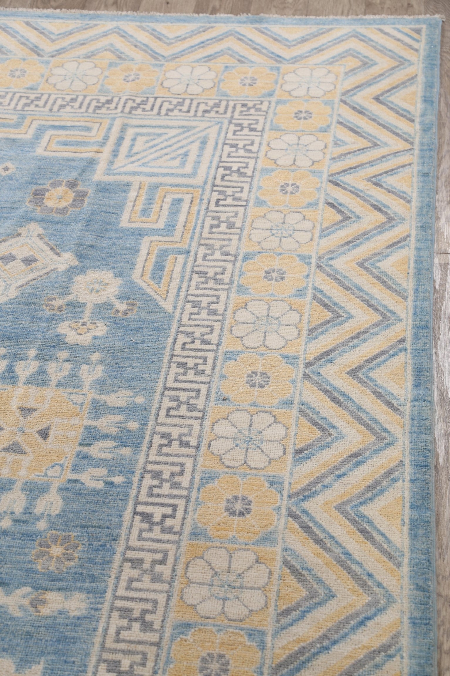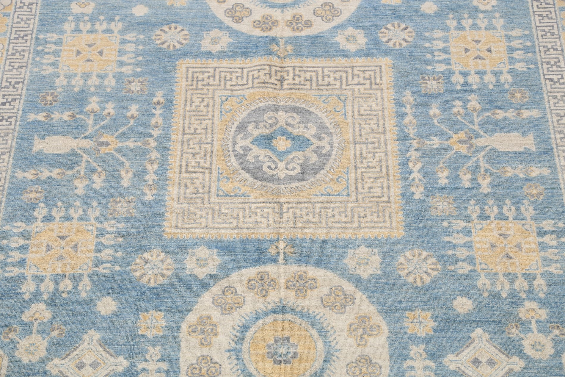 A Beautiful Genuine Pakistan Khotan rug is Hand Knotted by skillful weavers in Pakistan with 100% Wool Material. This rug is in New, First Quality condition. dimensions are 11' 11'' X 9' 2'' in foot and 363 X 279 in centimeter. the primary color is Navy Blue & Blues.