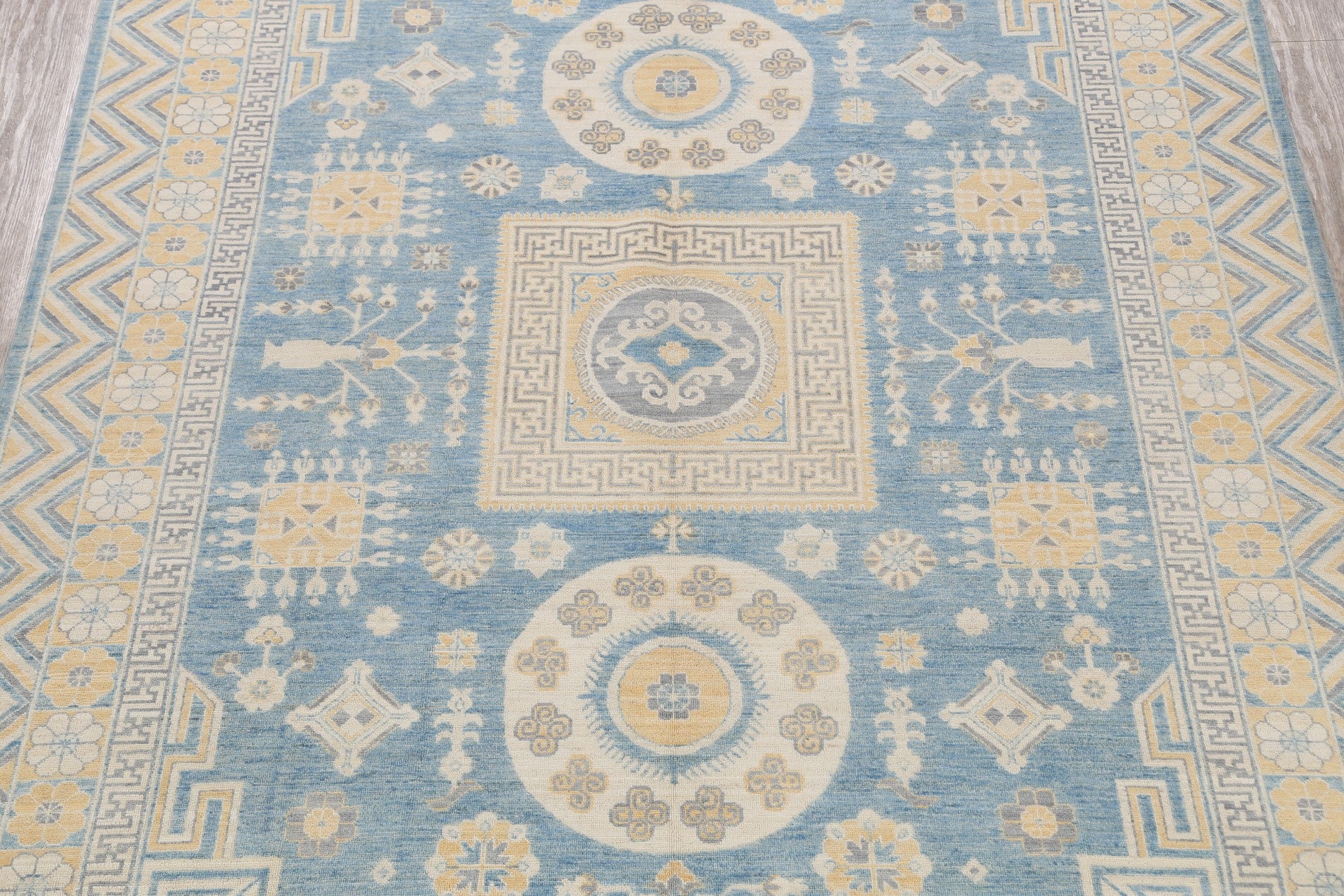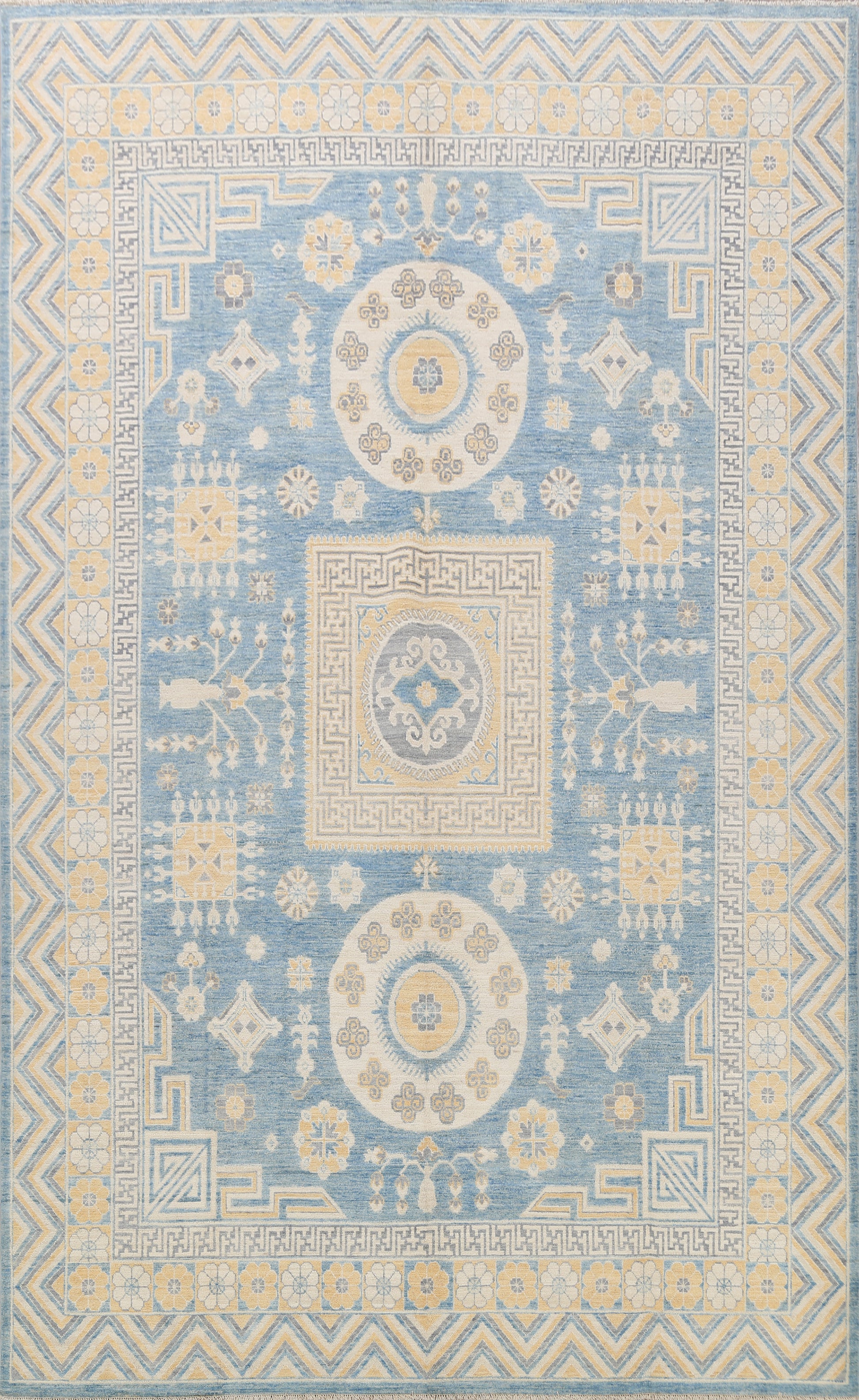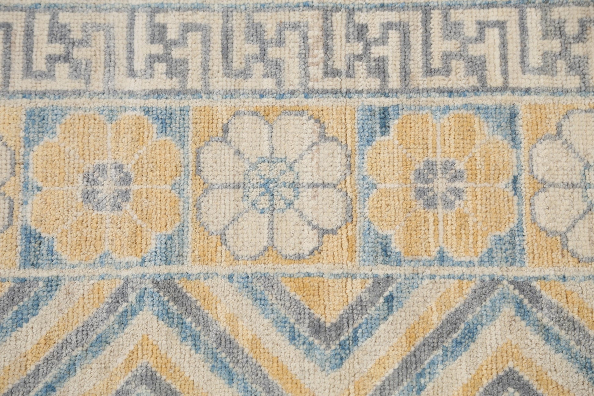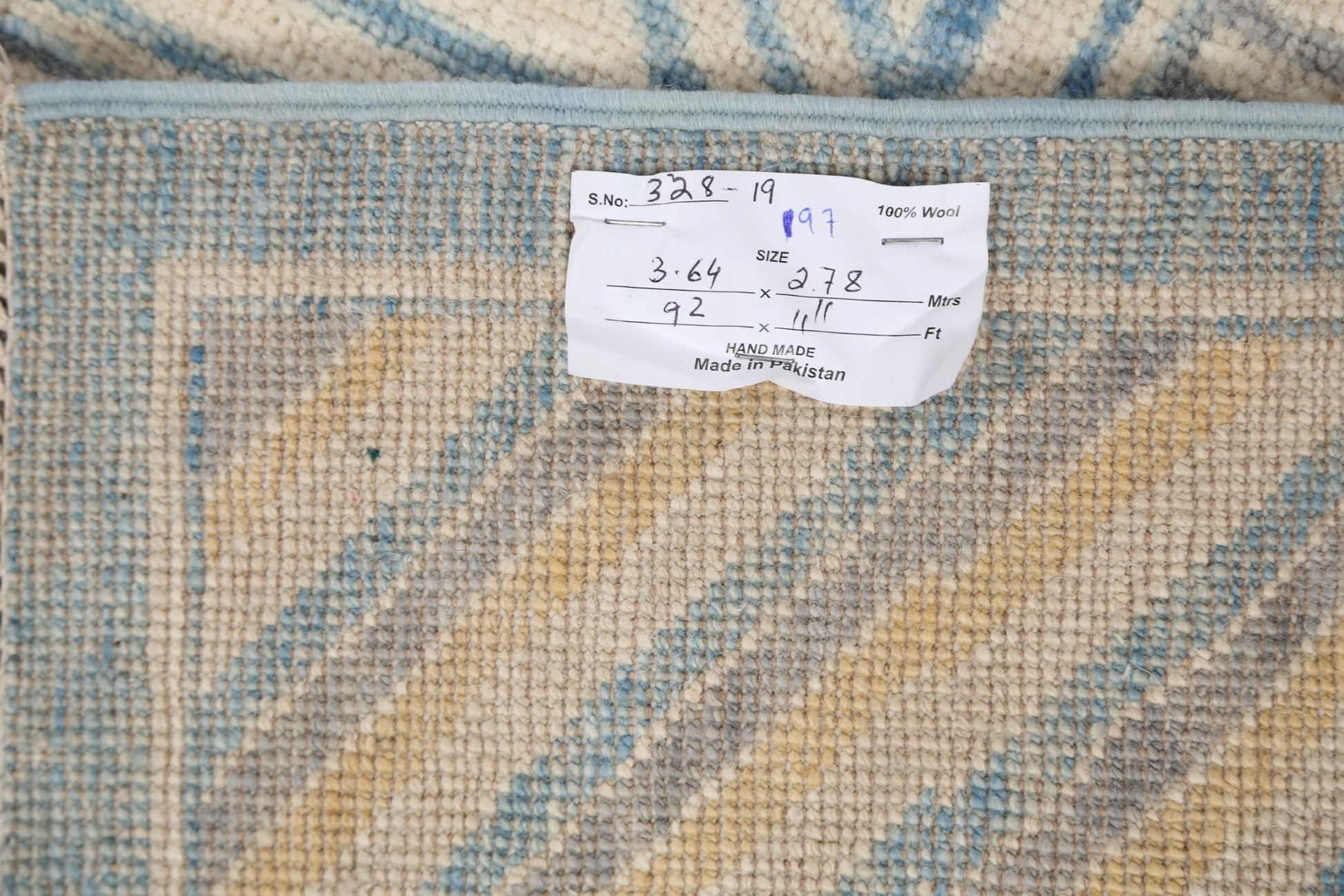 A Beautiful Genuine Pakistan Khotan rug is Hand Knotted by skillful weavers in Pakistan with 100% Wool Material. This rug is in New, First Quality condition. dimensions are 11' 11'' X 9' 2'' in foot and 363 X 279 in centimeter. the primary color is Navy Blue & Blues.