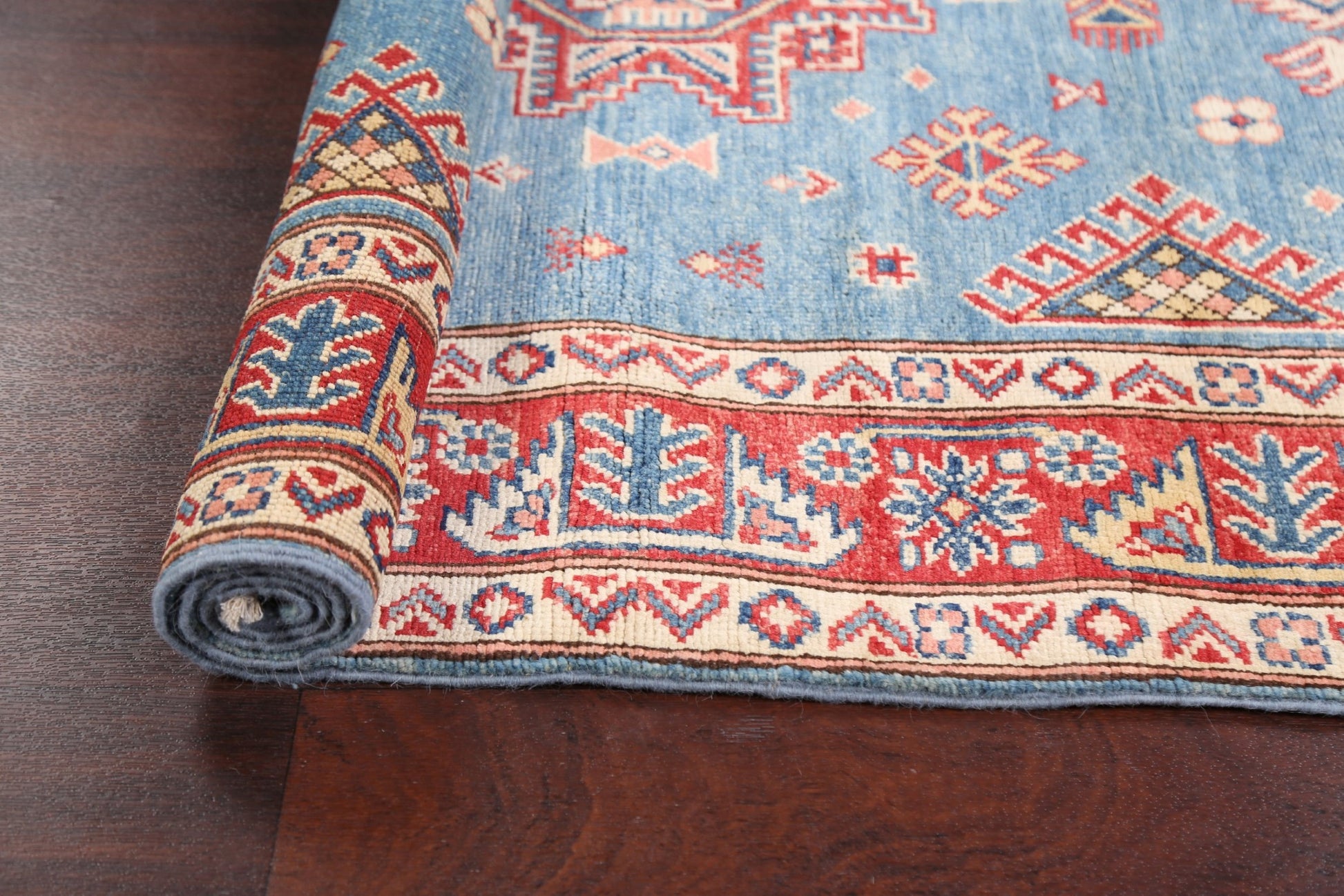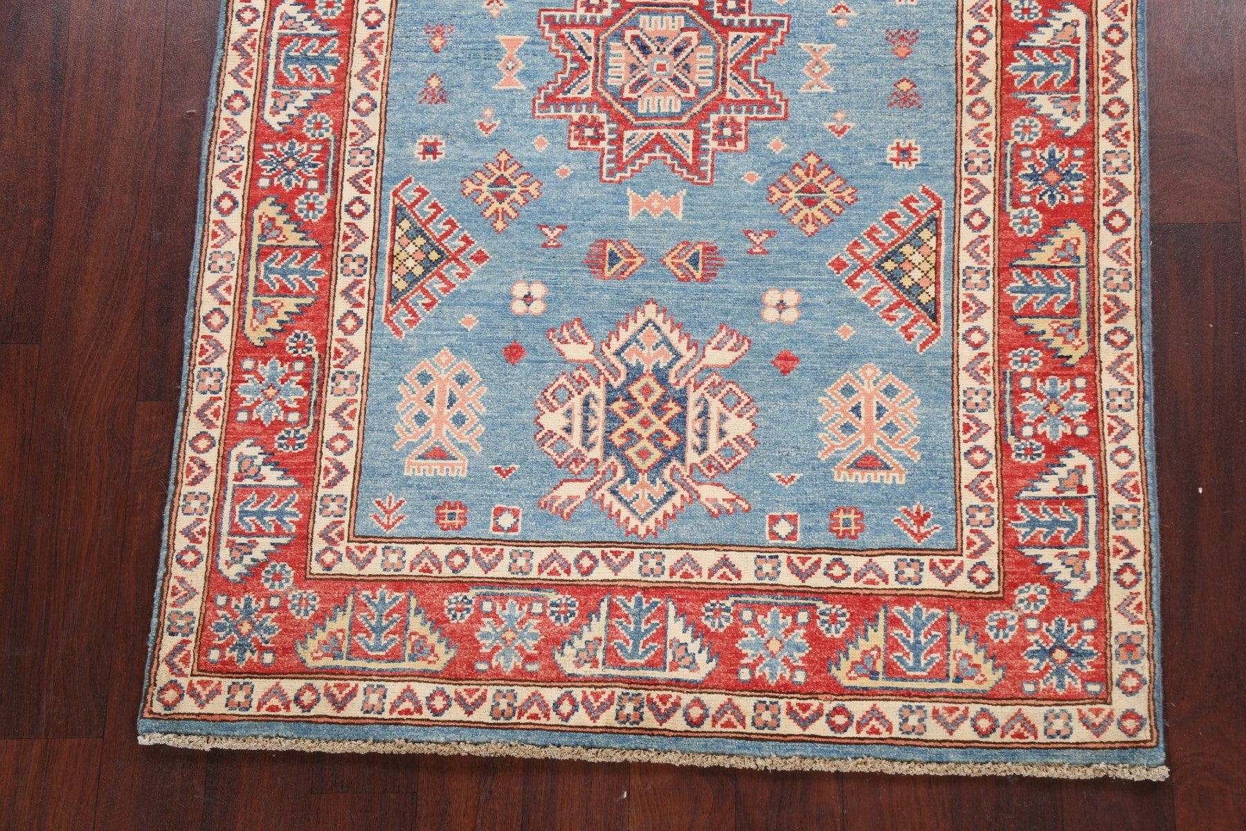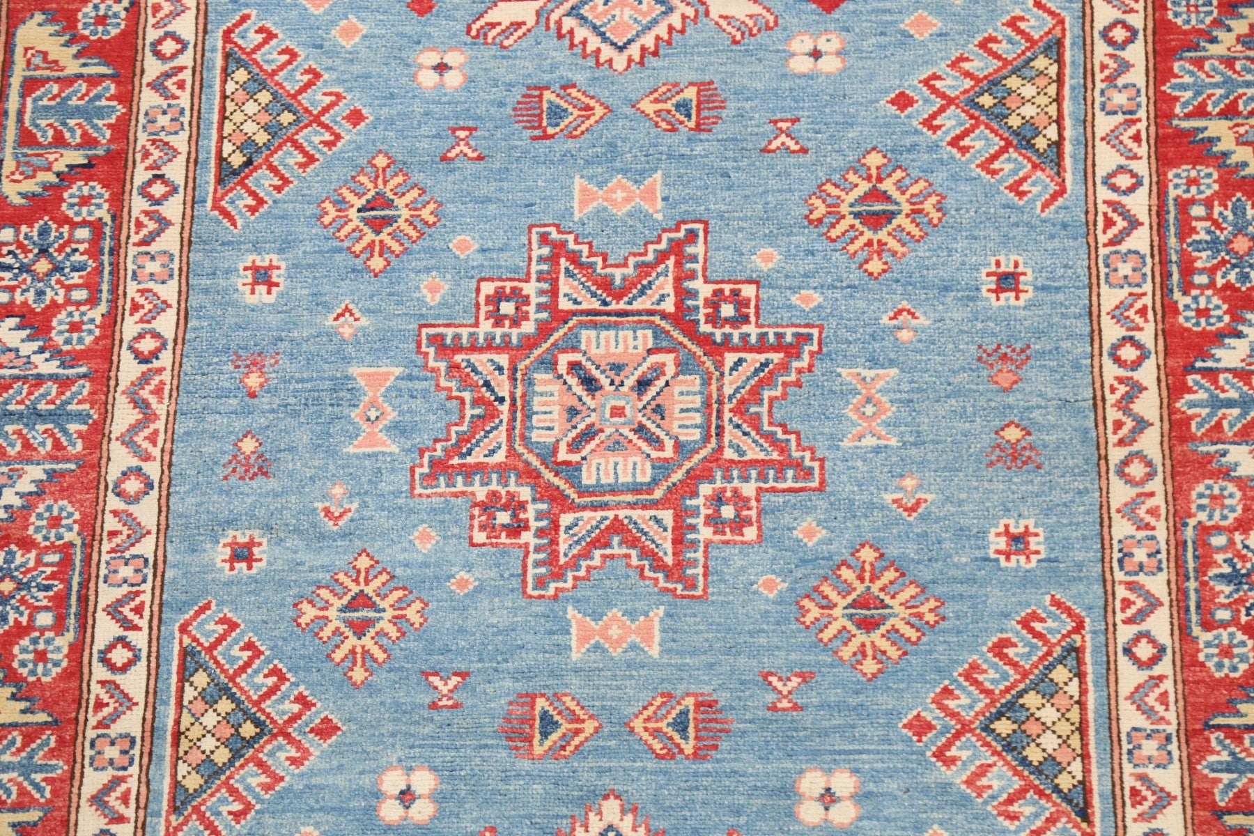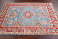 A Beautiful Genuine Pakistan Kazak rug is Hand Knotted by skillful weavers in Pakistan with 100% Wool Material. This rug is in New, First Quality condition. dimensions are 5' 9'' X 3' 11'' in foot and 175 X 119 in centimeter. the primary color is Navy Blue & Blues.