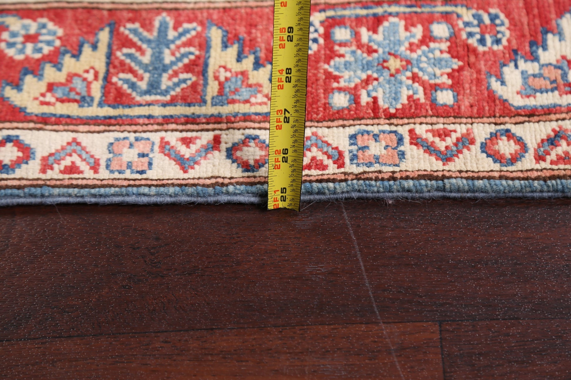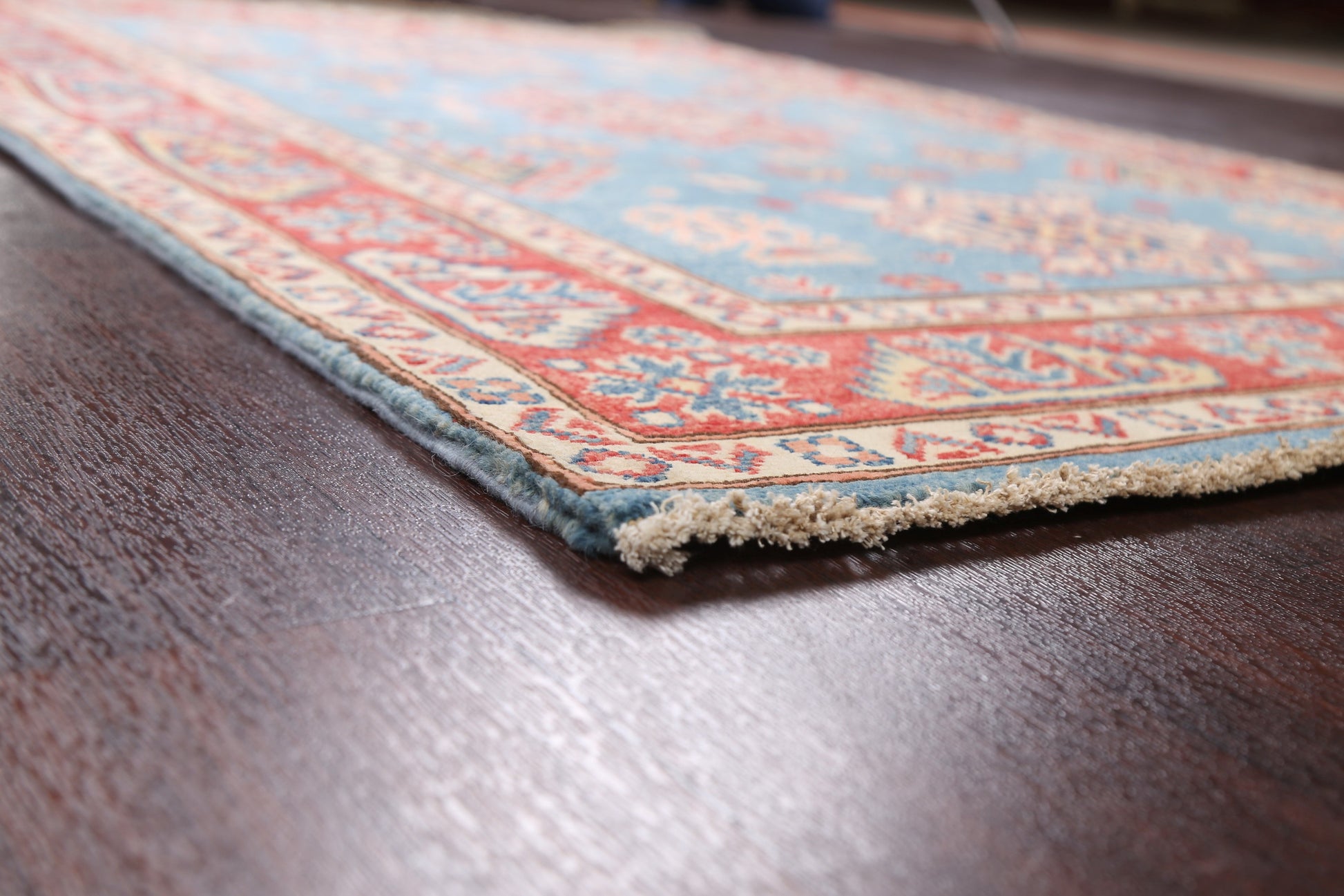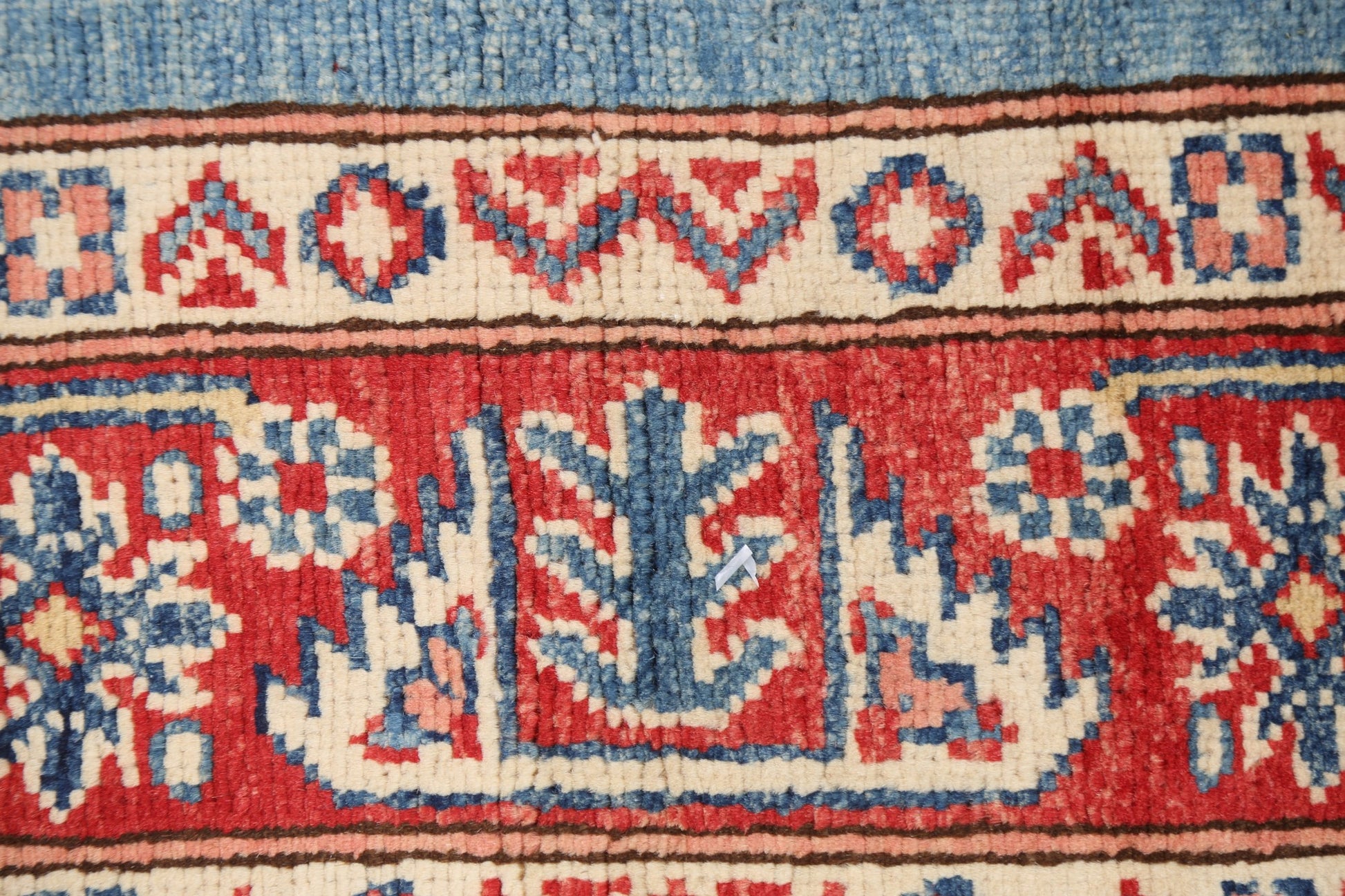 A Beautiful Genuine Pakistan Kazak rug is Hand Knotted by skillful weavers in Pakistan with 100% Wool Material. This rug is in New, First Quality condition. dimensions are 5' 9'' X 3' 11'' in foot and 175 X 119 in centimeter. the primary color is Navy Blue & Blues.
