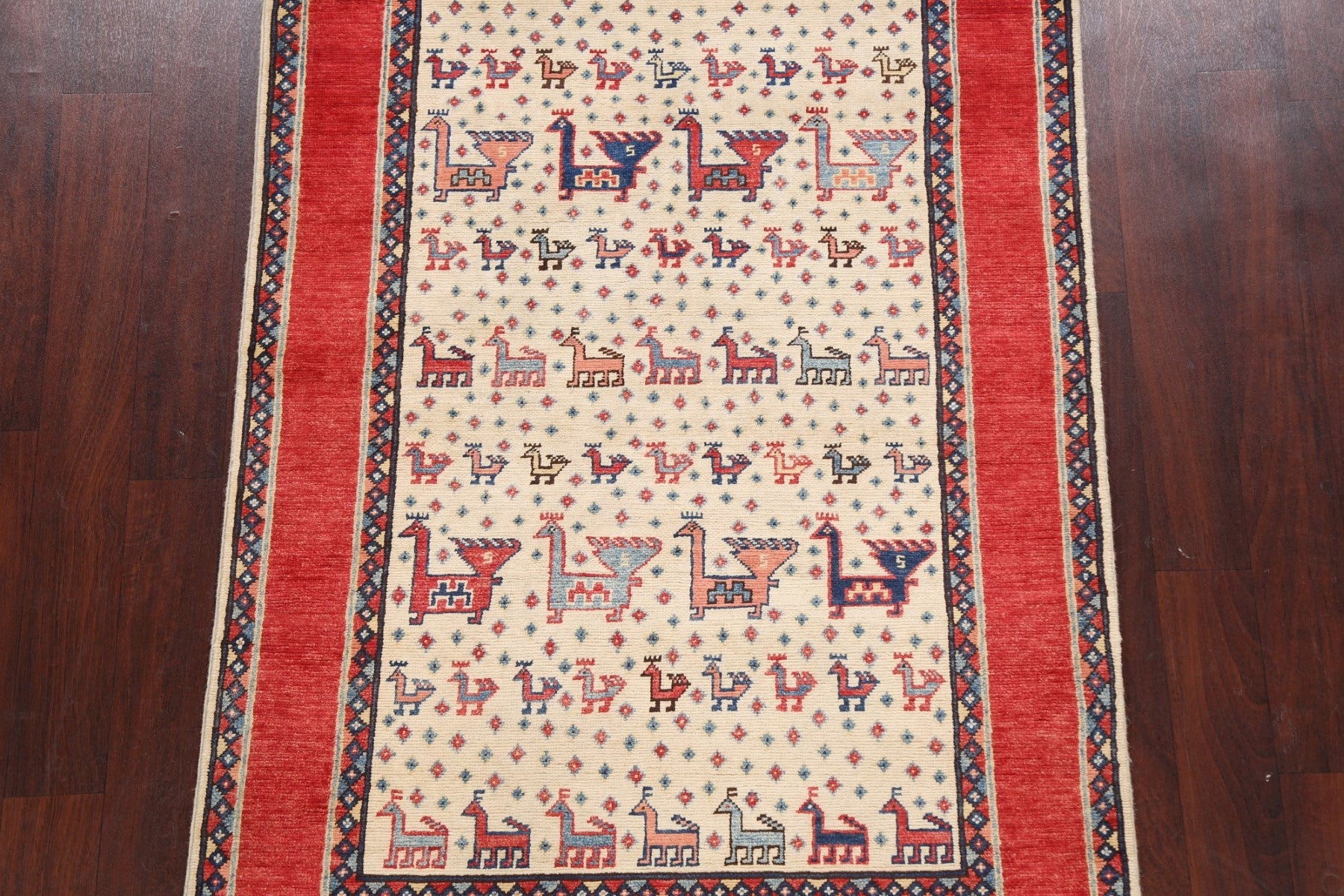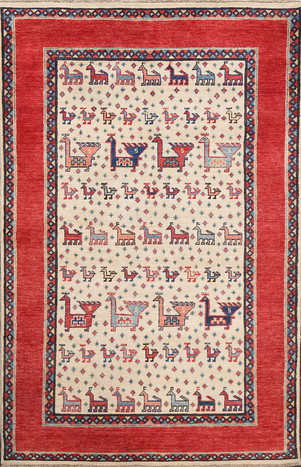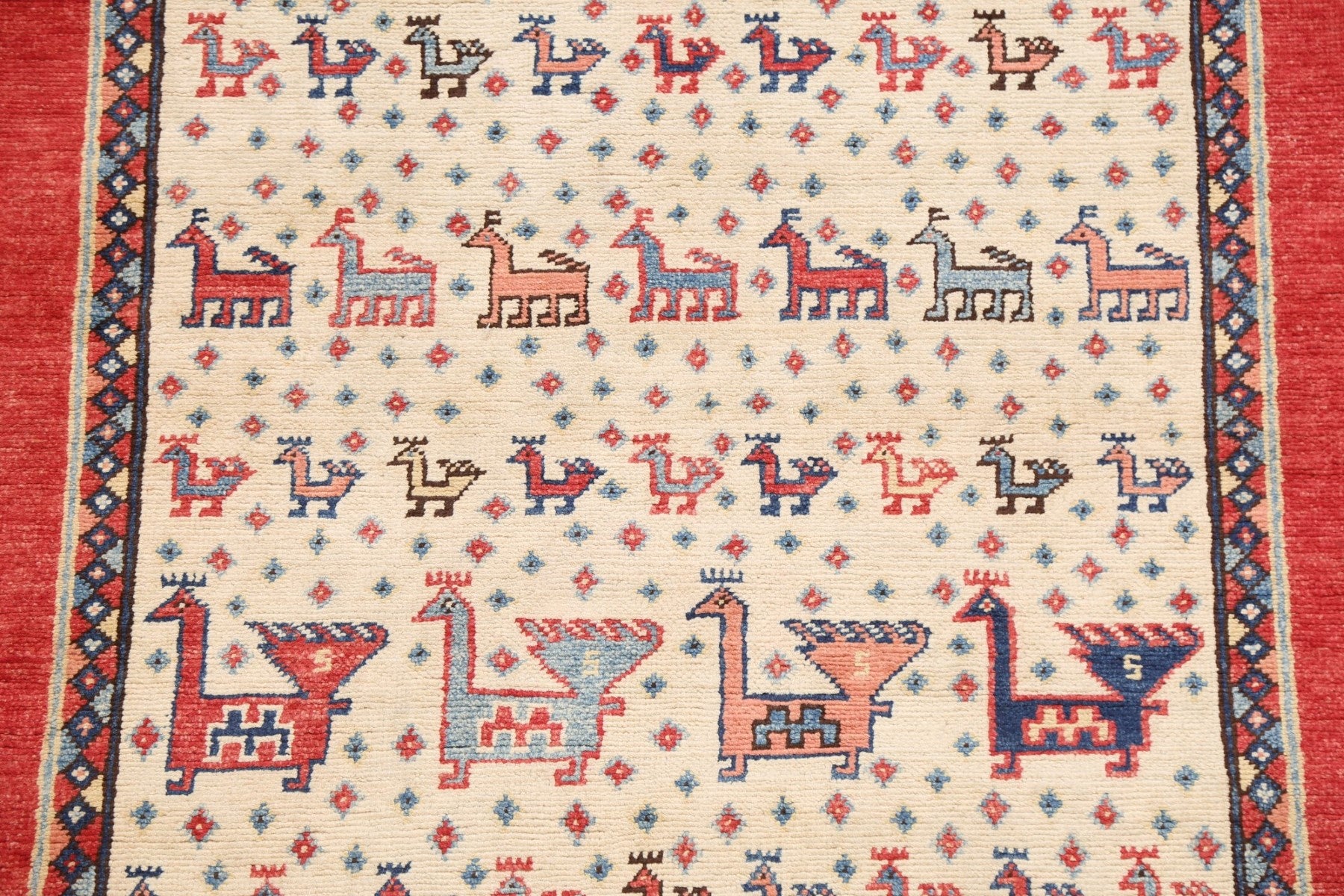 A Beautiful Genuine Pakistan Kazak rug is Hand Knotted by skillful weavers in Pakistan with 100% Wool Material. This rug is in New, First Quality condition. dimensions are 5' 9'' X 3' 10'' in foot and 175 X 117 in centimeter. the primary color is Beige & Ivories.