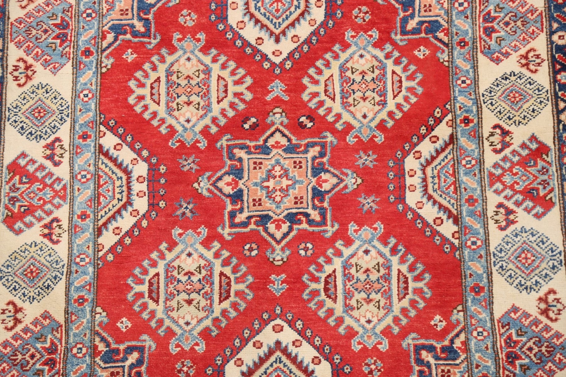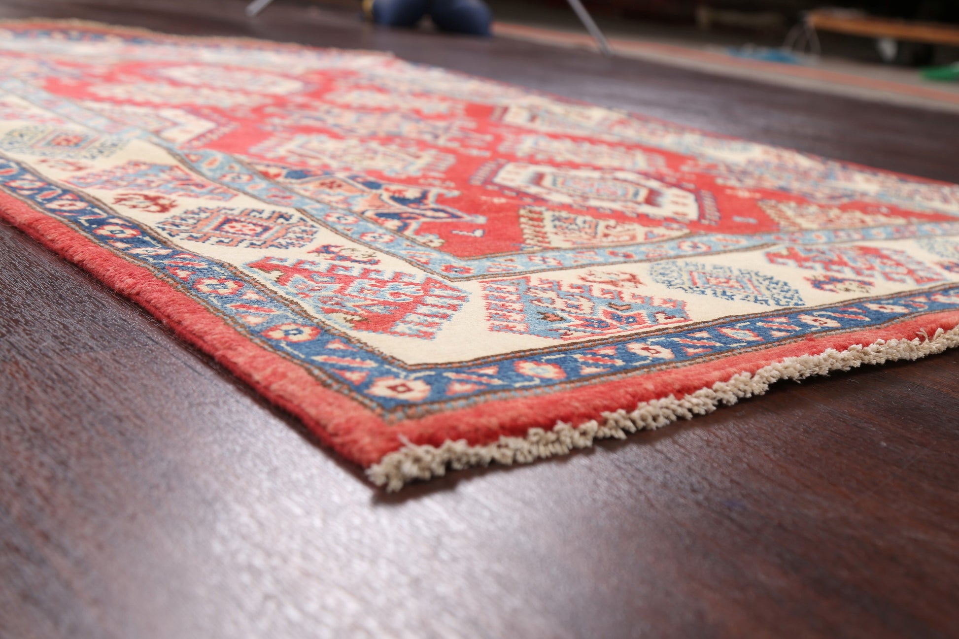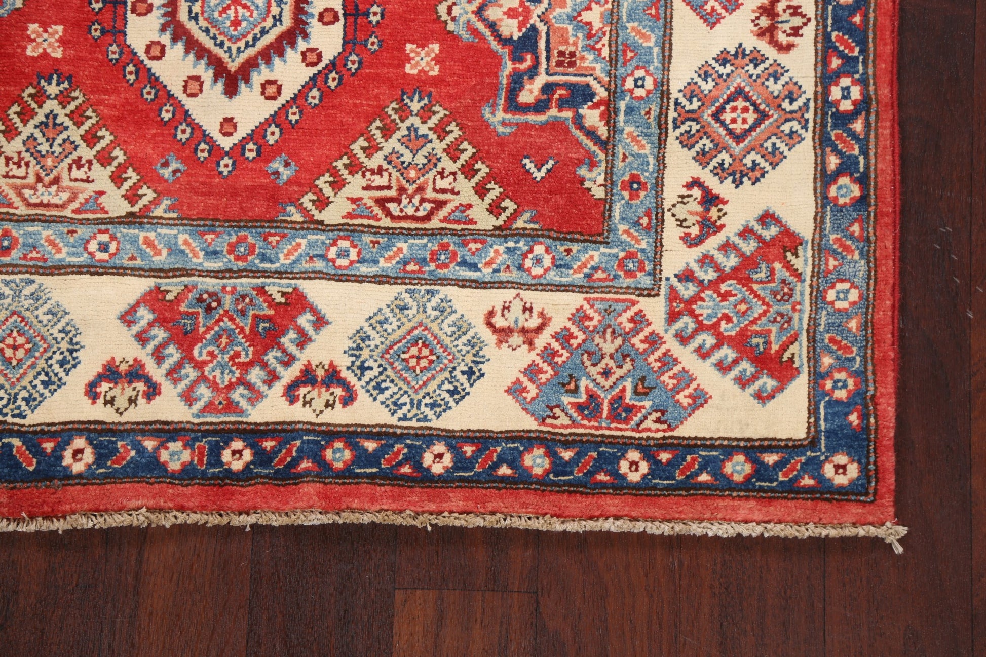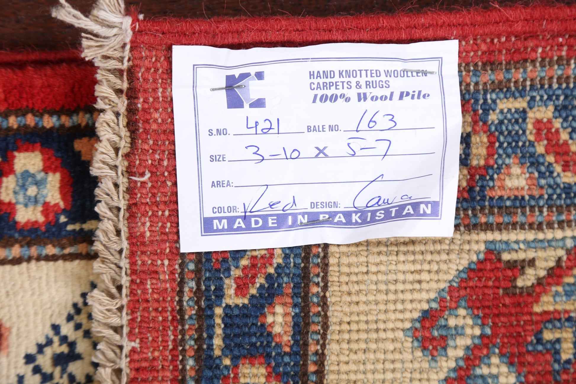 A Beautiful Genuine Pakistan Kazak rug is Hand Knotted by skillful weavers in Pakistan with 100% Wool Material. This rug is in New, First Quality condition. dimensions are 5' 7'' X 3' 10'' in foot and 170 X 117 in centimeter. the primary color is Red.