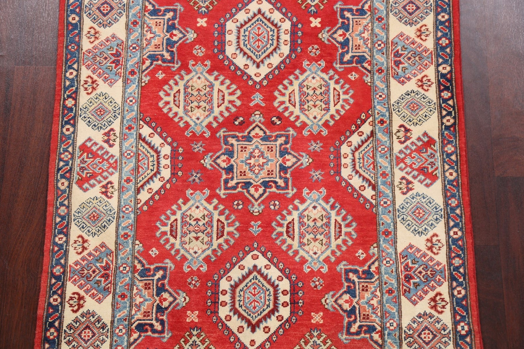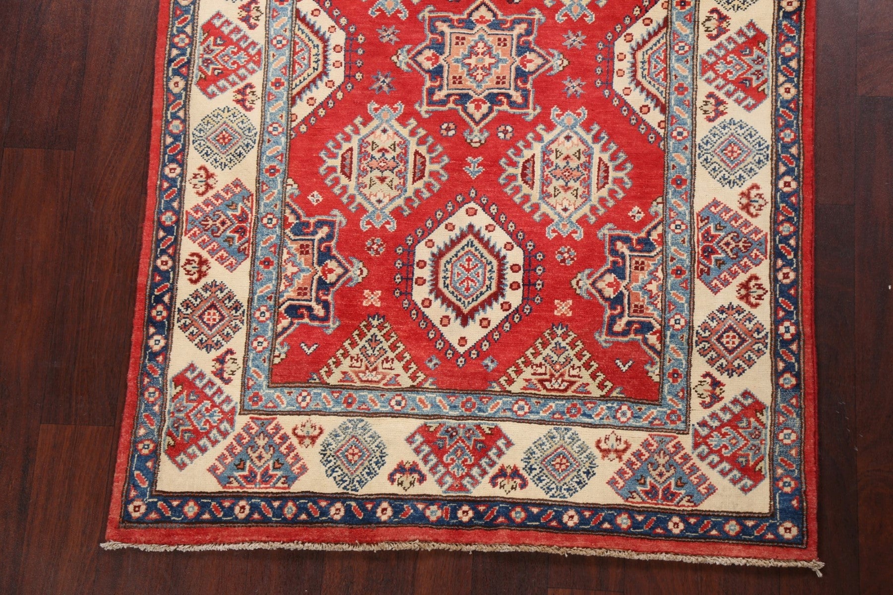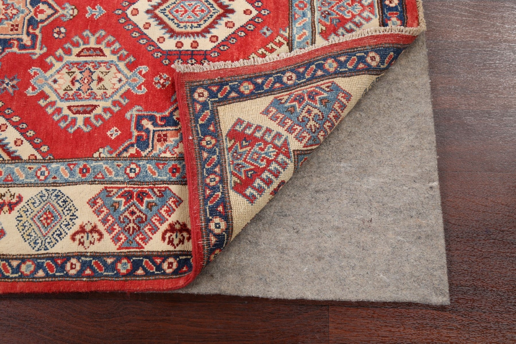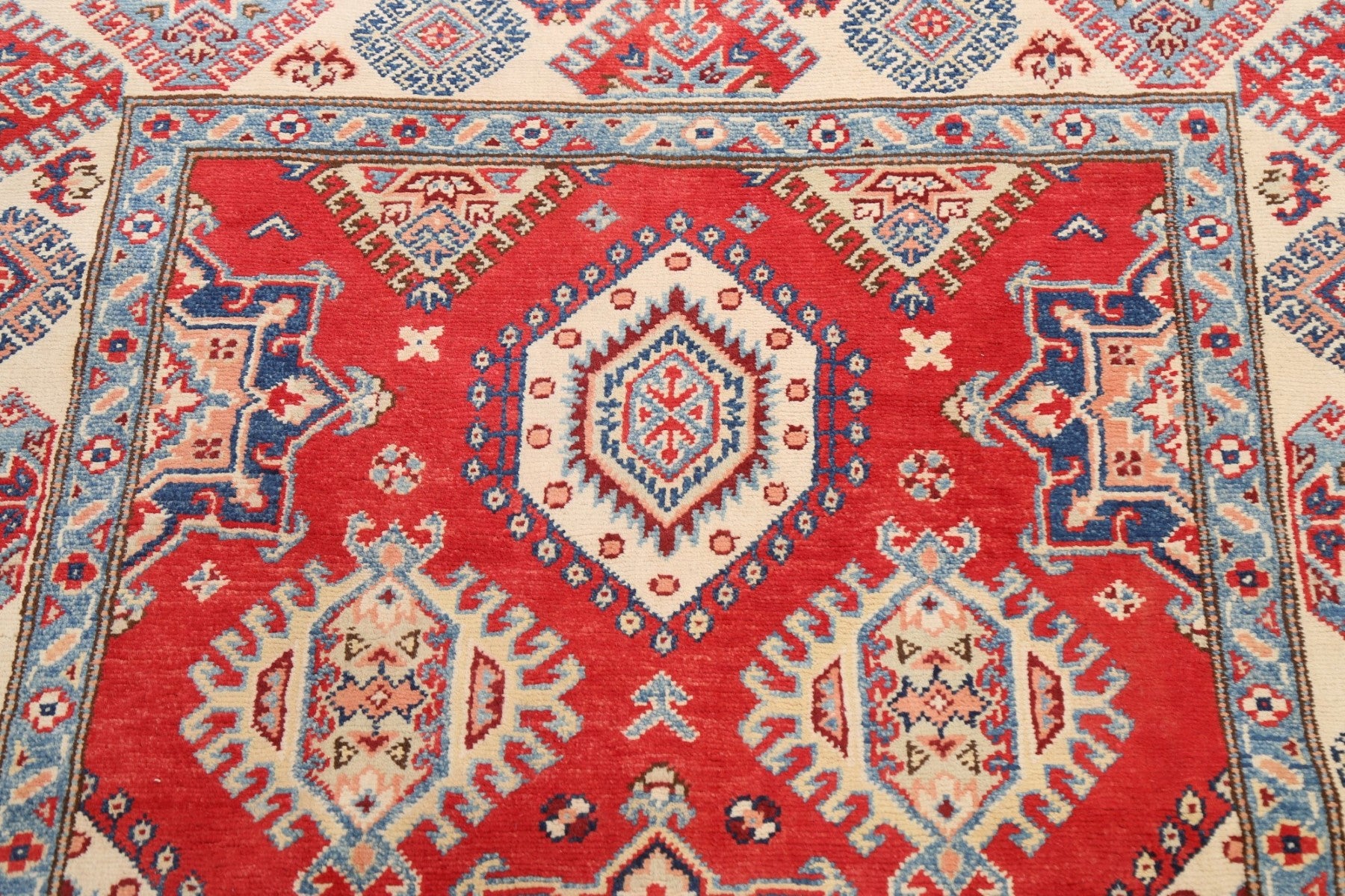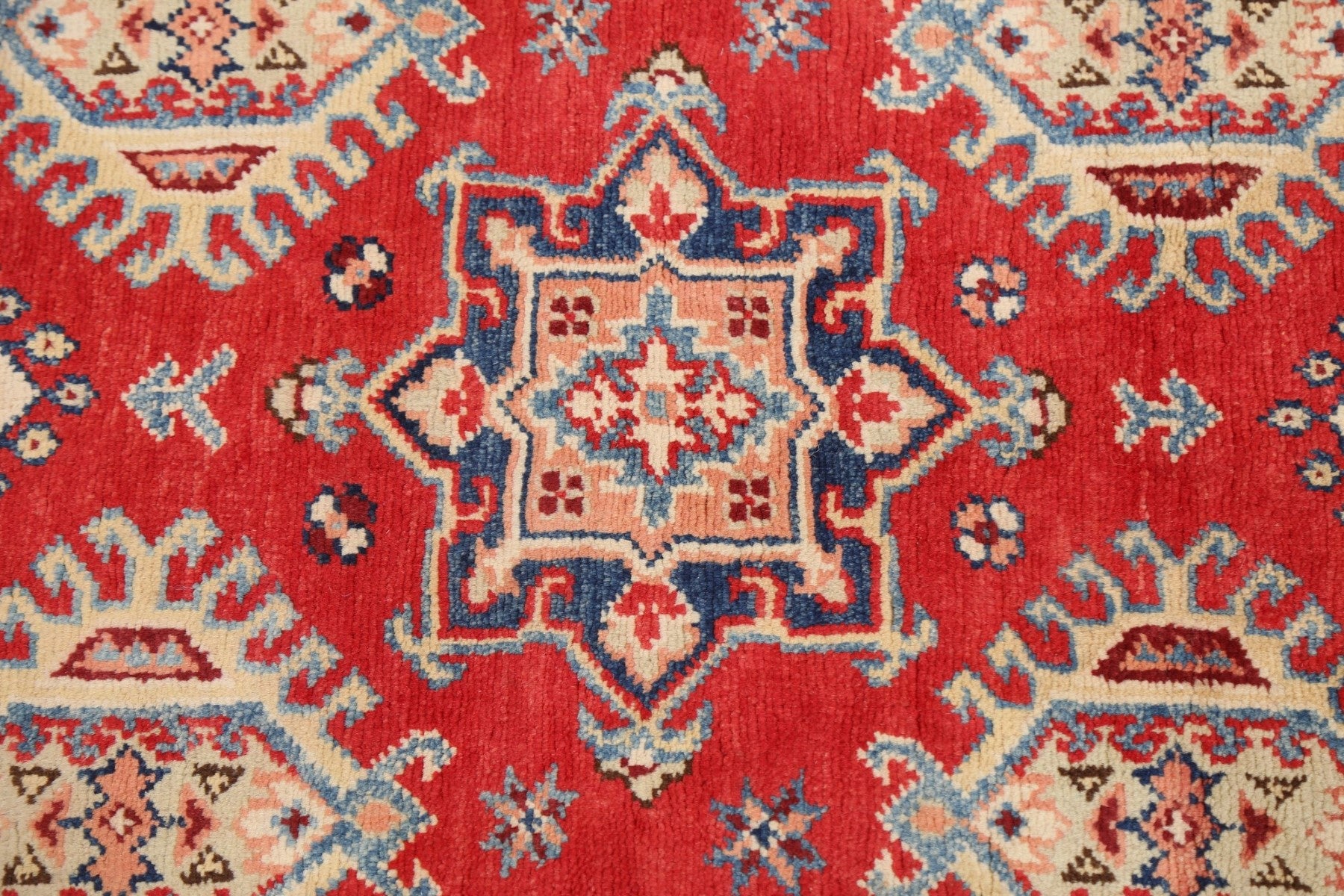 A Beautiful Genuine Pakistan Kazak rug is Hand Knotted by skillful weavers in Pakistan with 100% Wool Material. This rug is in New, First Quality condition. dimensions are 5' 7'' X 3' 10'' in foot and 170 X 117 in centimeter. the primary color is Red.