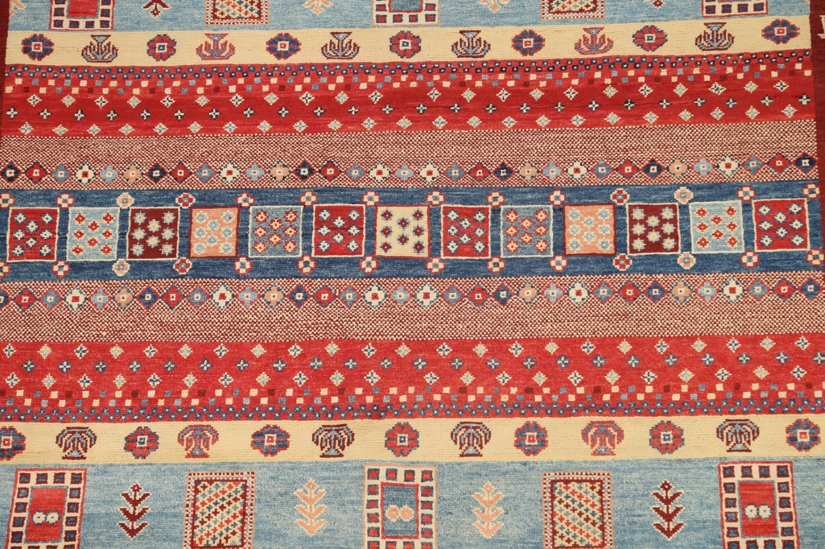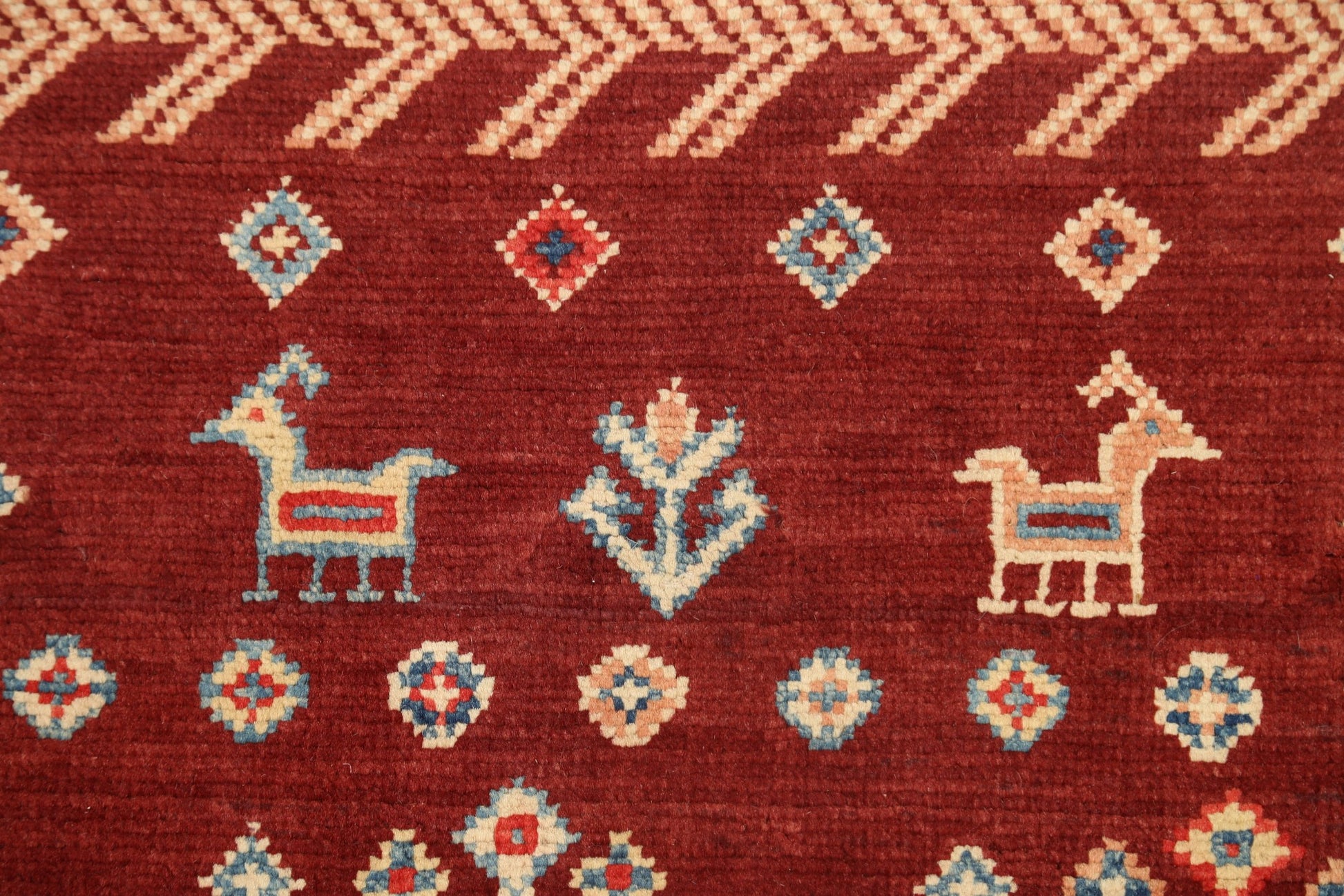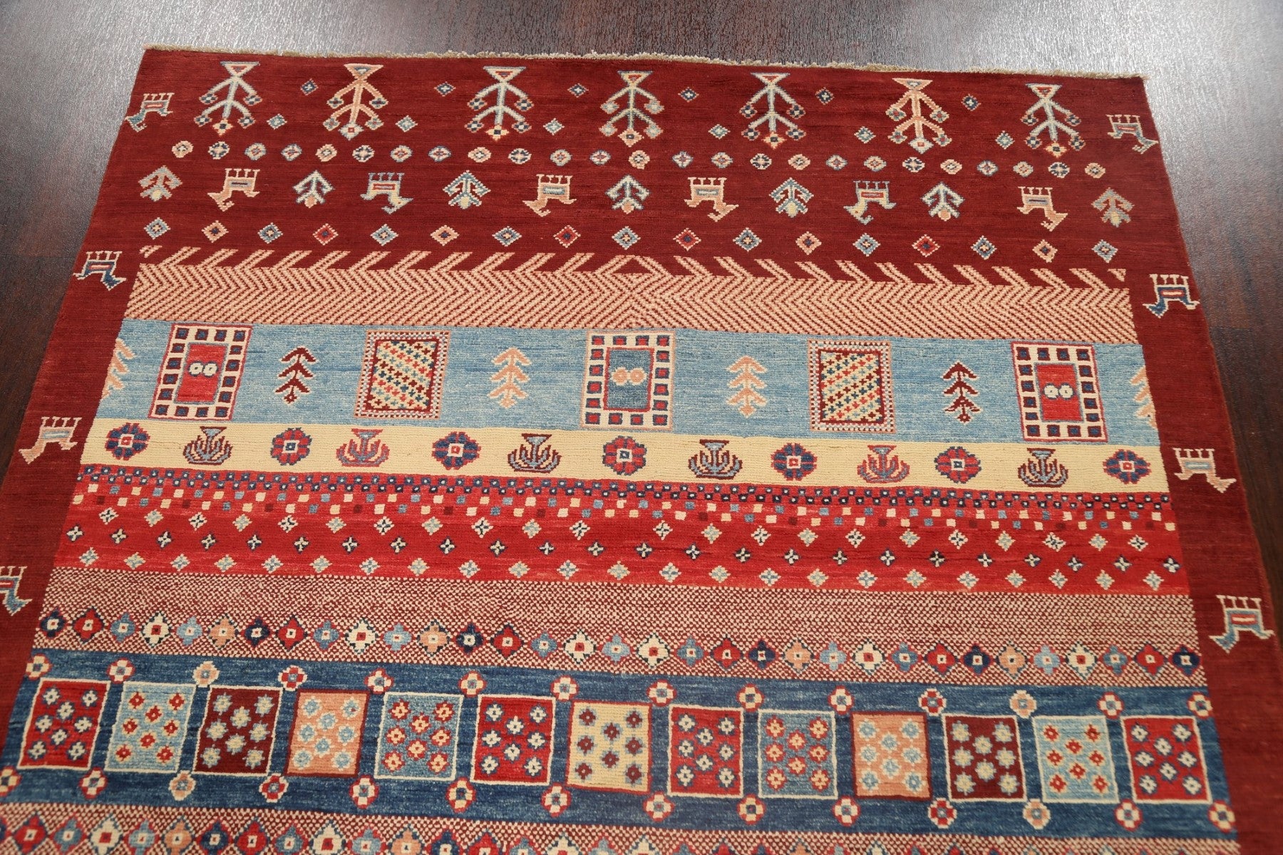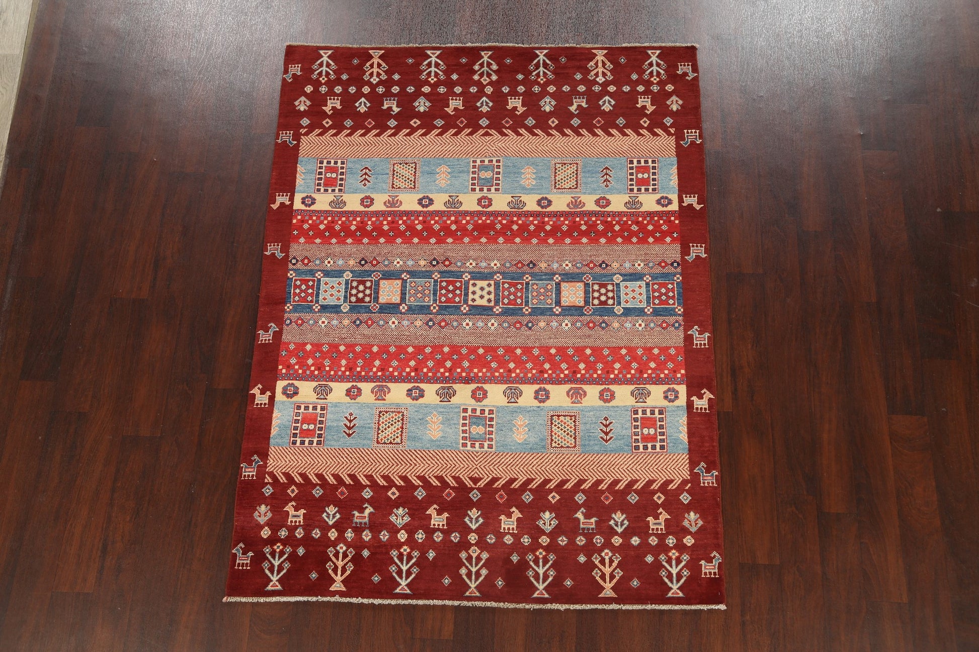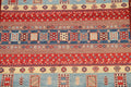 A Beautiful Genuine Pakistan Kazak rug is Hand Knotted by skillful weavers in Pakistan with 100% Wool Material. This rug is in New, First Quality condition. dimensions are 6' 9'' X 5' 1'' in foot and 206 X 155 in centimeter. the primary color is Red.