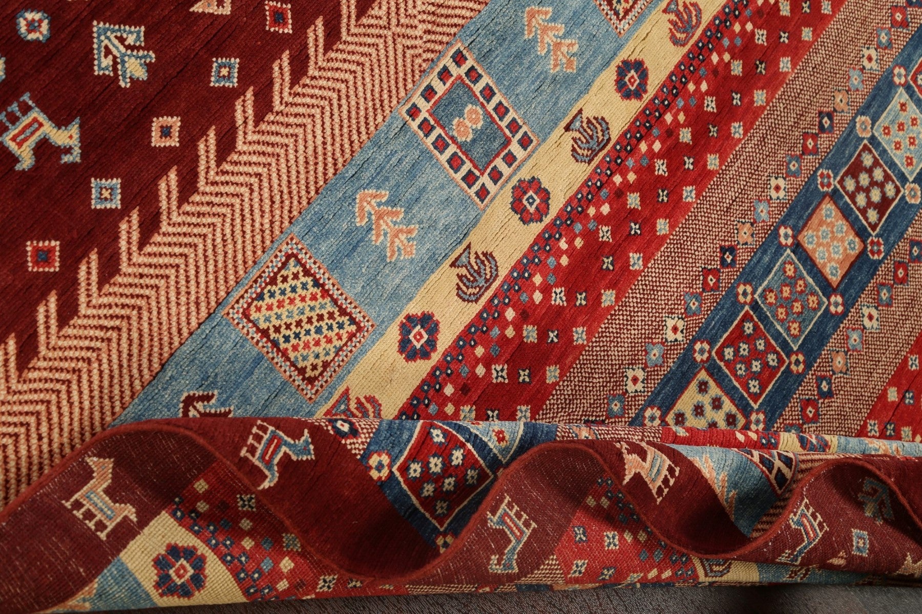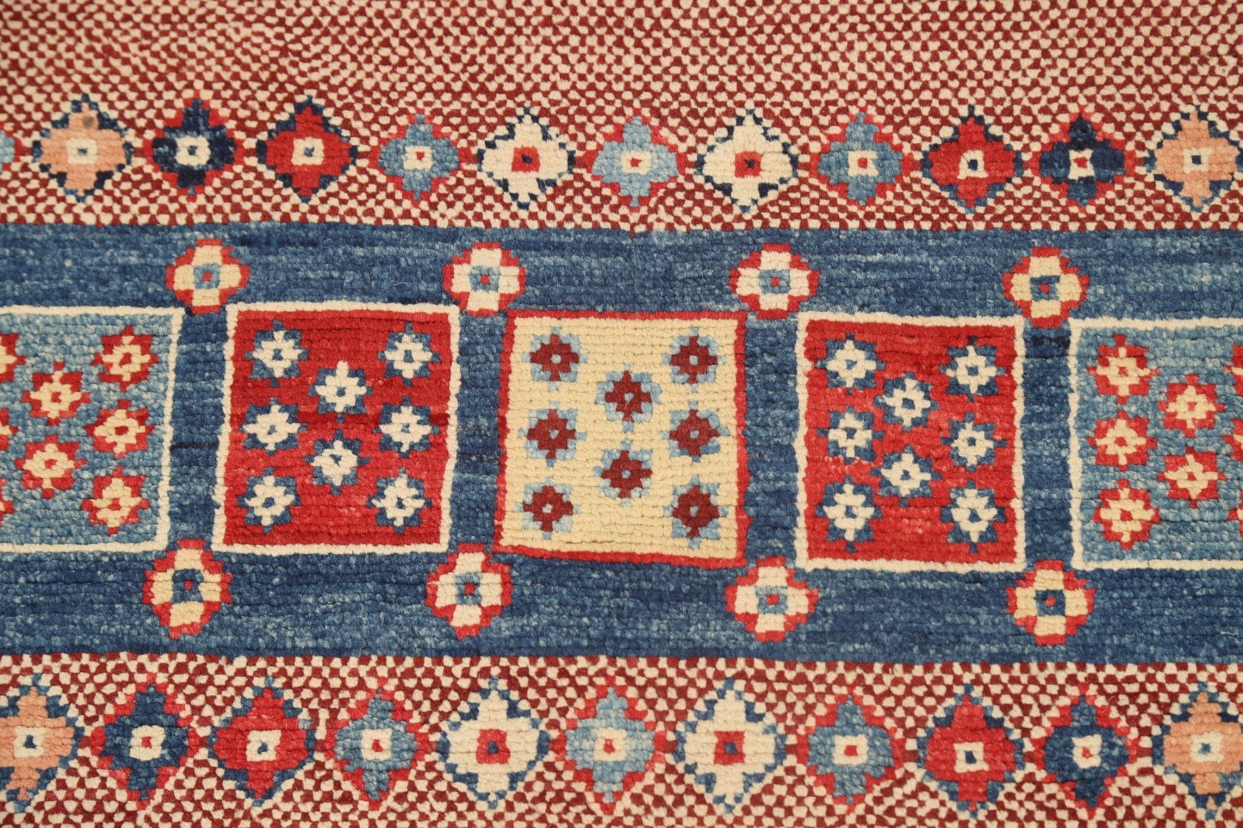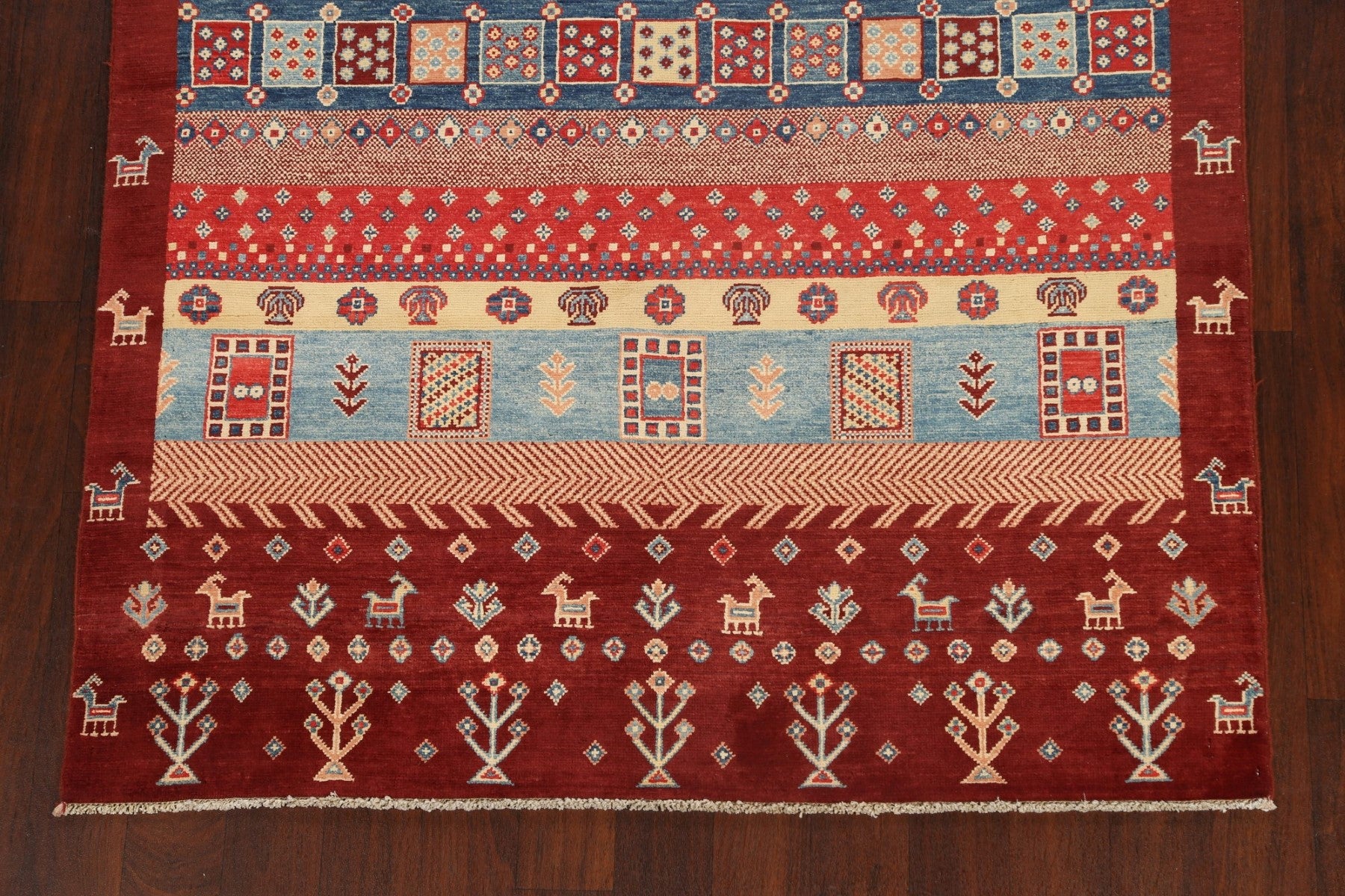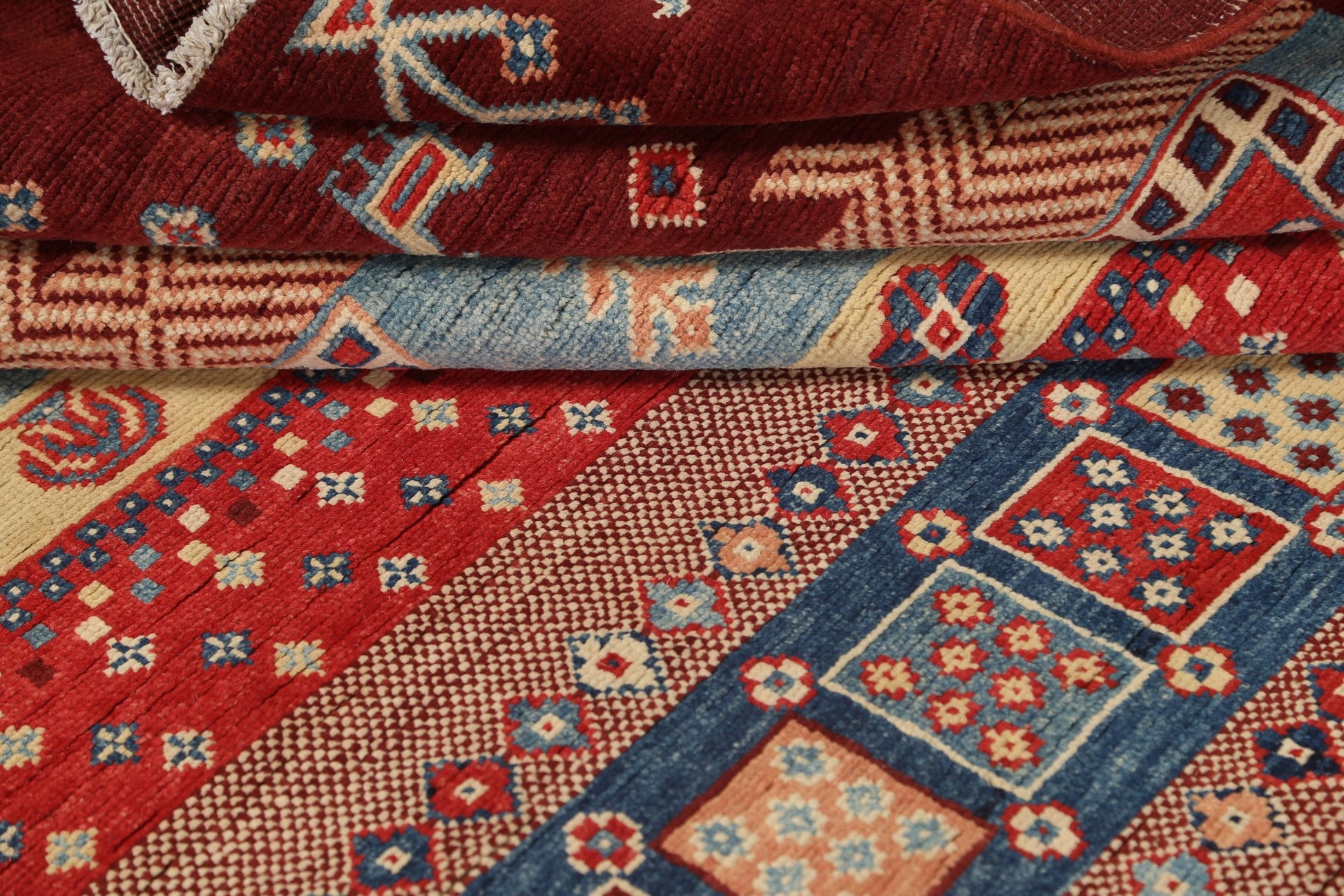 A Beautiful Genuine Pakistan Kazak rug is Hand Knotted by skillful weavers in Pakistan with 100% Wool Material. This rug is in New, First Quality condition. dimensions are 6' 9'' X 5' 1'' in foot and 206 X 155 in centimeter. the primary color is Red.