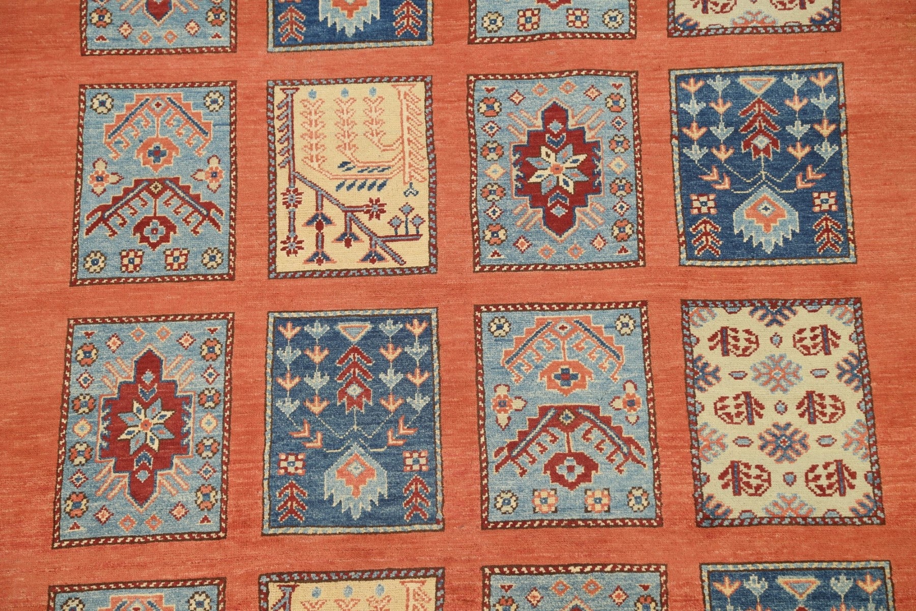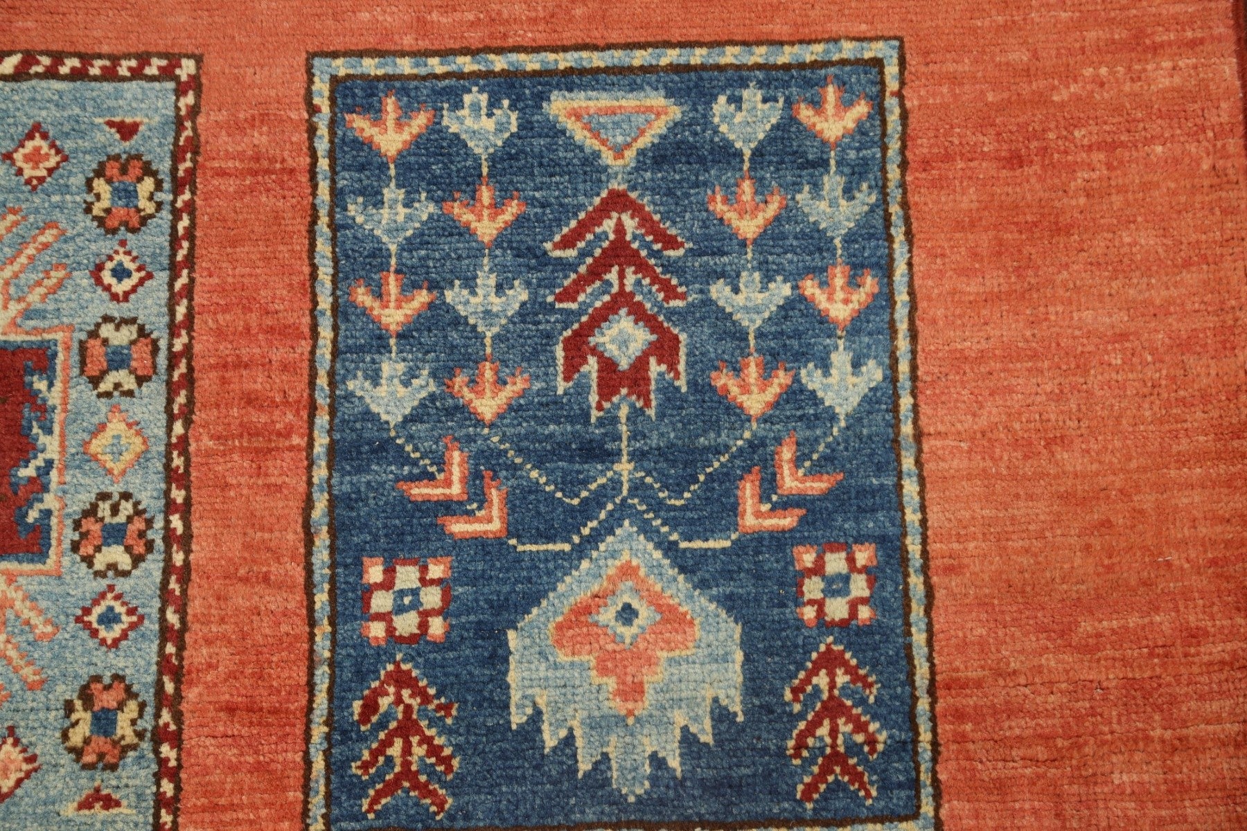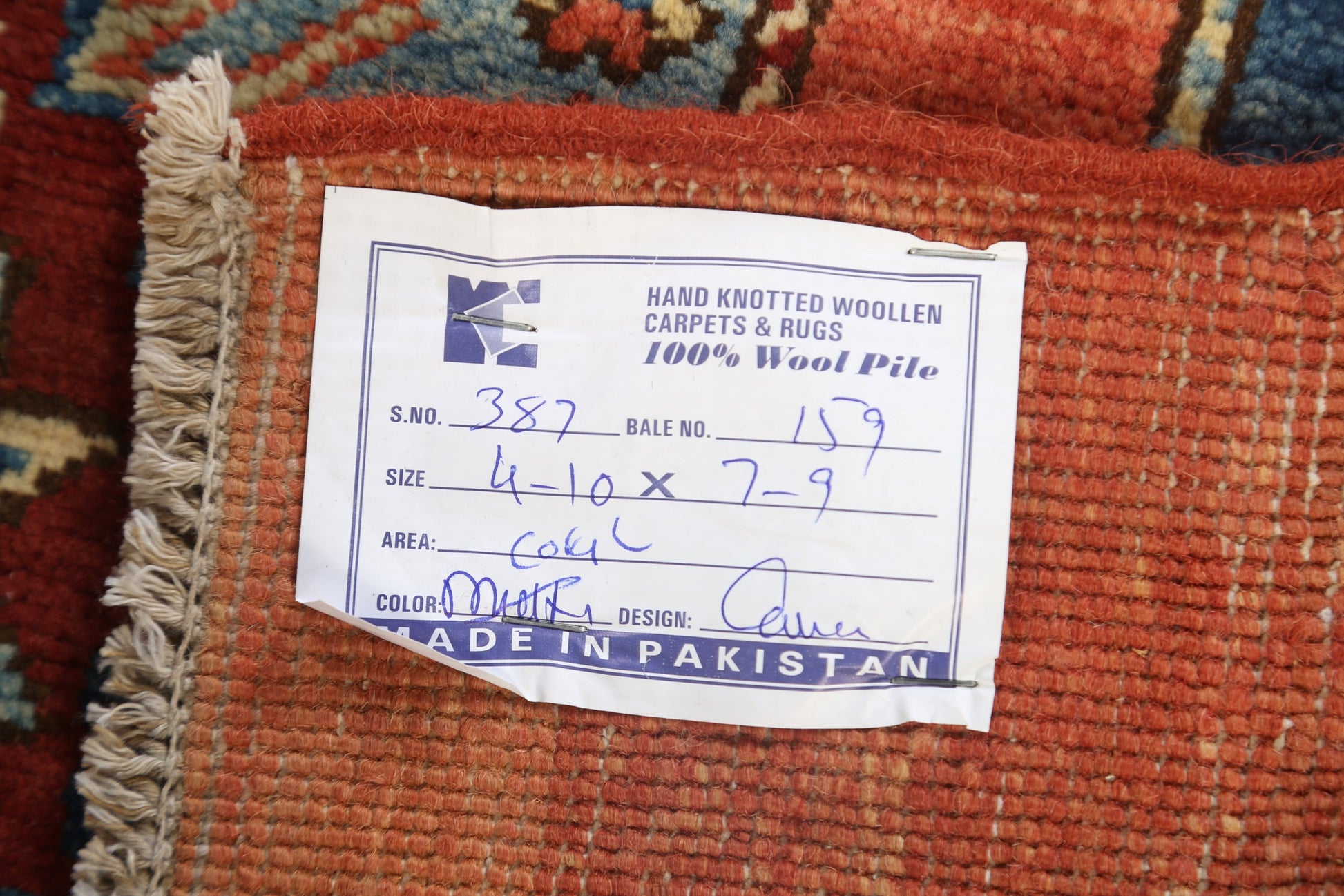 A Beautiful Genuine Pakistan Kazak rug is Hand Knotted by skillful weavers in Pakistan with 100% Wool Material. This rug is in New, First Quality condition. dimensions are 7' 9'' X 4' 10'' in foot and 236 X 147 in centimeter. the primary color is Coral.