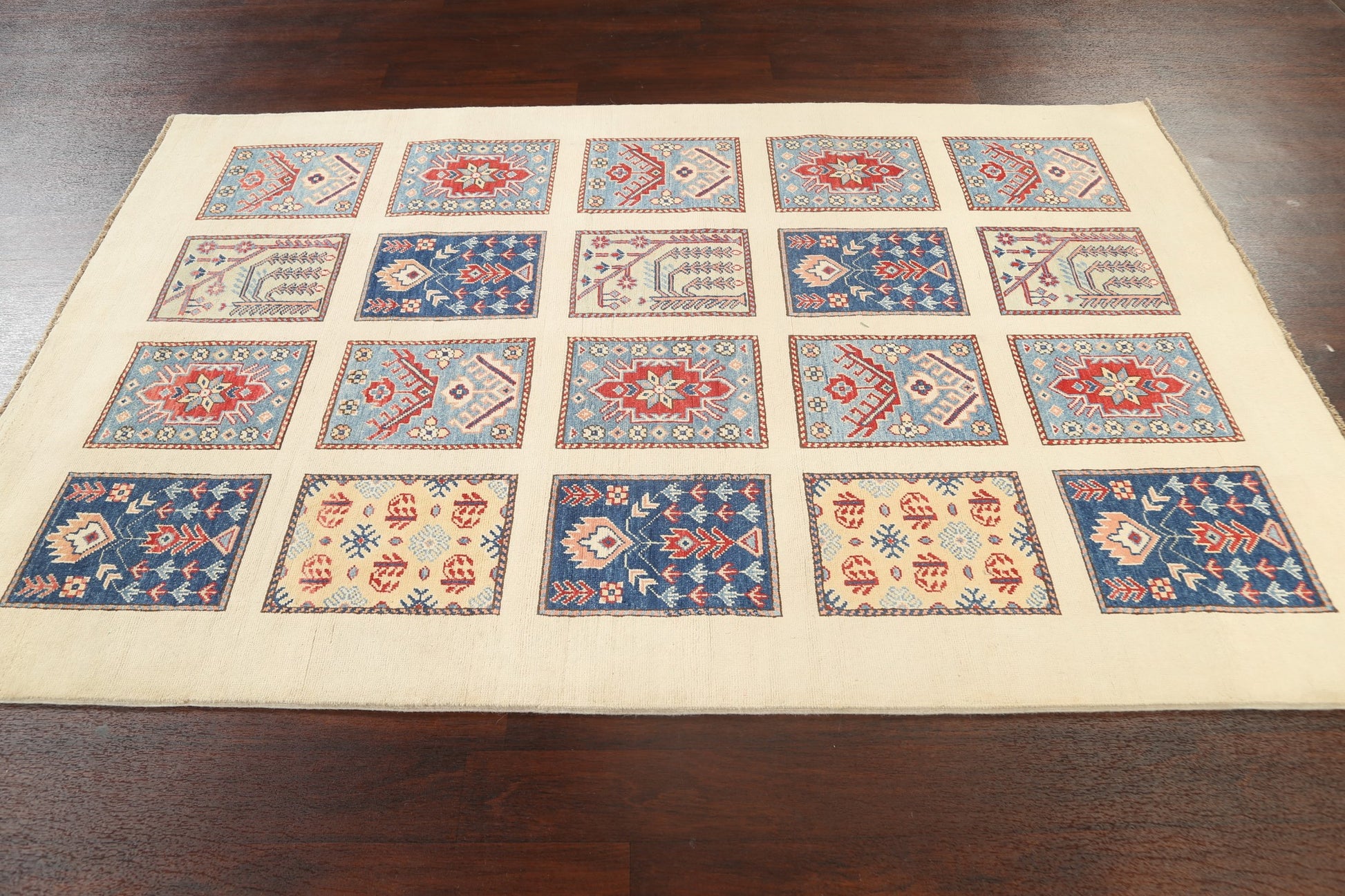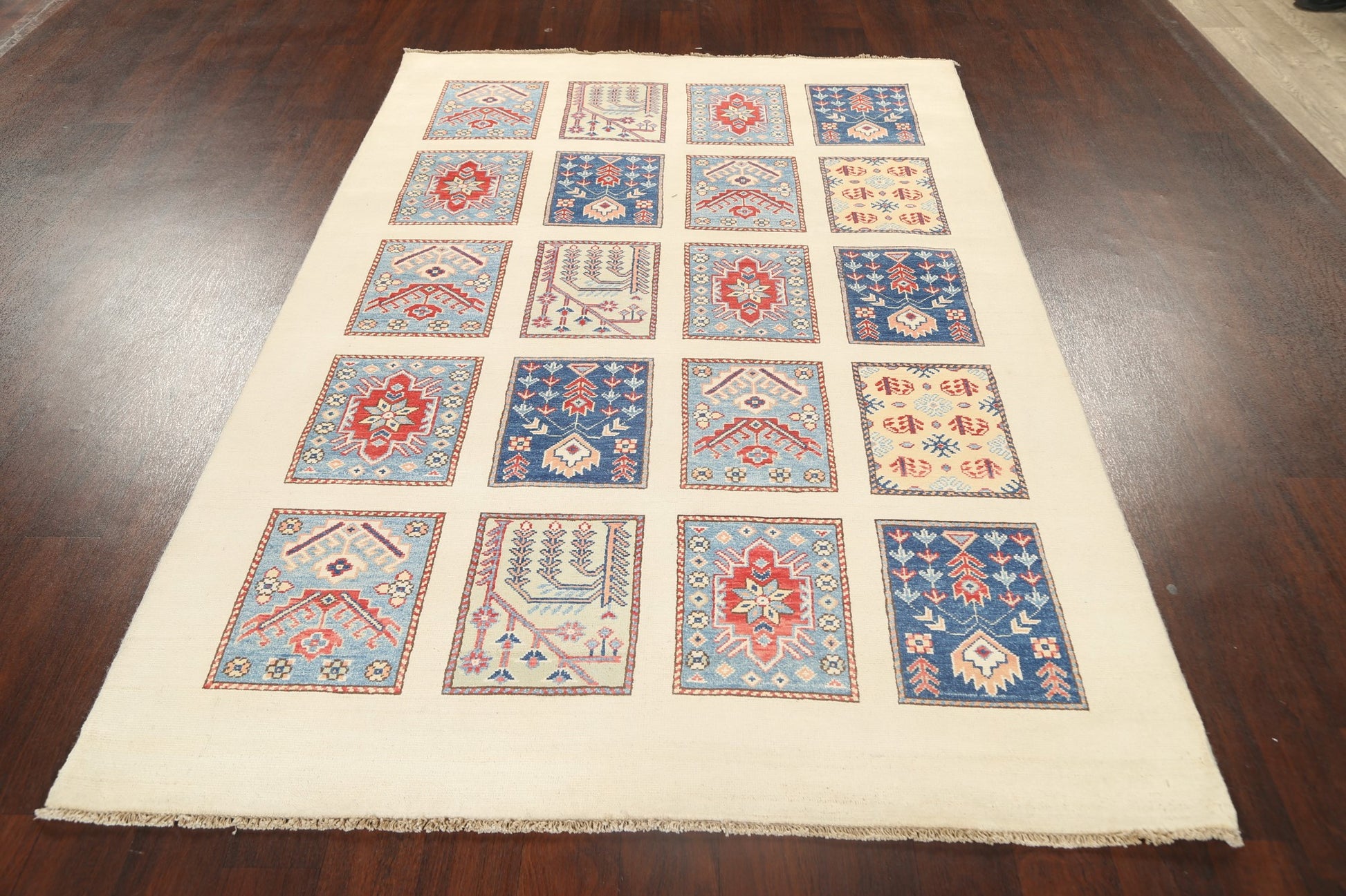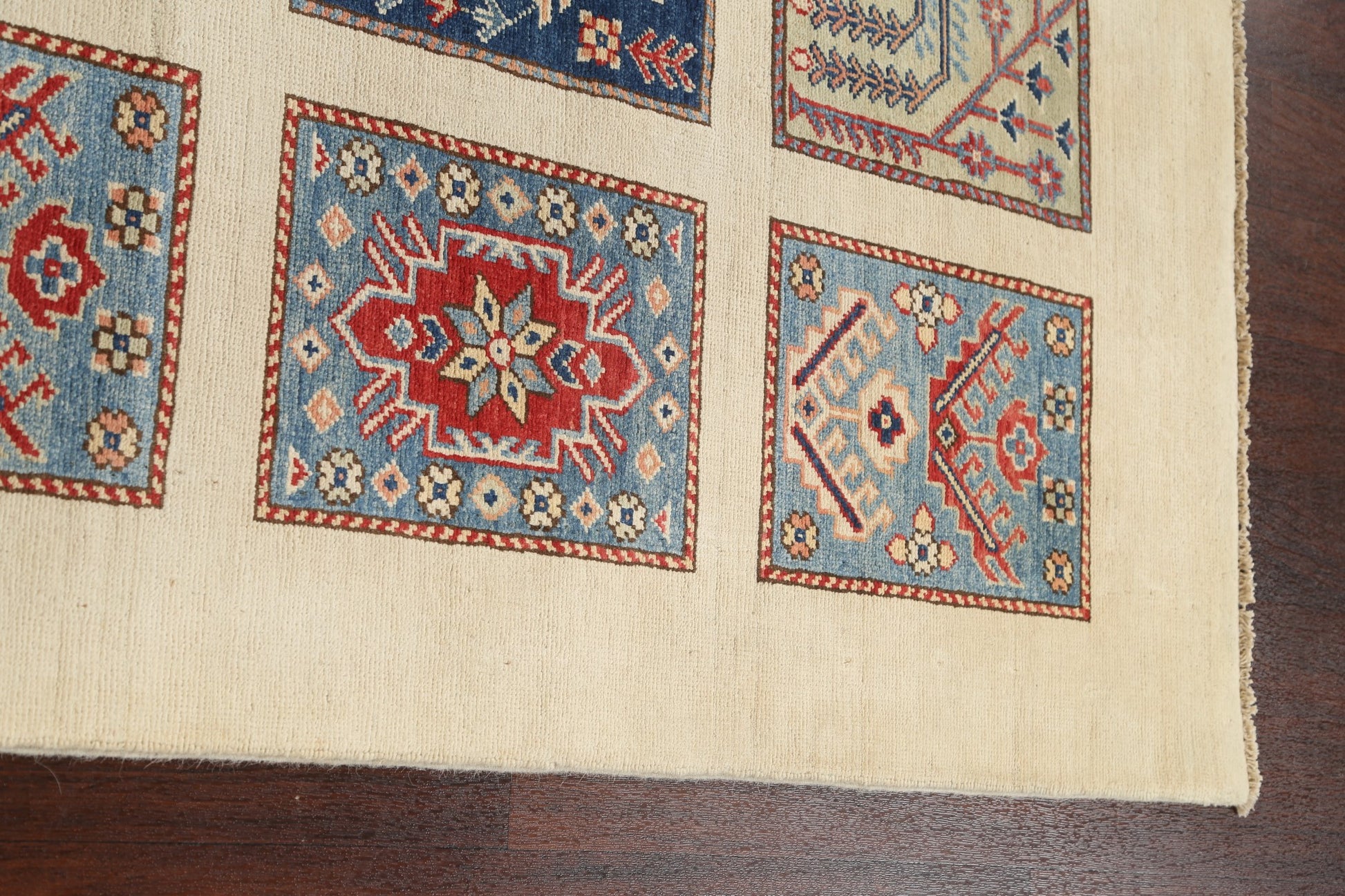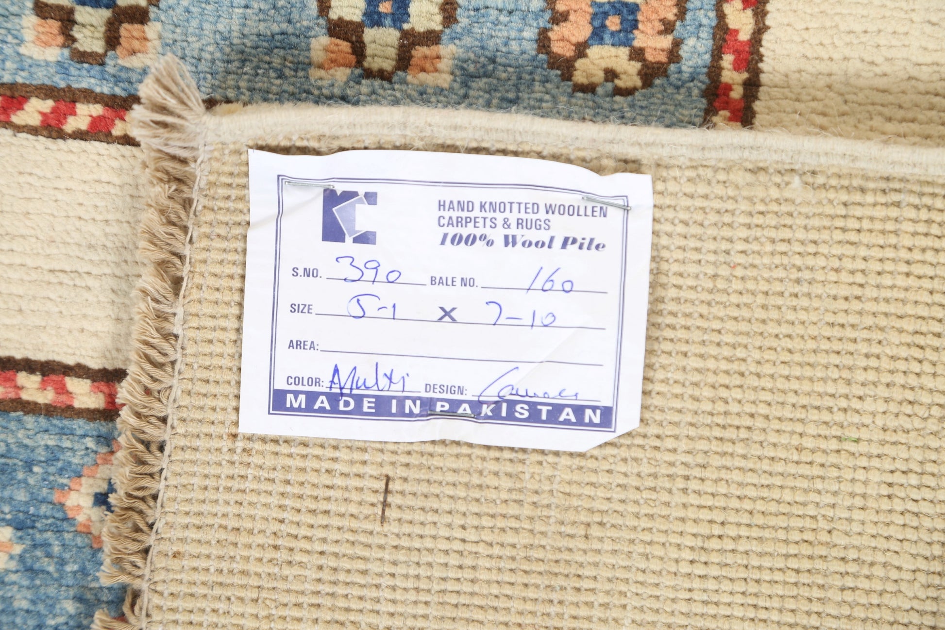 A Beautiful Genuine Pakistan Kazak rug is Hand Knotted by skillful weavers in Pakistan with 100% Wool Material. This rug is in New, First Quality condition. dimensions are 7' 10'' X 5' 1'' in foot and 239 X 155 in centimeter. the primary color is Beige & Ivories.