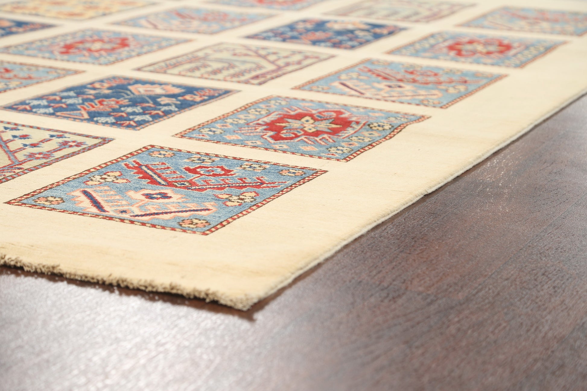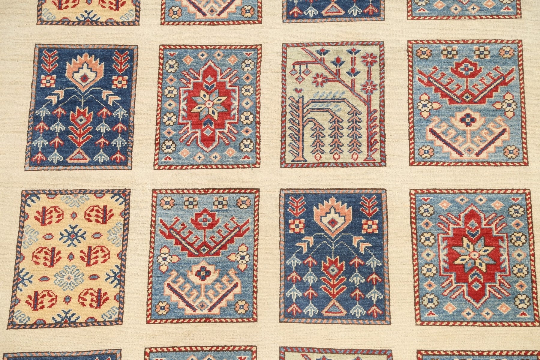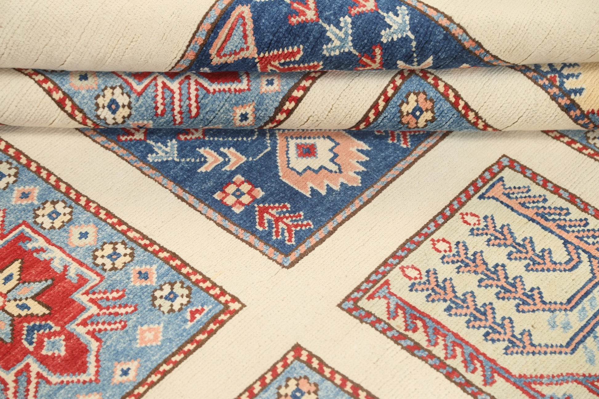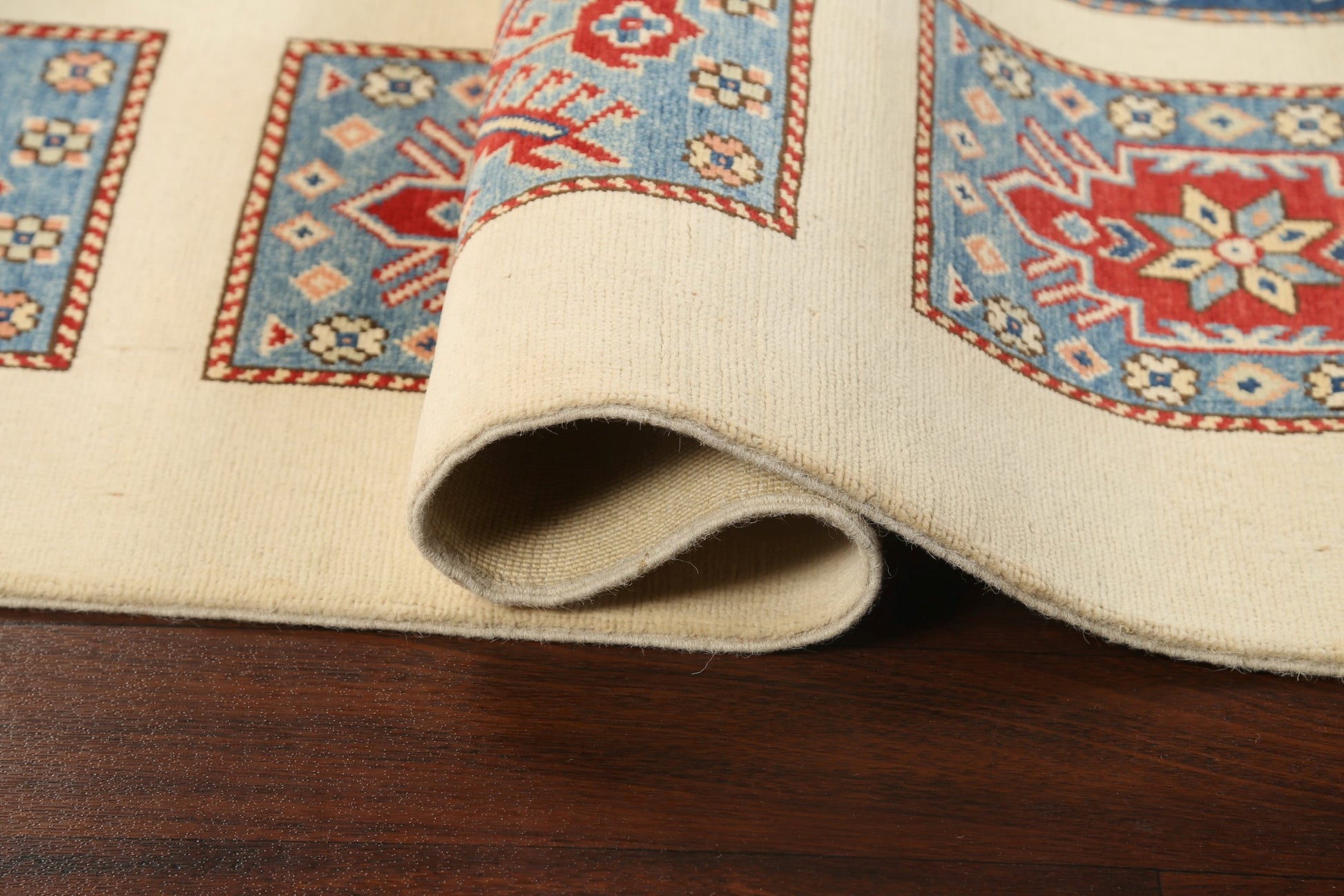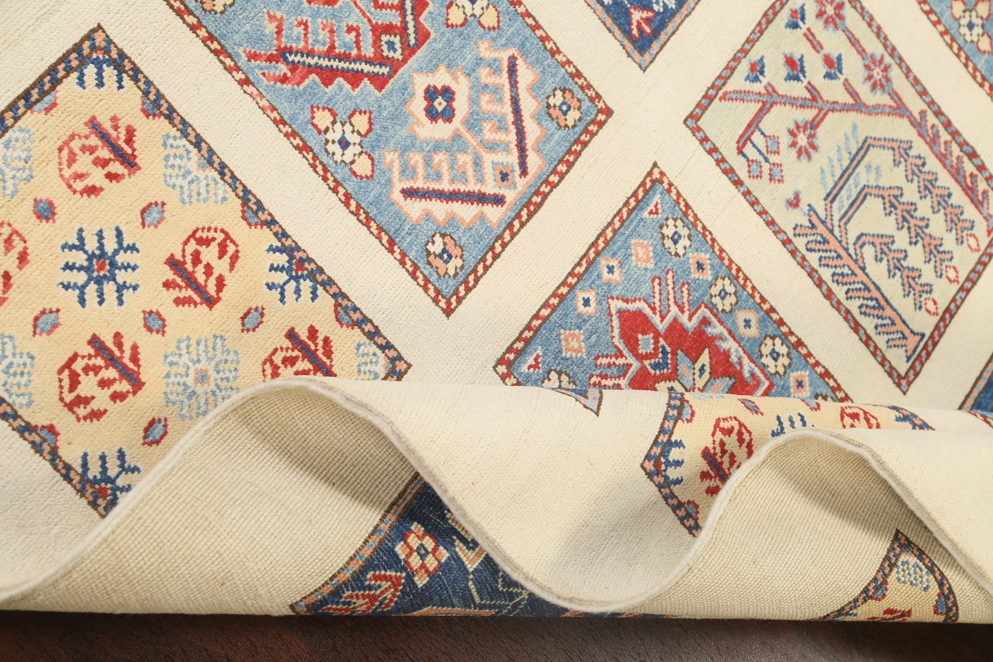 A Beautiful Genuine Pakistan Kazak rug is Hand Knotted by skillful weavers in Pakistan with 100% Wool Material. This rug is in New, First Quality condition. dimensions are 7' 10'' X 5' 1'' in foot and 239 X 155 in centimeter. the primary color is Beige & Ivories.