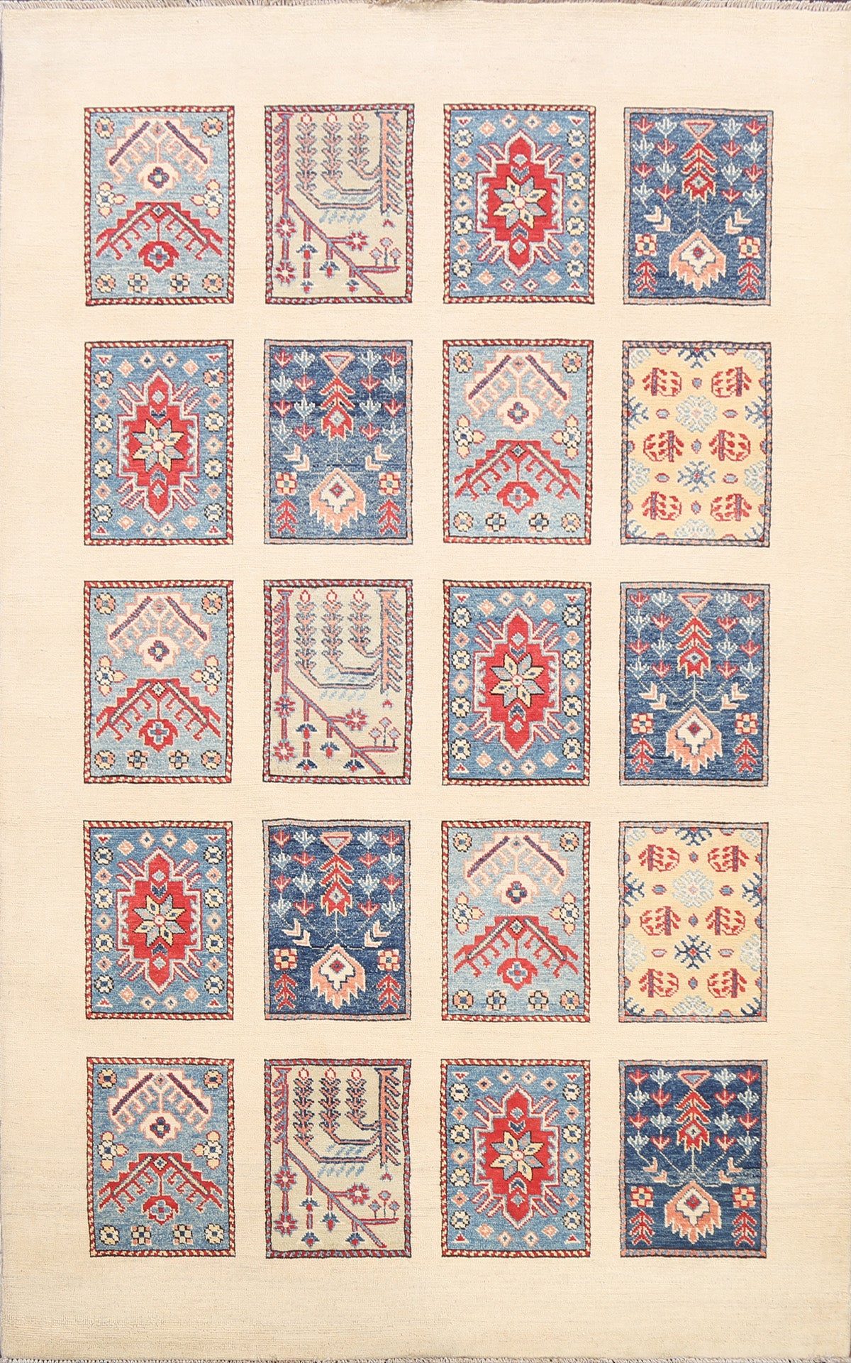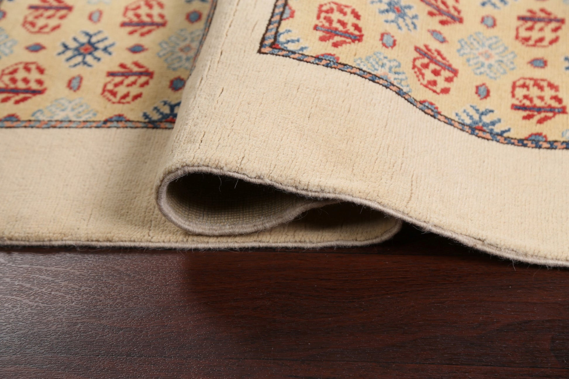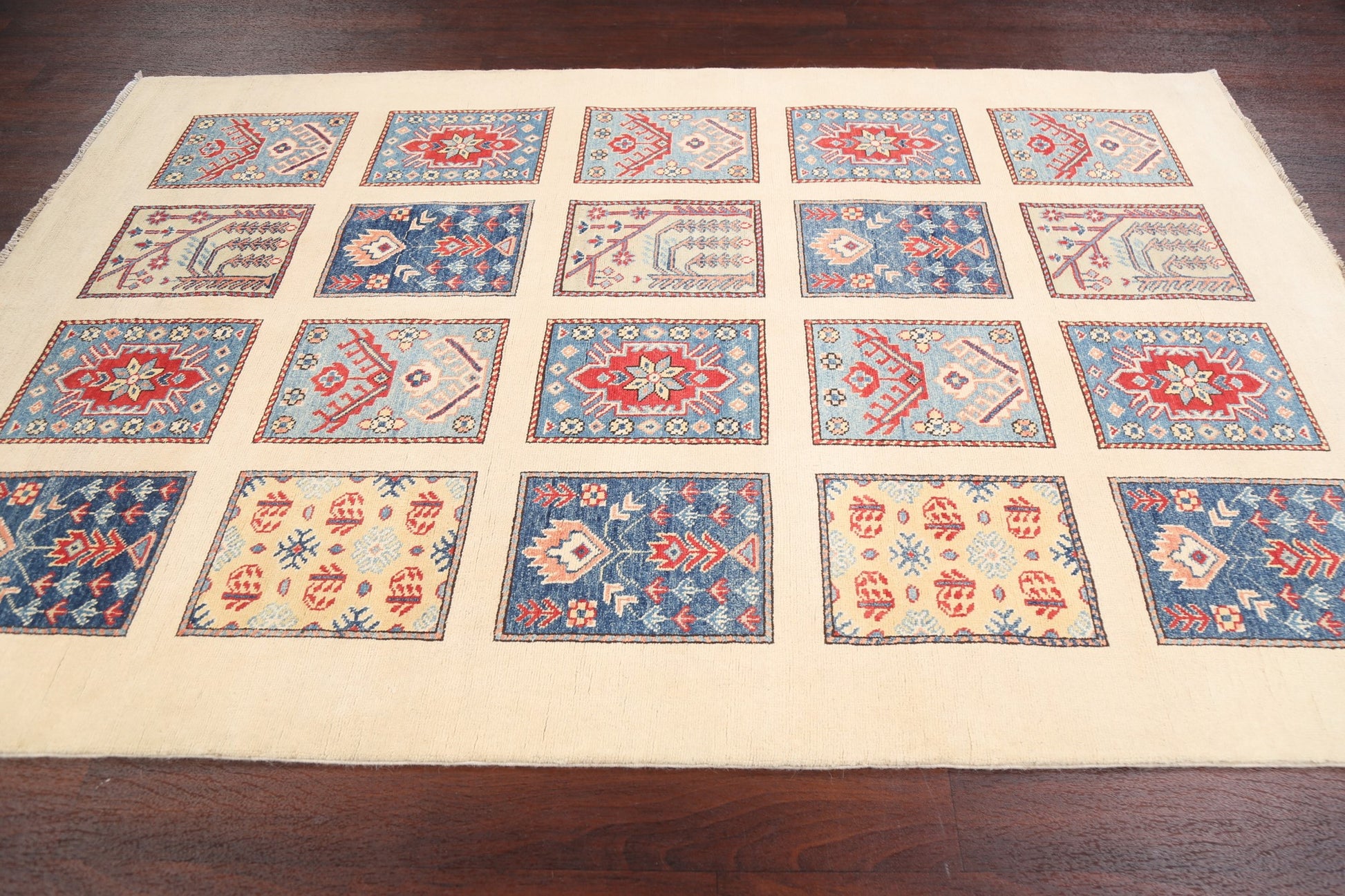 A Beautiful Genuine Pakistan Kazak rug is Hand Knotted by skillful weavers in Pakistan with 100% Wool Material. This rug is in New, First Quality condition. dimensions are 7' 8'' X 5' 1'' in foot and 234 X 155 in centimeter. the primary color is Beige & Ivories.