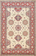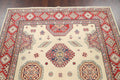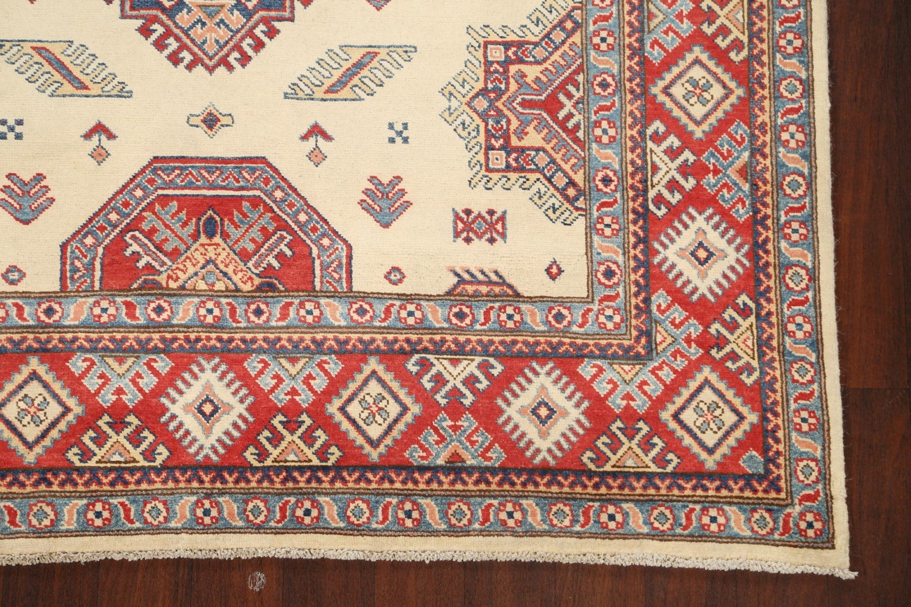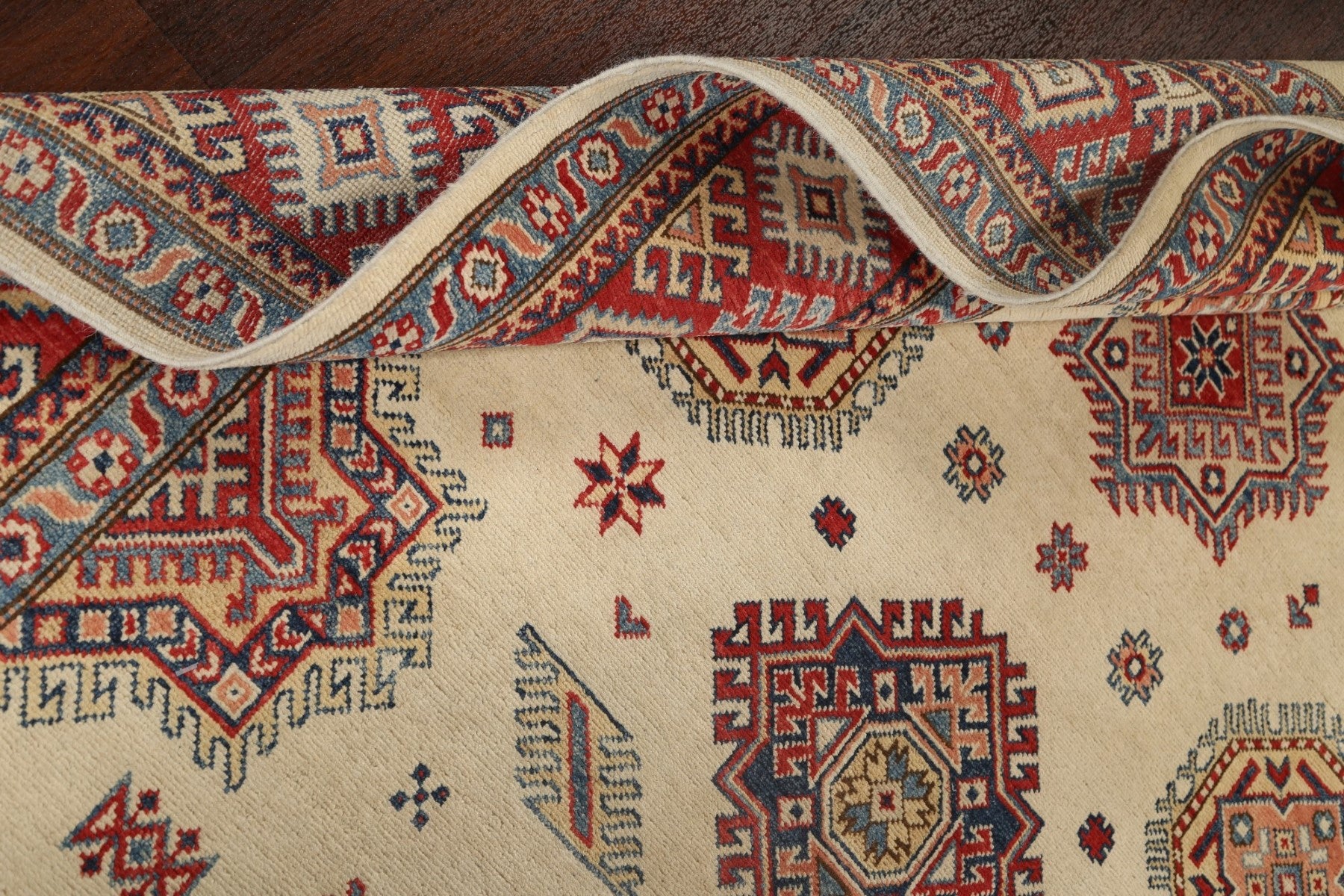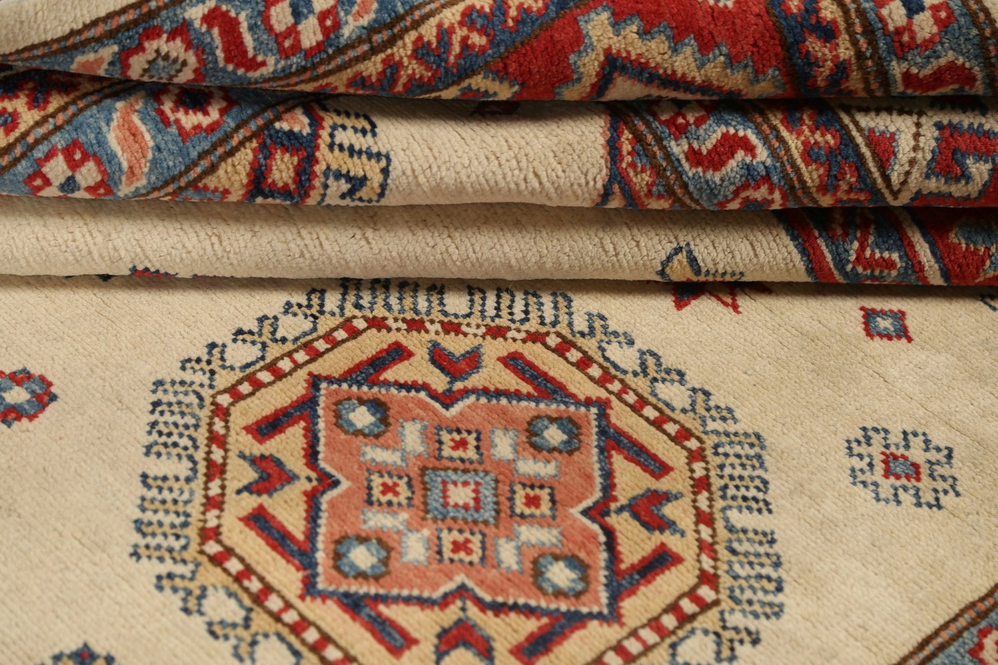 A Beautiful Genuine Pakistan Kazak rug is Hand Knotted by skillful weavers in Pakistan with 100% Wool Material. This rug is in New, First Quality condition. dimensions are 9' 0'' X 6' 0'' in foot and 274 X 183 in centimeter. the primary color is Beige & Ivories.