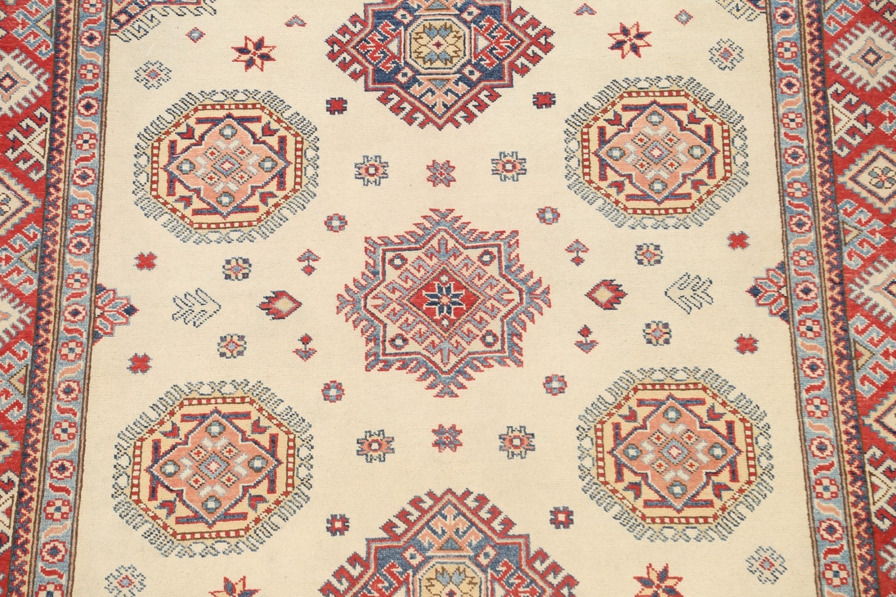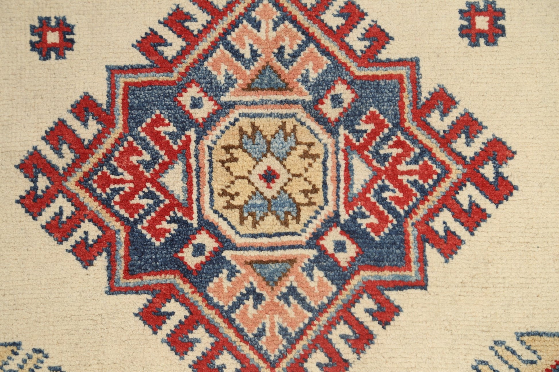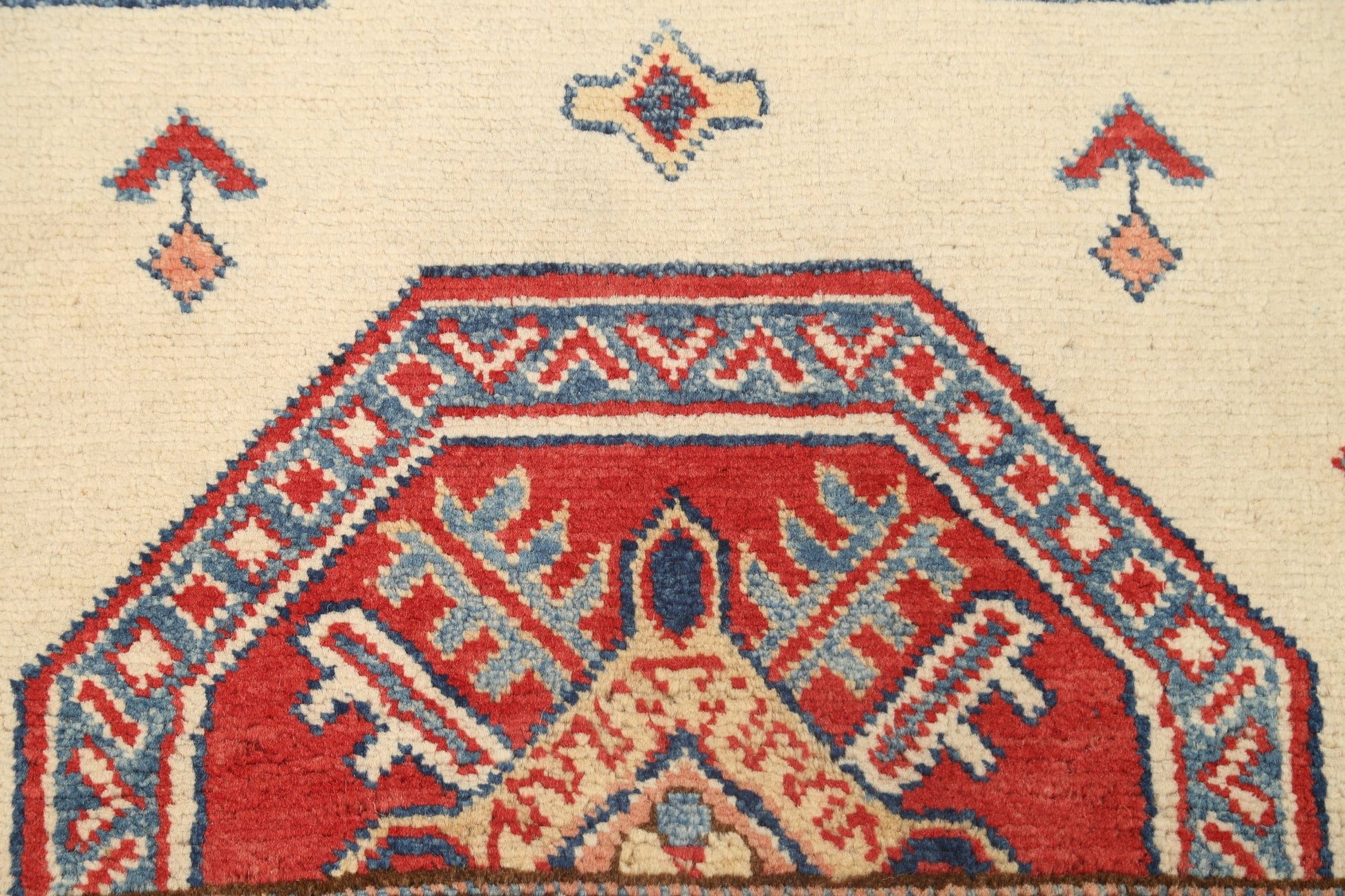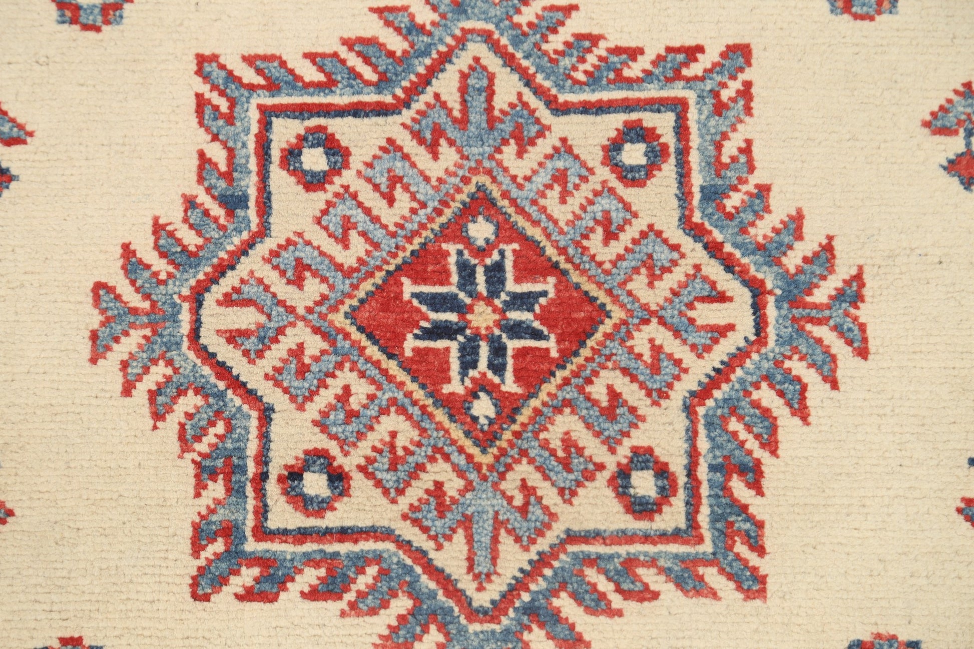 A Beautiful Genuine Pakistan Kazak rug is Hand Knotted by skillful weavers in Pakistan with 100% Wool Material. This rug is in New, First Quality condition. dimensions are 9' 0'' X 6' 0'' in foot and 274 X 183 in centimeter. the primary color is Beige & Ivories.