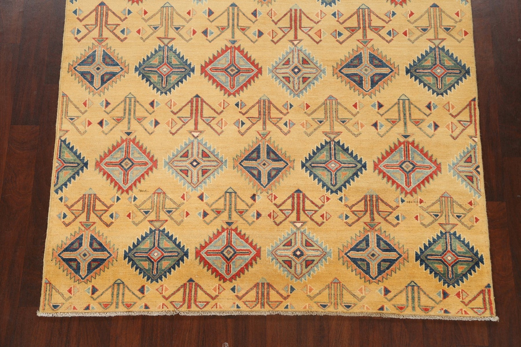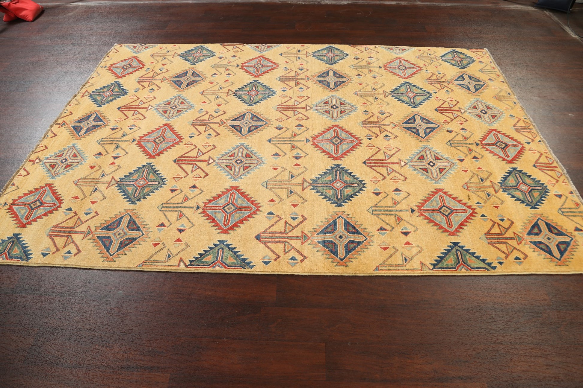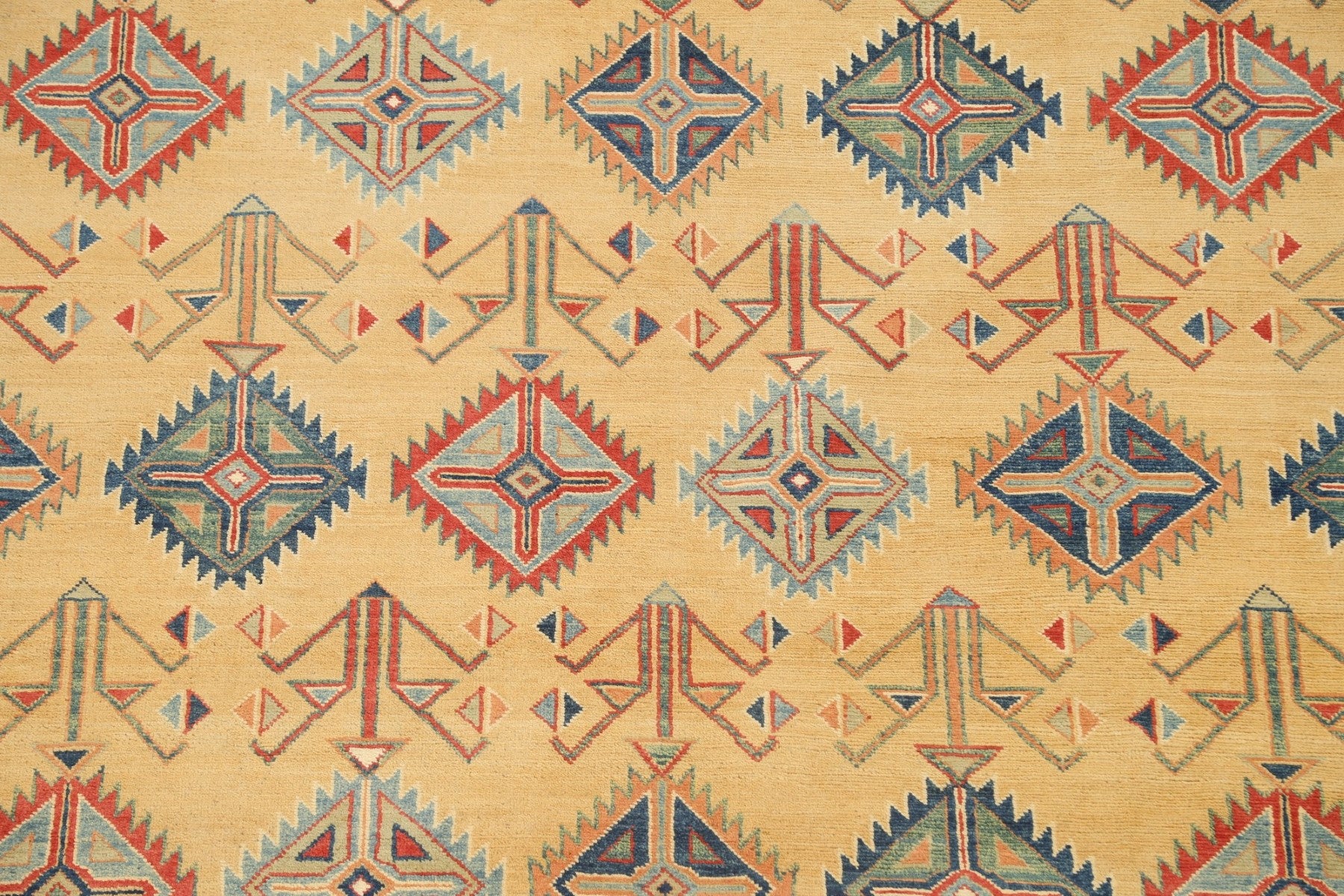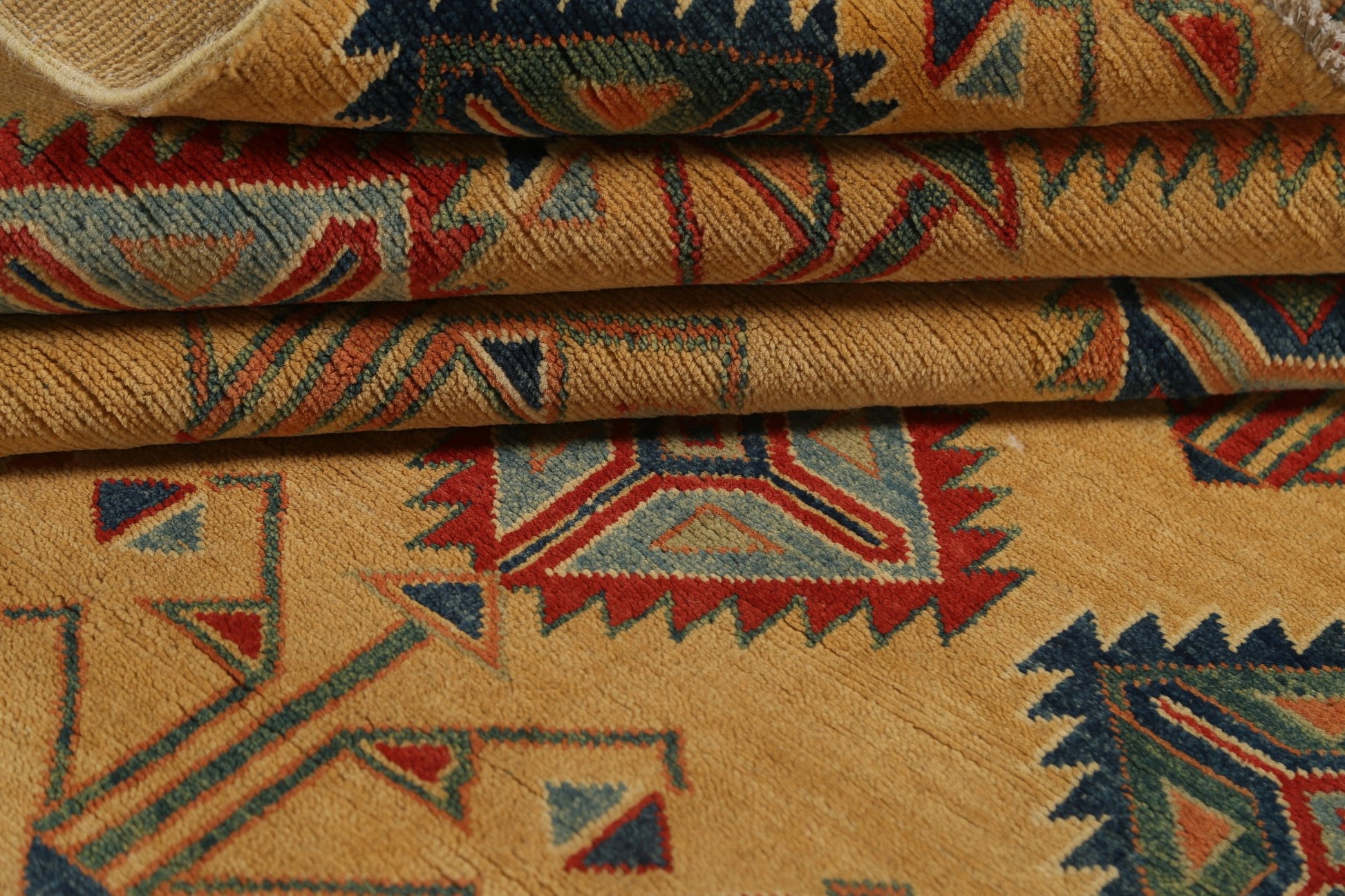 A Beautiful Genuine Pakistan Kazak rug is Hand Knotted by skillful weavers in Pakistan with 100% Wool Material. This rug is in New, First Quality condition. dimensions are 8' 7'' X 6' 1'' in foot and 262 X 185 in centimeter. the primary color is Yellow & Gold.